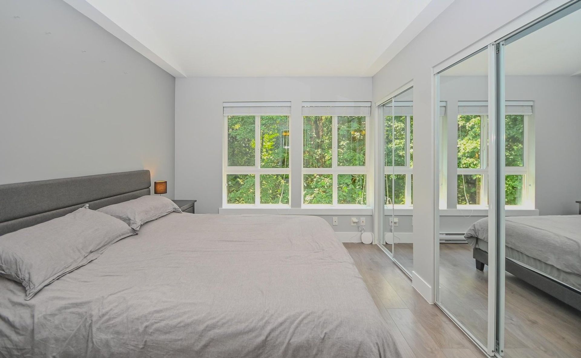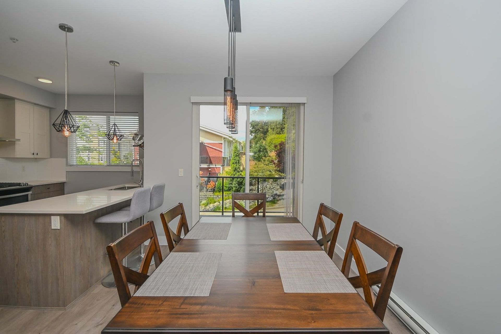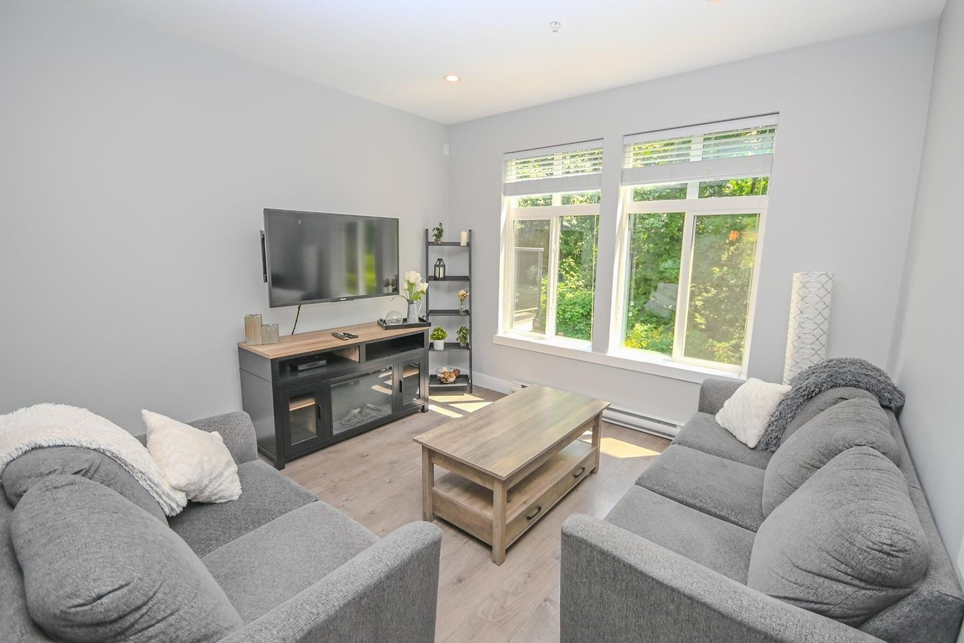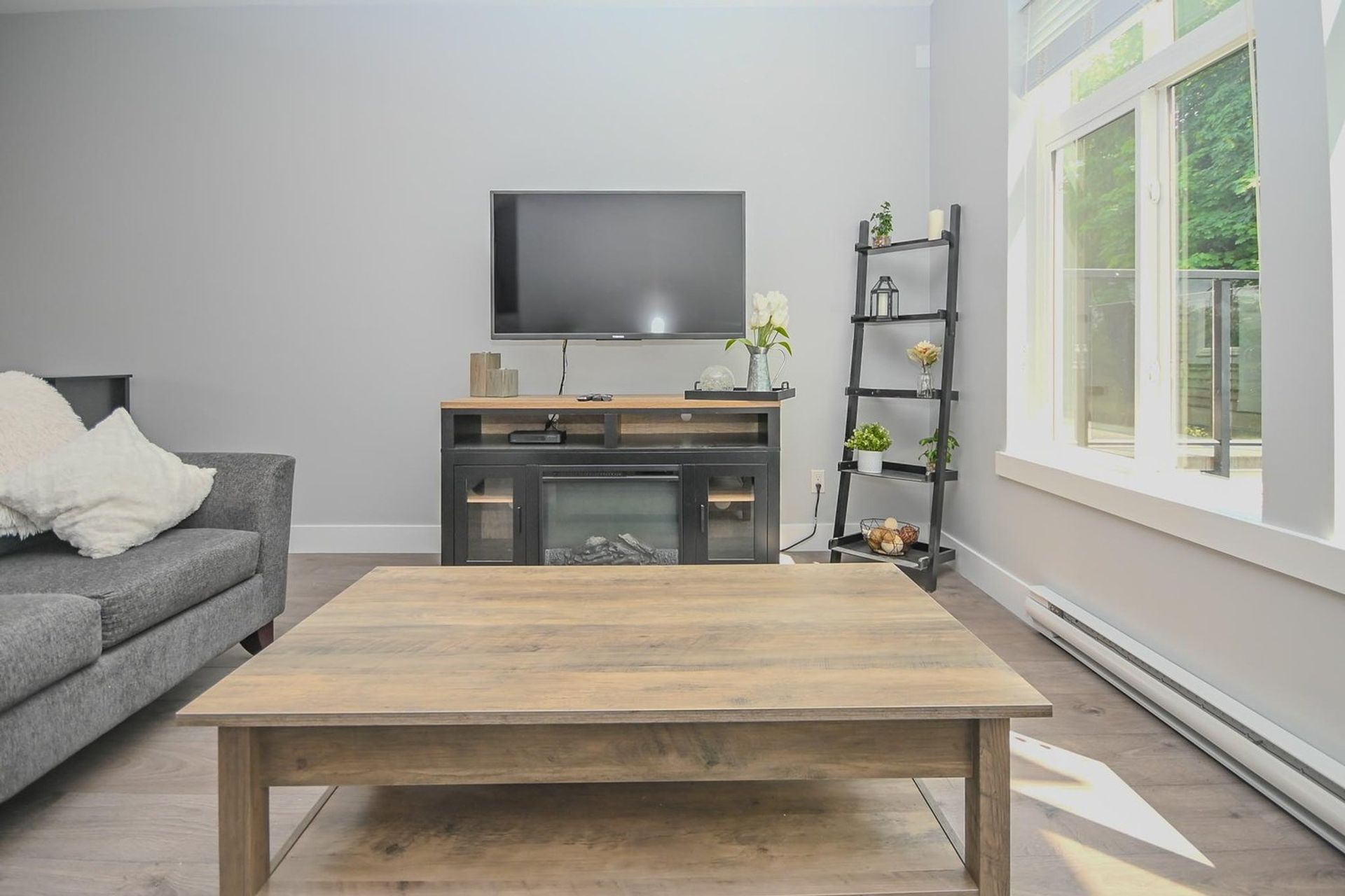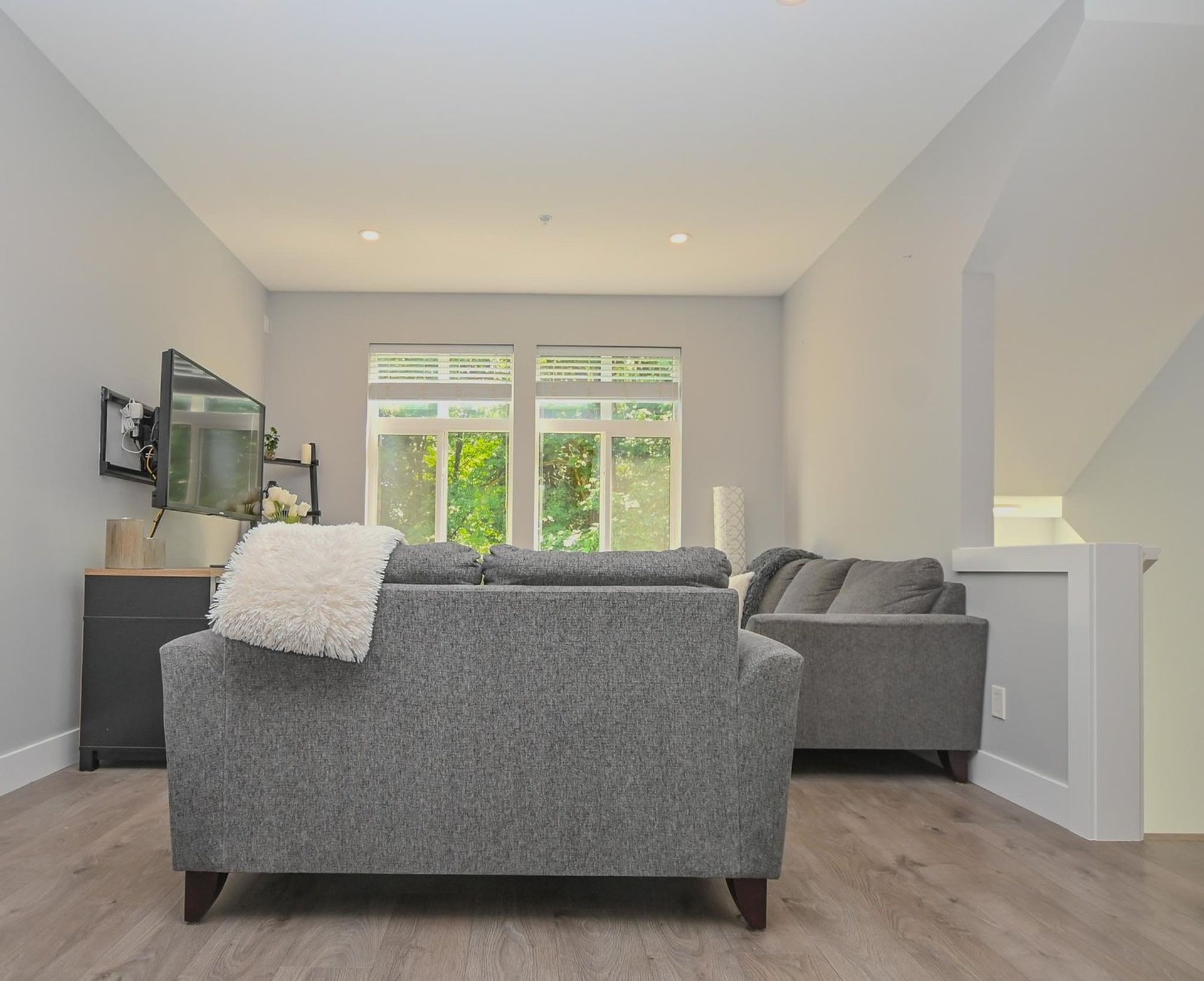 The dining room is spacious enough for a full formal setup under a modern light rod chandelier and there is a sliding glass door leading to a sizable front deck. With the layout of the complex the partially covered deck is away from the eyes of neighbours and comes with a gas connection and a hose bib for summer herb/flower enthusiasts. The dining room is open to the living room which is set up to be flush with natural light from two large windows accentuating the tranquil greenbelt. This view is present in every room on the back of the home.