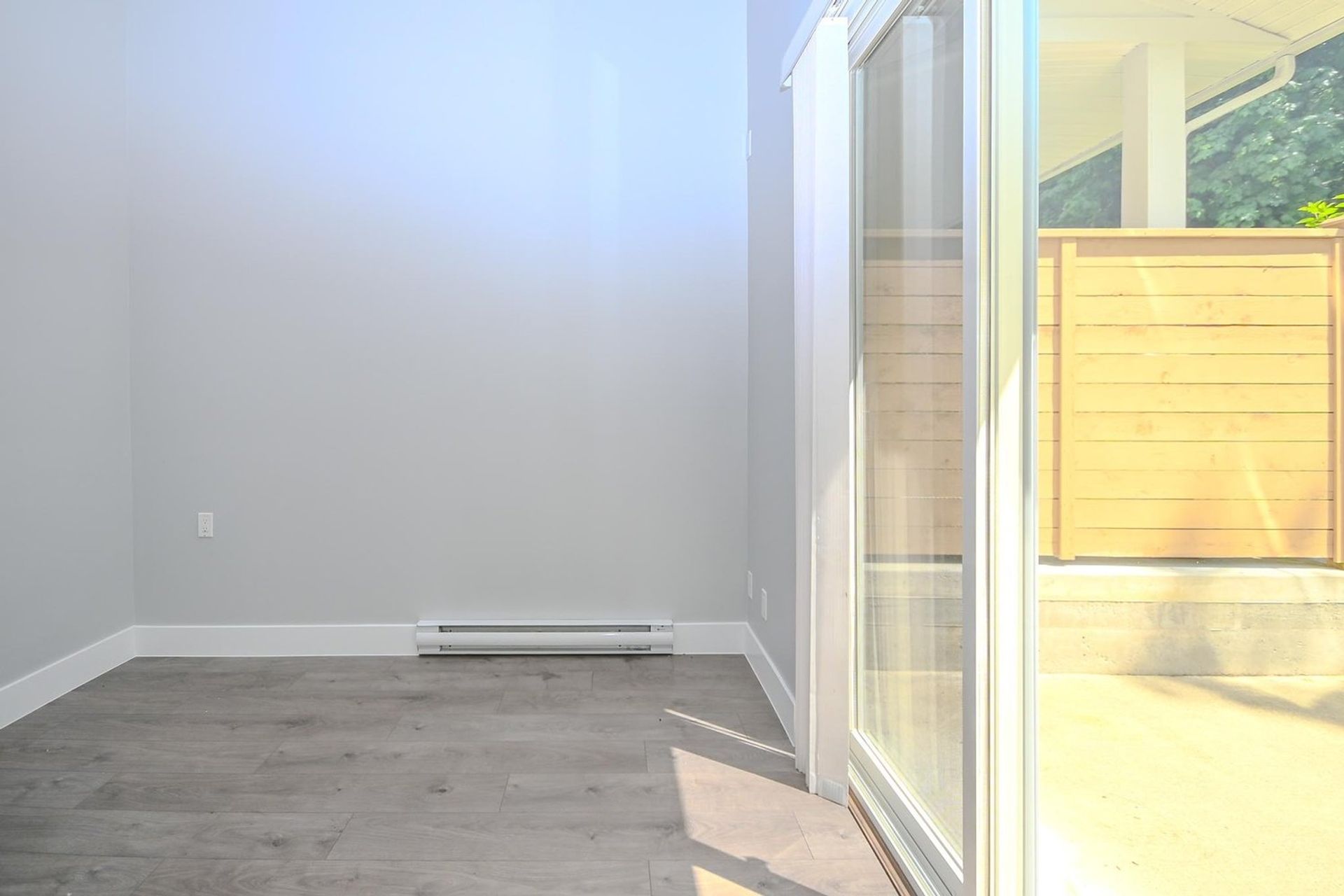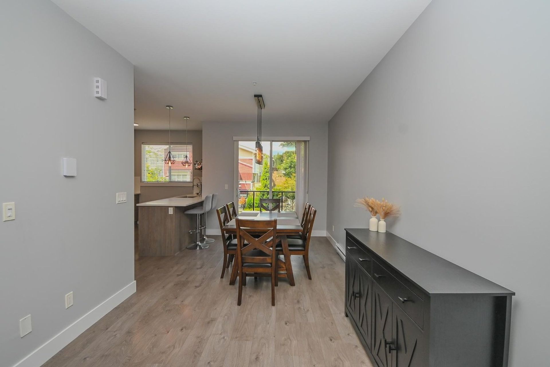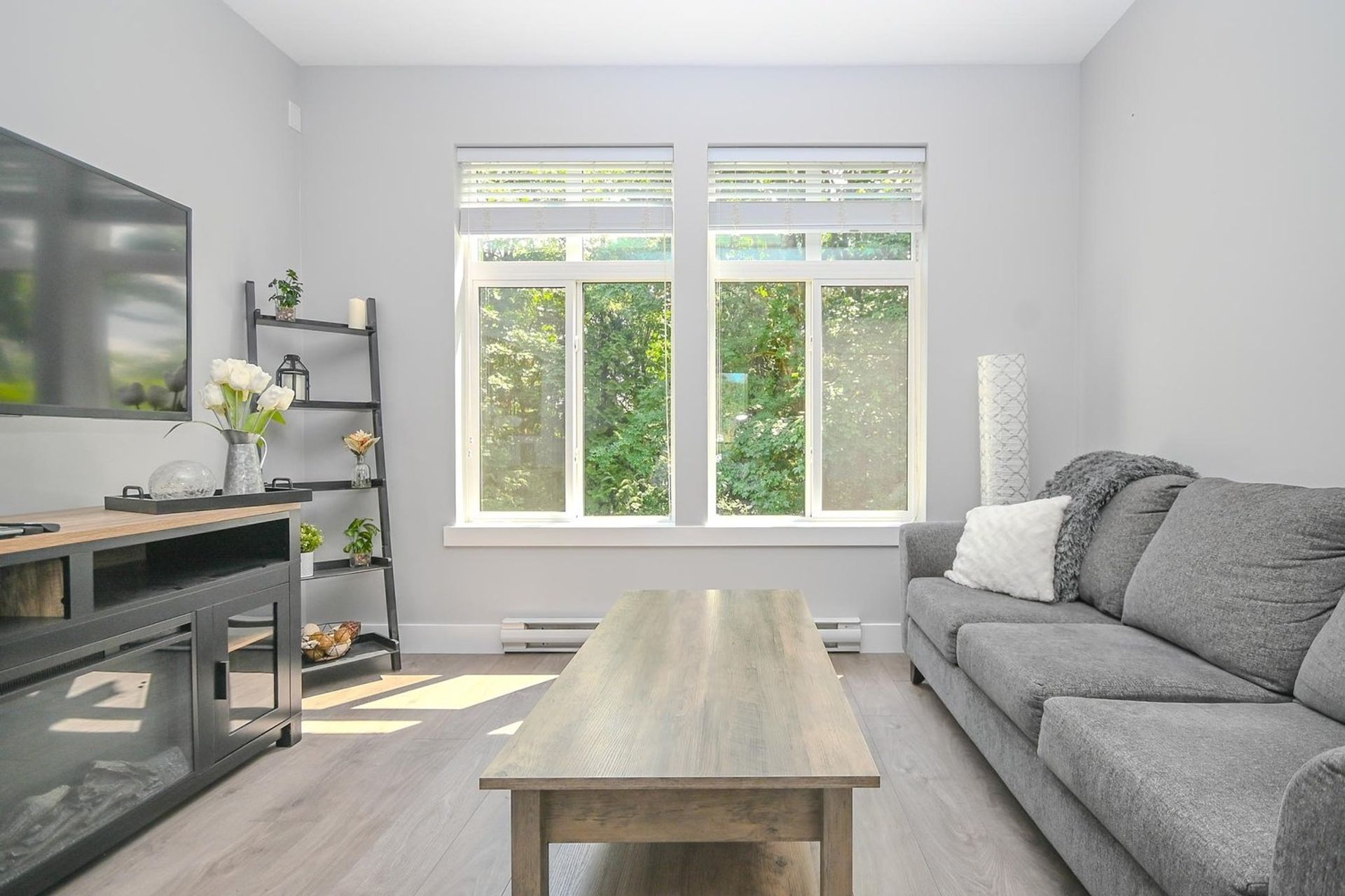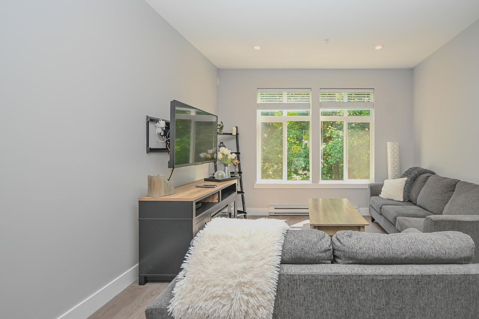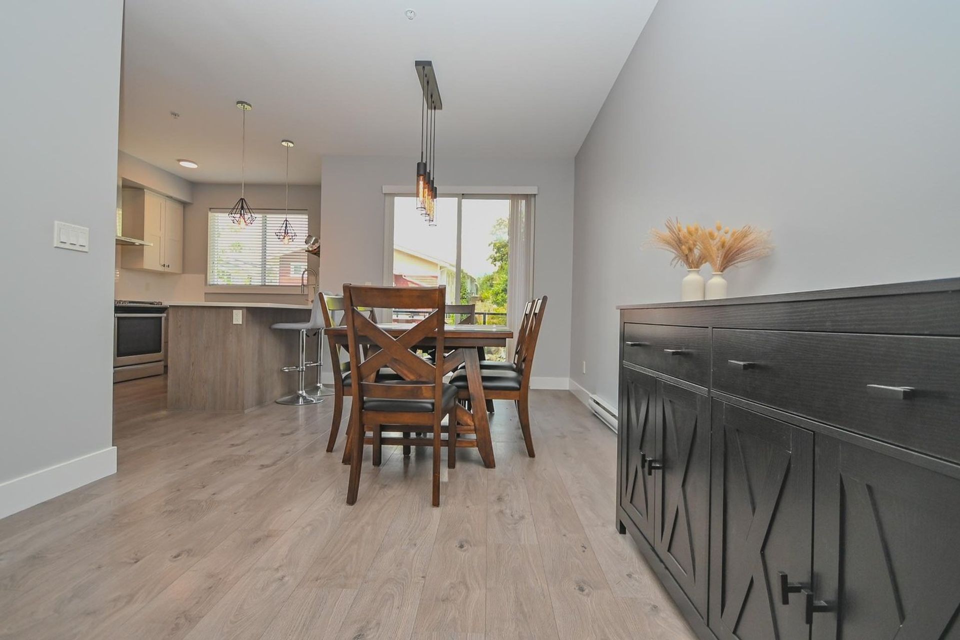 The dining room is spacious enough for a full formal setup under a modern light rod chandelier and there is a sliding glass door leading to a sizable front deck. With the layout of the complex the partially covered deck is away from the eyes of neighbours and comes with a gas connection and a hose bib for summer herb/flower enthusiasts. The dining room is open to the living room which is set up to be flush with natural light from two large windows accentuating the tranquil greenbelt. This view is present in every room on the back of the home.