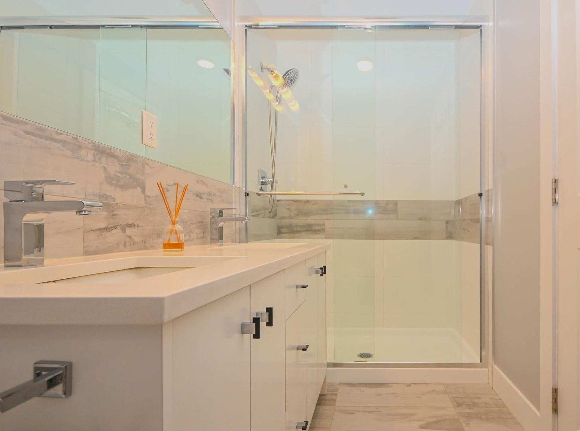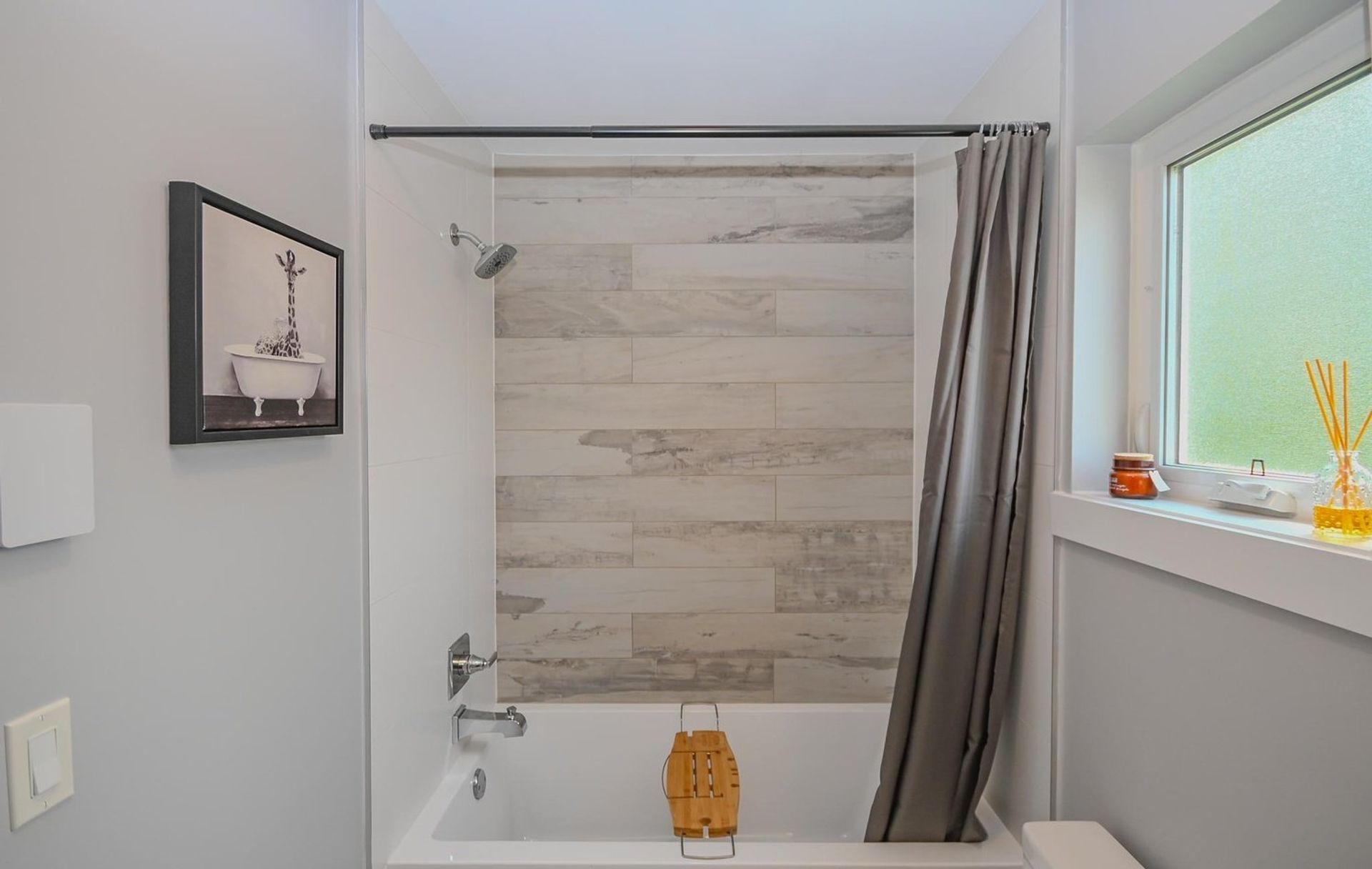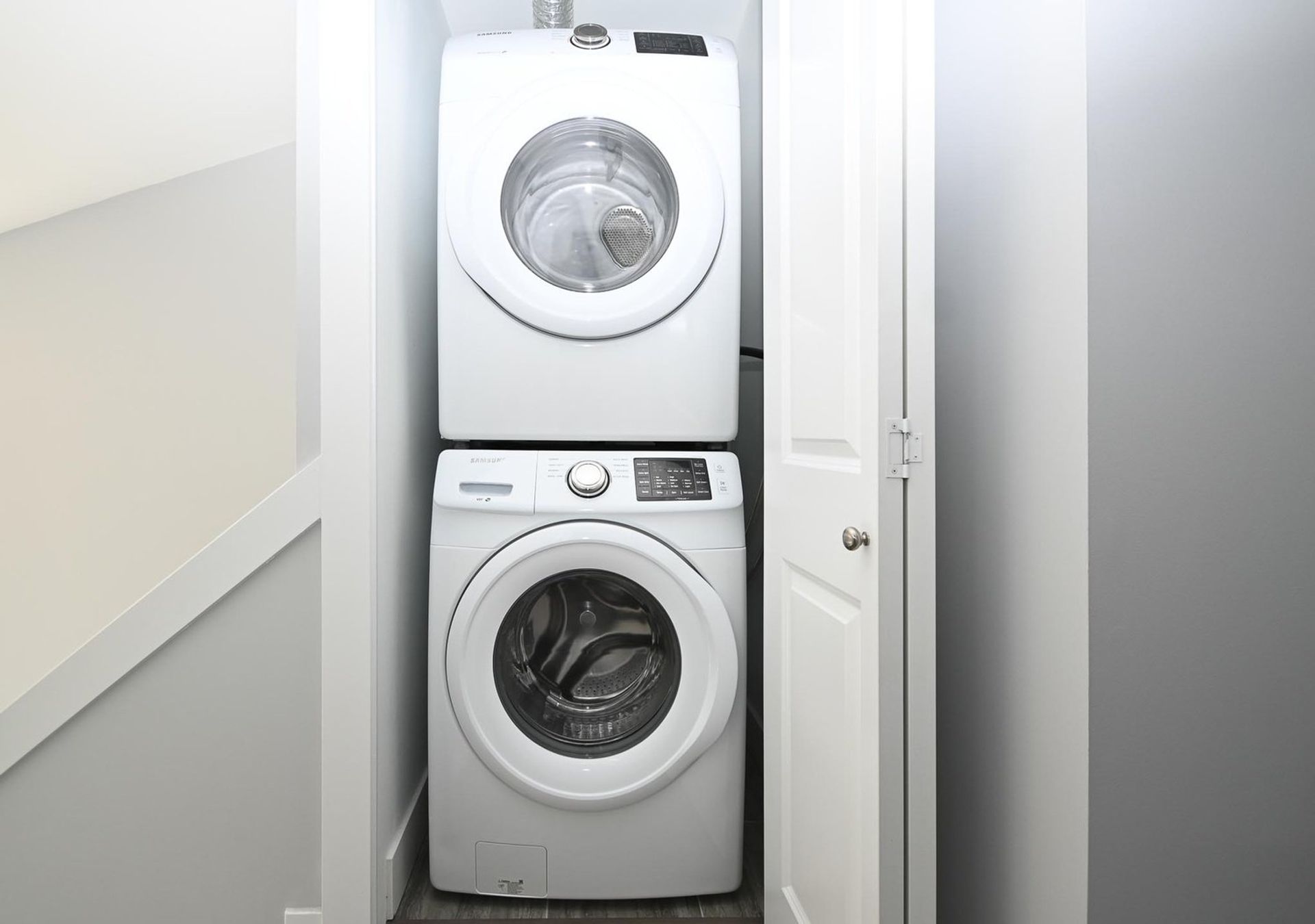 Upstairs there are three bedrooms and two bathrooms. The primary bedroom is substantial, and vaulted ceilings create an even greater sense of space; it comes with a closet spanning the full length of room & ensuite with a walk-in shower, two sinks, and quartz counters and subway tiling with accents. The main bathroom is a four-piece with a deep soaker tub featuring a full accent wall. A full size stacked Samsung washer/dryer completes the upper level.