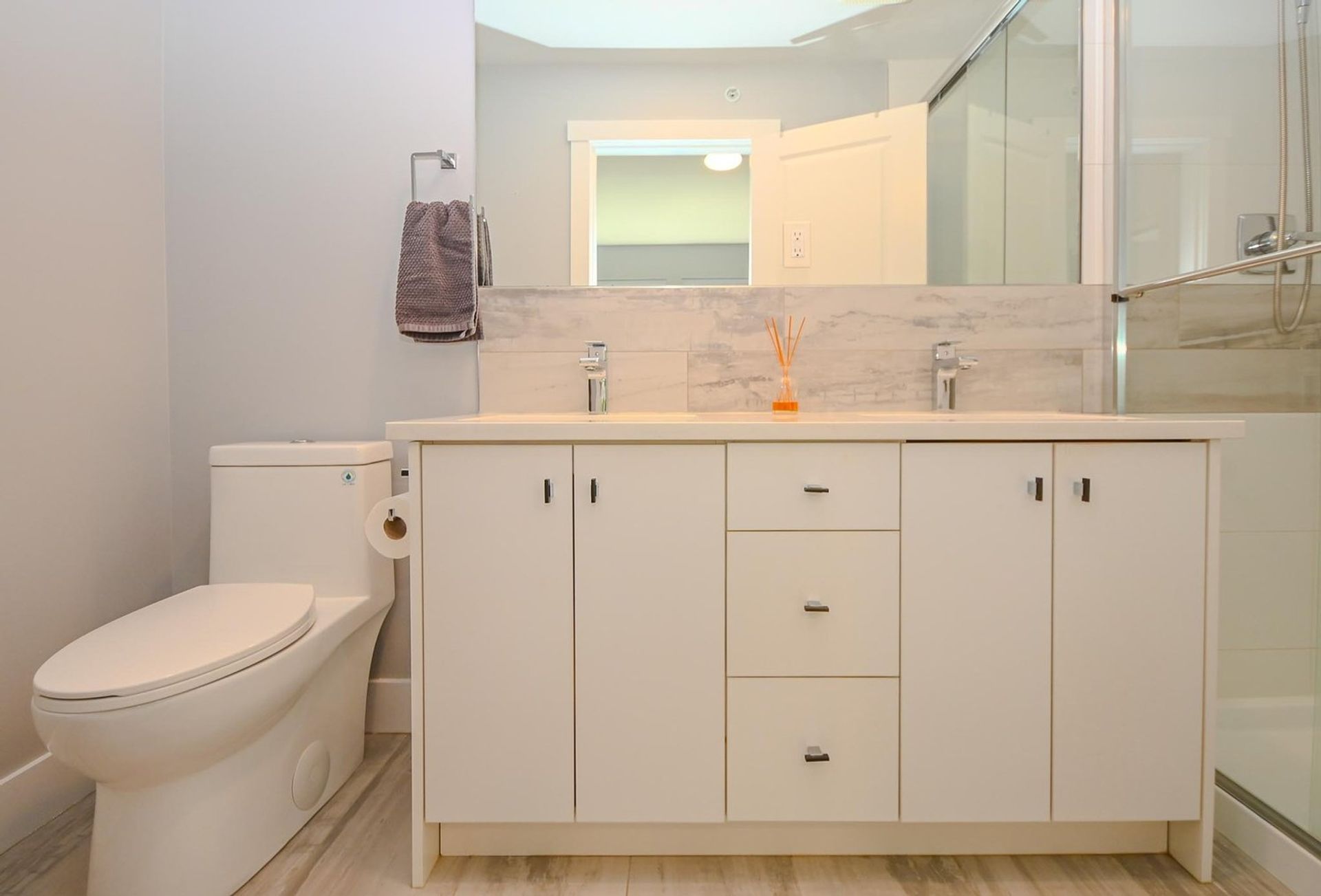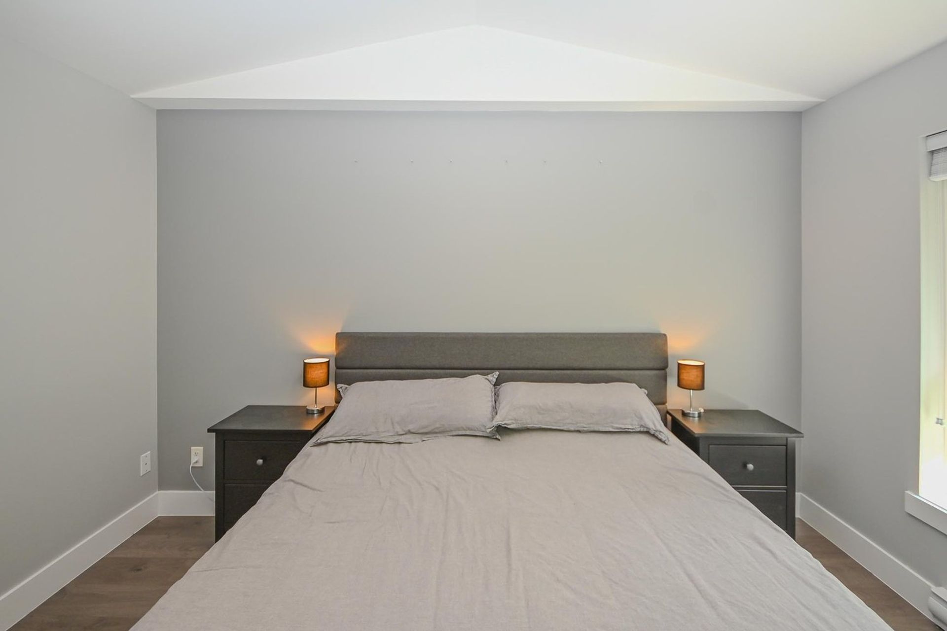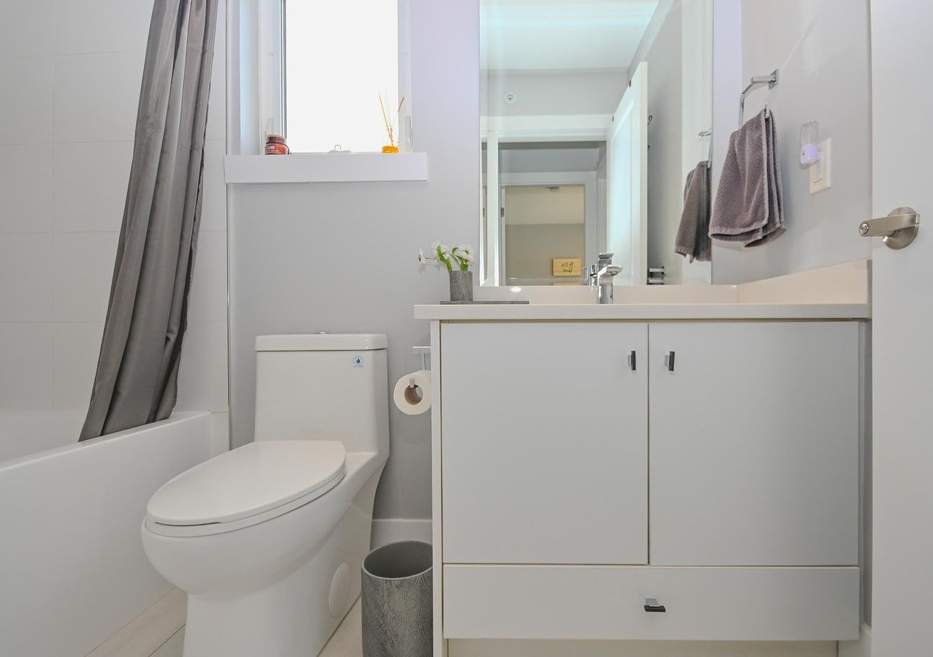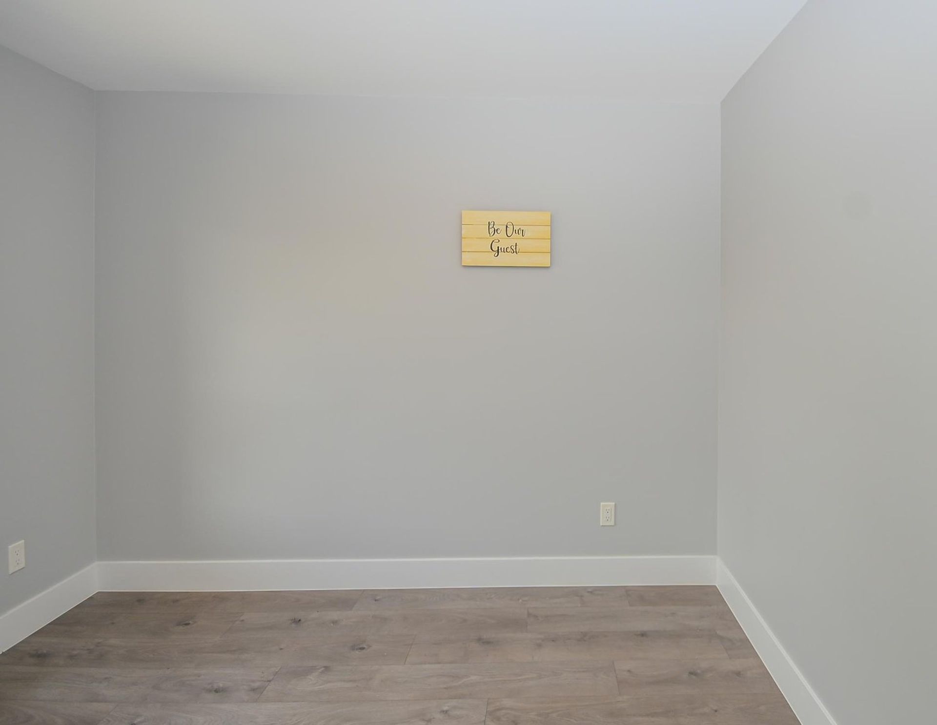 Upstairs there are three bedrooms and two bathrooms. The primary bedroom is substantial, and vaulted ceilings create an even greater sense of space; it comes with a closet spanning the full length of room & ensuite with a walk-in shower, two sinks, and quartz counters and subway tiling with accents. The main bathroom is a four-piece with a deep soaker tub featuring a full accent wall. A full size stacked Samsung washer/dryer completes the upper level.
