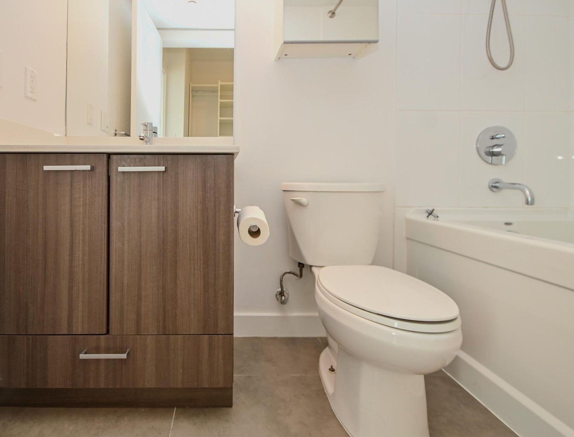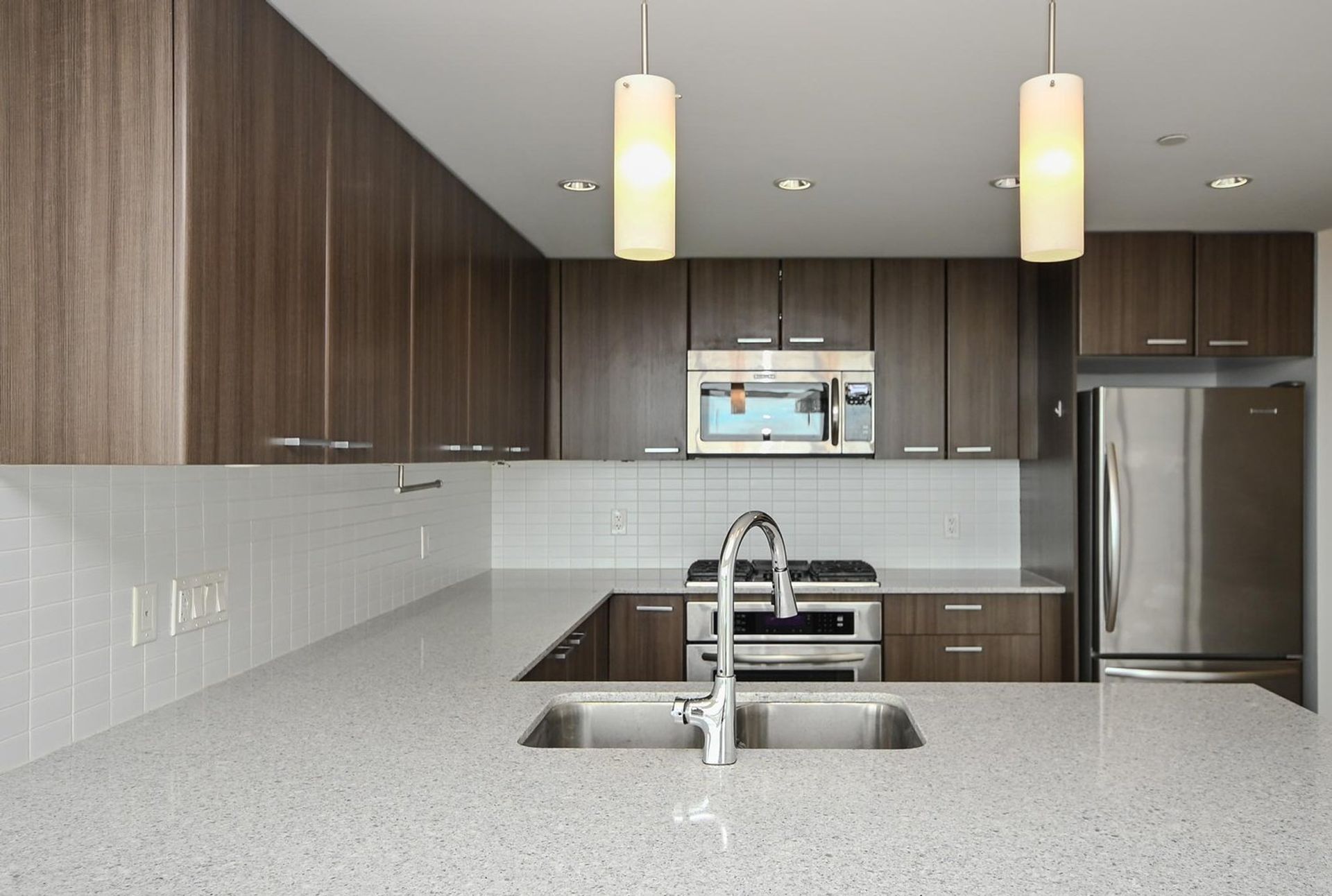 The tower itself is only thirteen years old, meaning all the finishes in the unit are modern and premium. The kitchen includes all stainless-steel appliances, a gas range, and a built-in microwave. Additional features include granite counters, a tiled backsplash, a four-person eating bar, pot lights, and soft-close cabinetry—complete with a base corner Lazy Susan. Both the dining and living rooms are designed to showcase the view, with full-length windows spanning the open-concept living area. There’s more than enough room for a full dining setup and a large couch, and the living room opens onto the home’s main deck through a sliding glass door.