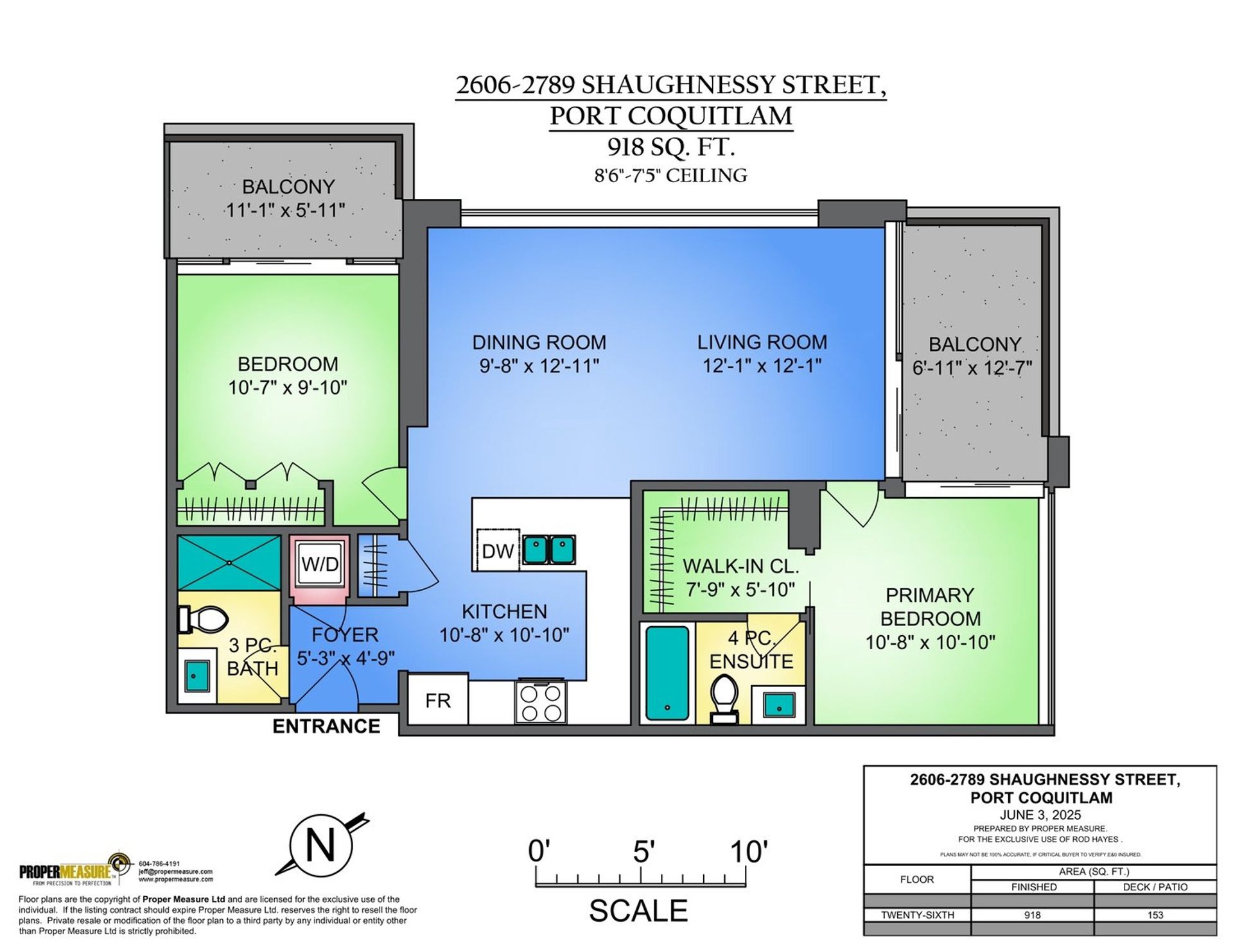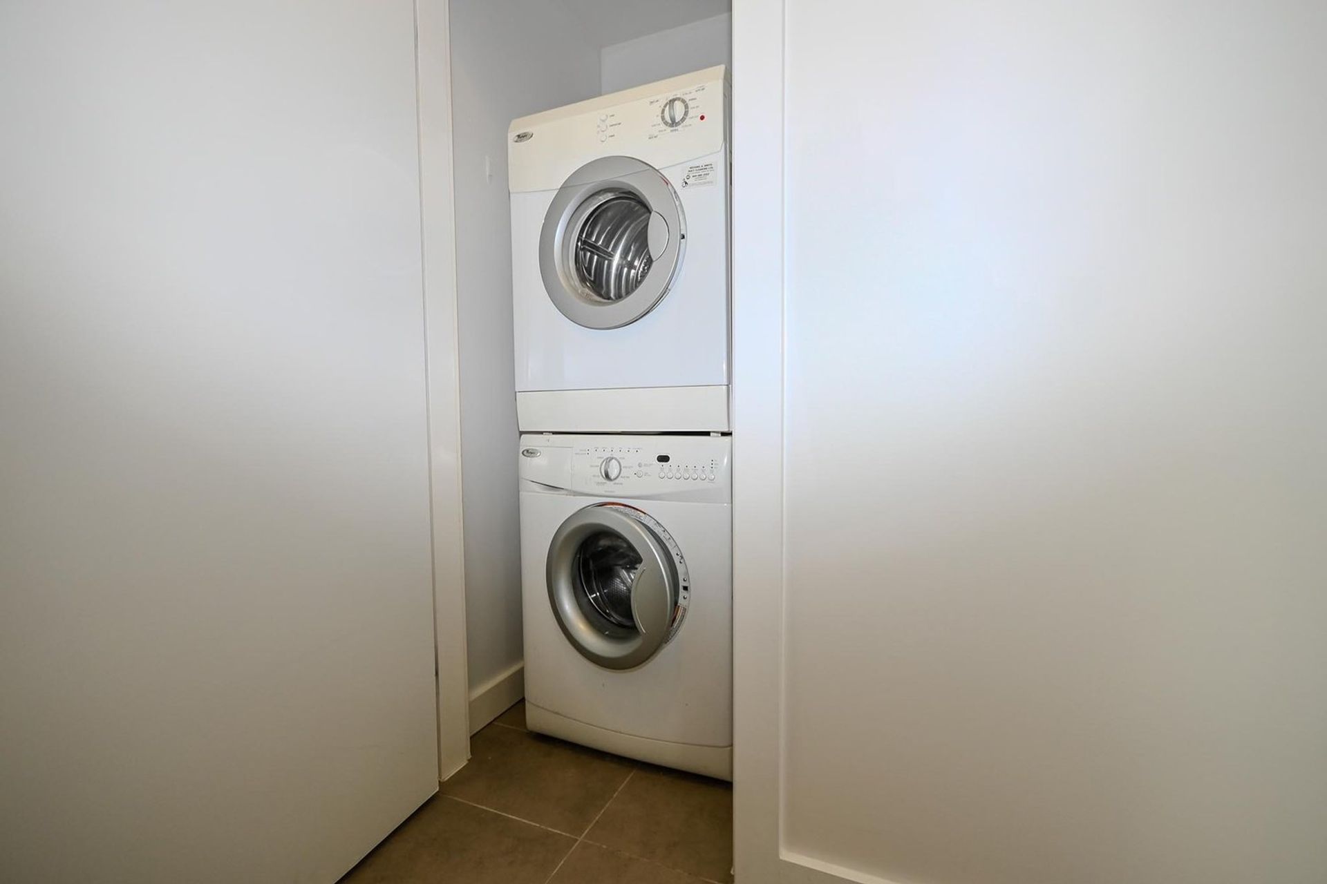 The second bedroom is located on the opposite side of the main living area, providing separation from the primary suite—ideal for kids, guests, or a home office. This room enjoys its own sizeable, partially covered private deck. The home is completed with a stacked washer/dryer and a primary three-piece bathroom with a walk-in shower and additional storage.