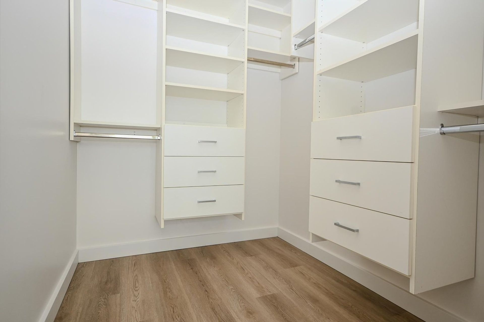 The primary bedroom is a retreat unto itself, featuring a large walk-in closet with custom built-in organizers maximising function and a four-piece ensuite with a deep soaker tub, quartz counters, and subway tiling. It also includes separate, private, access to the main deck.