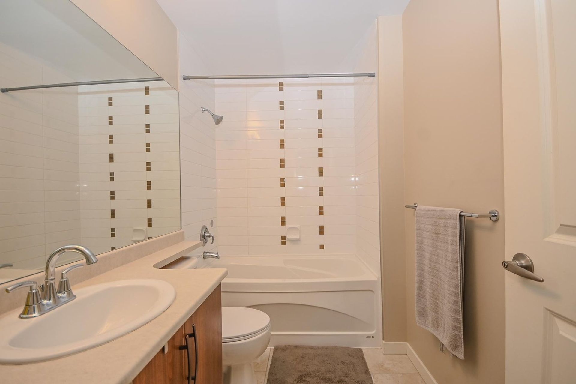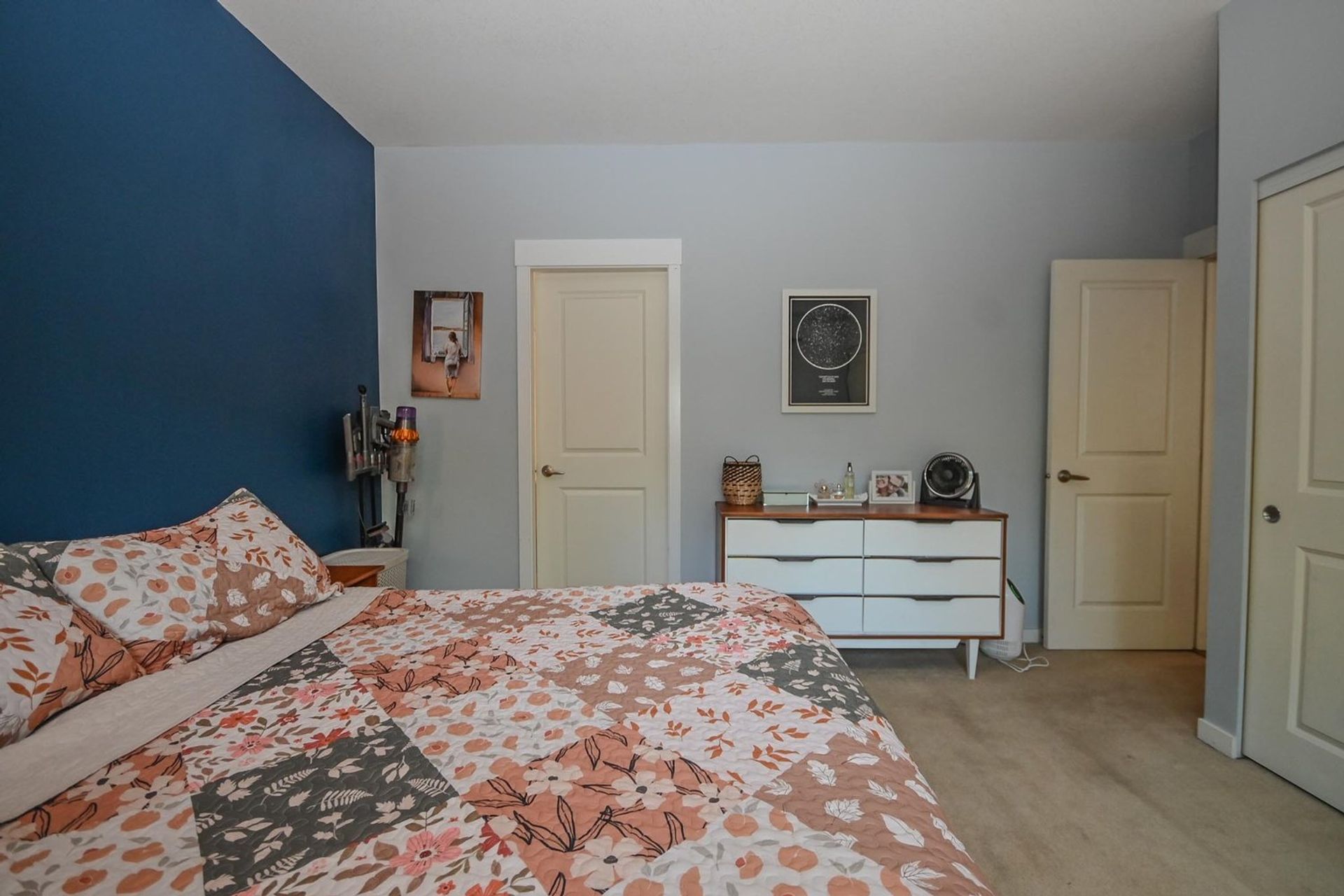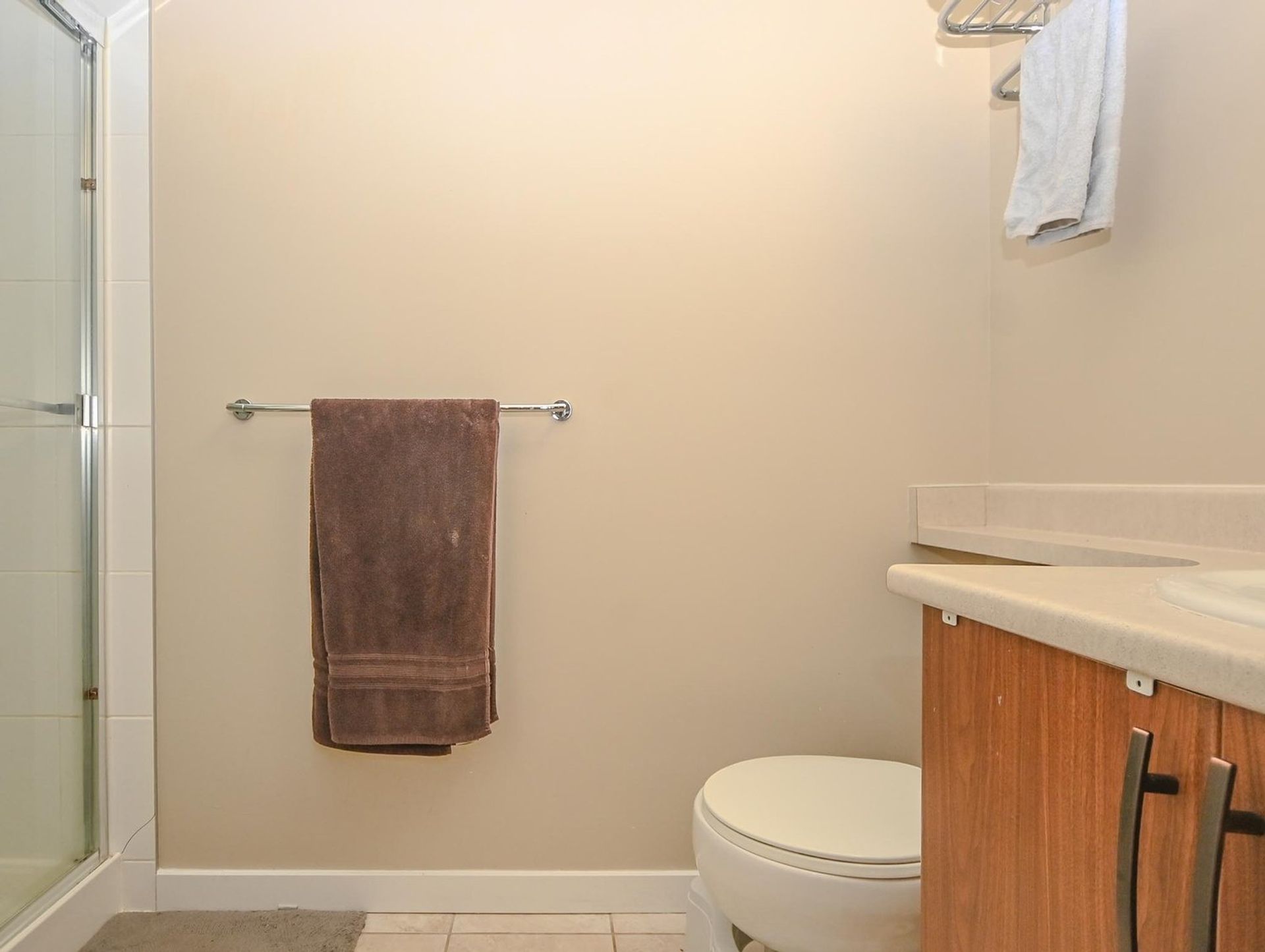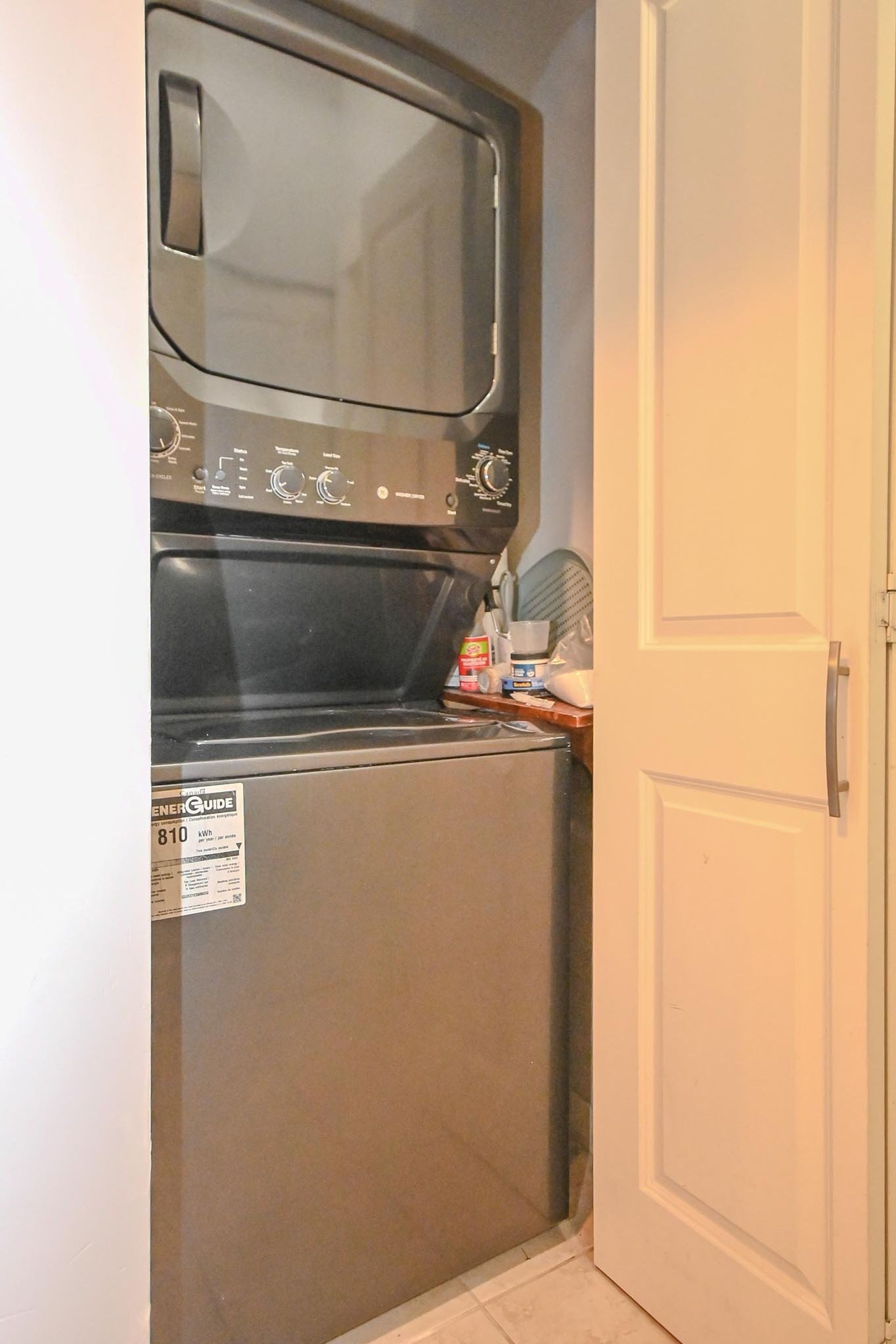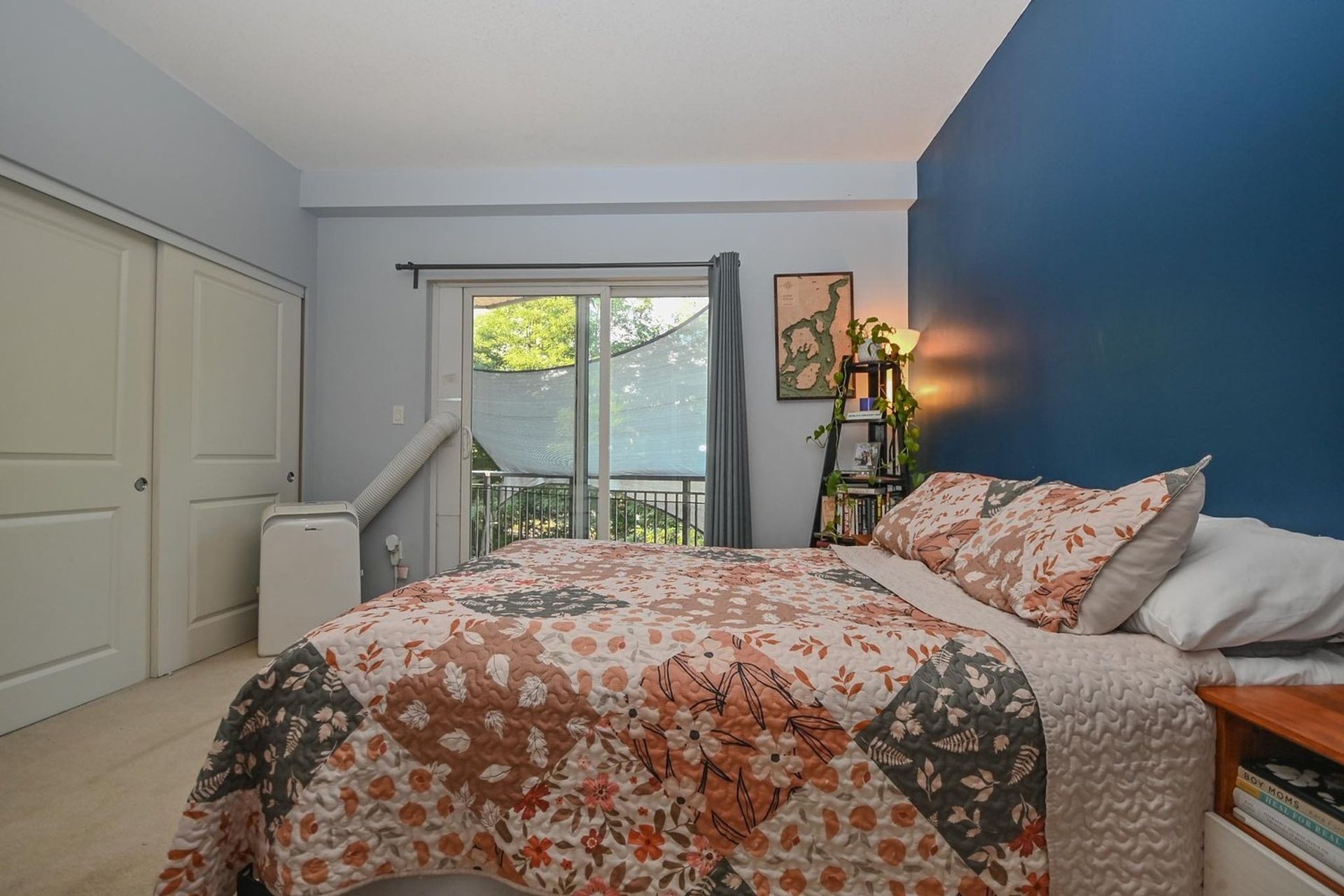 The primary bedroom is spacious, with direct access to the deck and a four-piece ensuite that includes a deep soaker tub. The second bedroom is generously sized and located on the opposite side of the unit, creating a natural sound barrier. The home is complete with a stacked in-suite washer and dryer and a three-piece main bathroom. Two parking spots and bike storage are included.