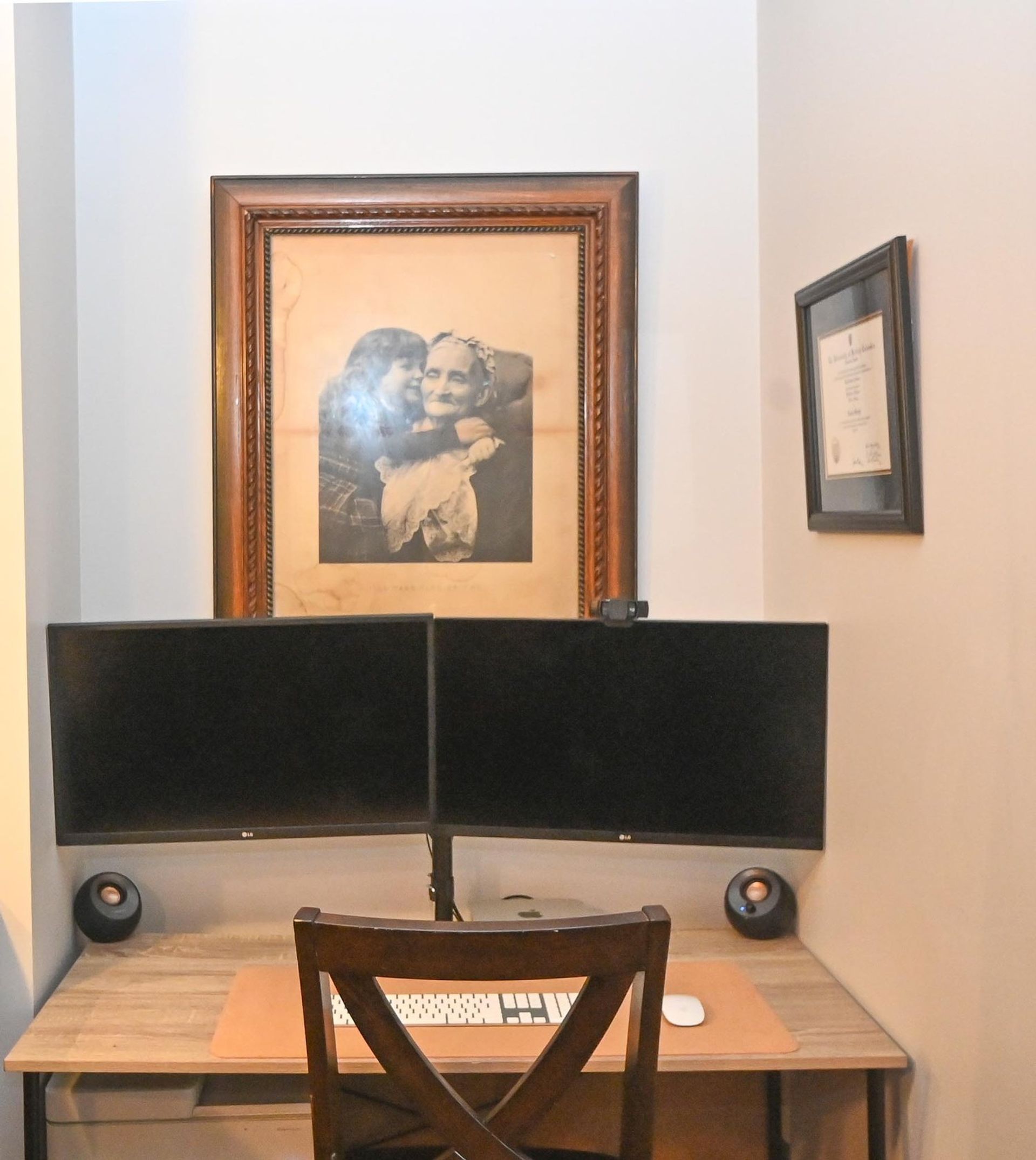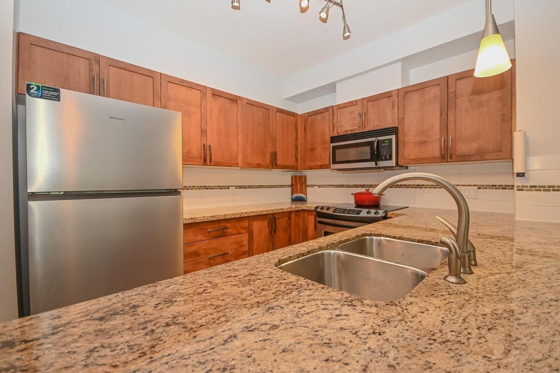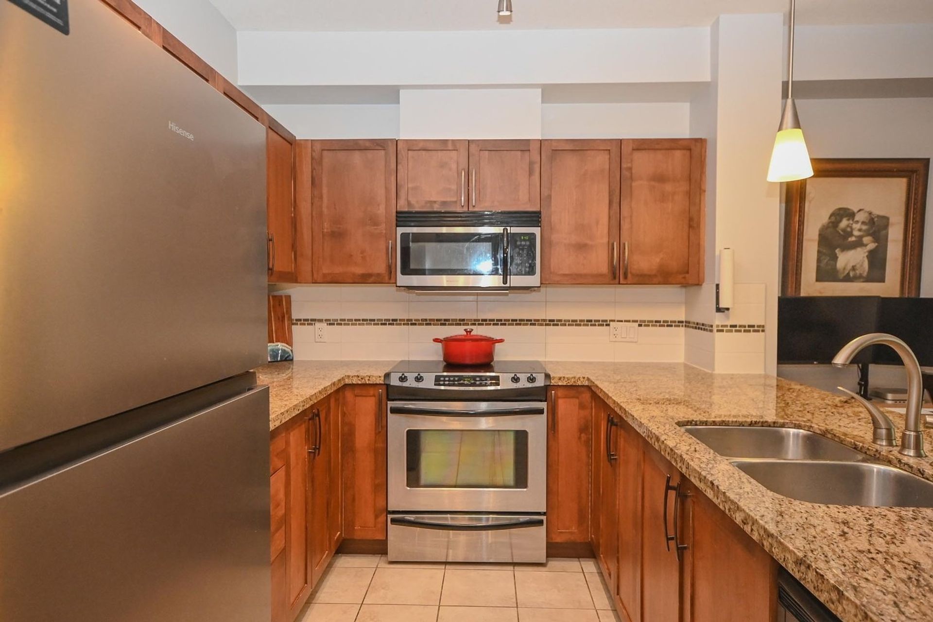 Inside, the kitchen offers fantastic storage and granite prep space—ready for any eager food lover. All stainless-steel appliances, a built-in microwave, an eating bar, and a tile backsplash complete the space. The main living area is wide and bright, amplifying utility. It's comprised of an open-concept kitchen, dining area, and living room. The dining space includes an alcove perfectly suited for a desk, and the living room features a cozy electric fireplace, two large windows facing greenery, and deck access through a glass door—flooding the room with natural light.
