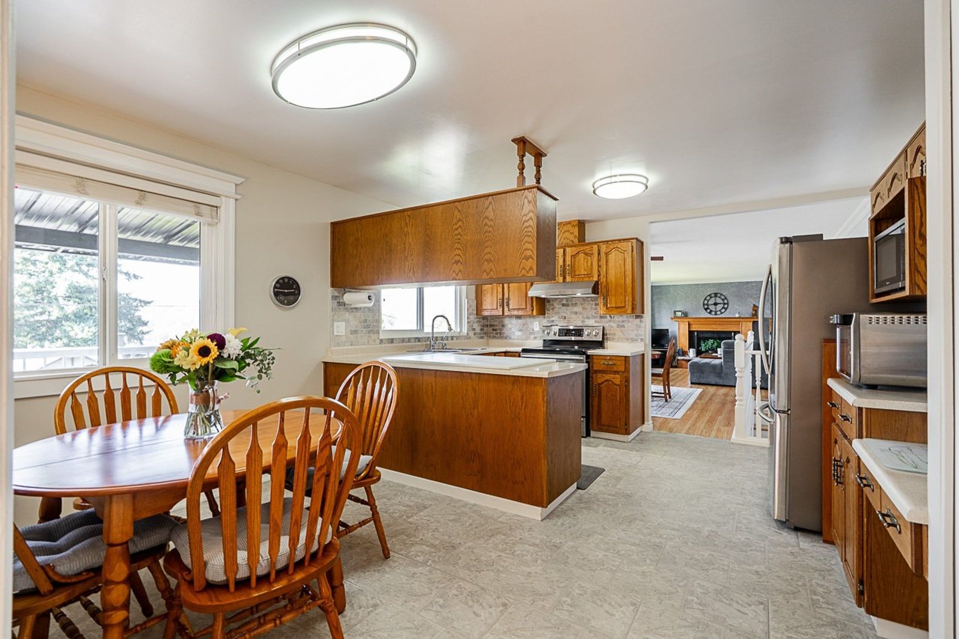 The open dining and living rooms are bathed in natural light year-round; even through our rainy months, the area remains bright and welcoming. The dining room features sliding glass doors to a fully covered front deck, perfectly positioned for evening barbecues and nightly picturesque sunsets. In the living room, a cozy wood-burning fireplace framed in a raised oak hearth and slate-inspired accent wall invites you to linger and take in the mountain views.