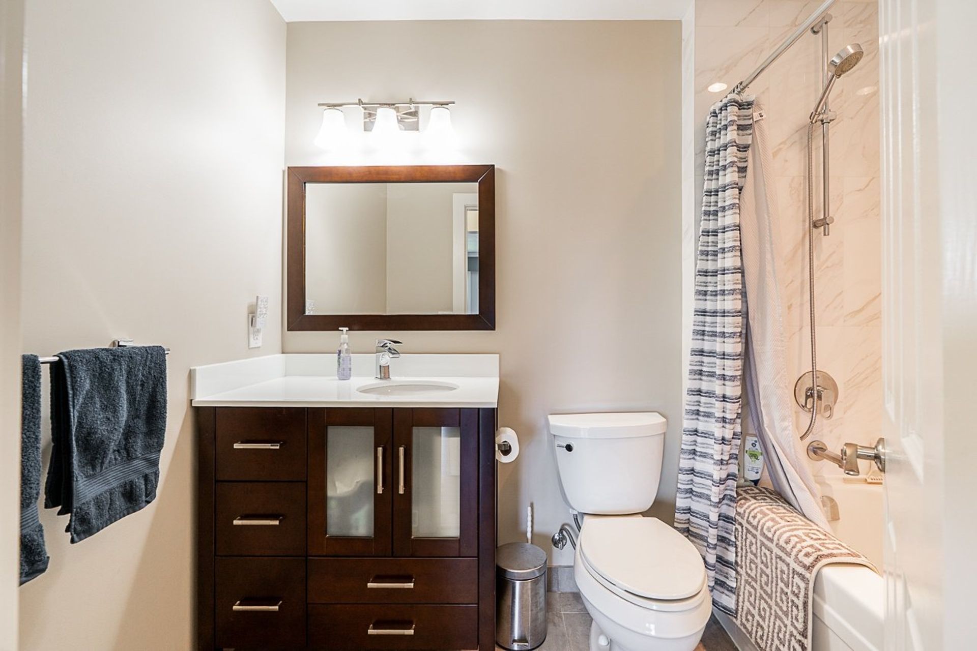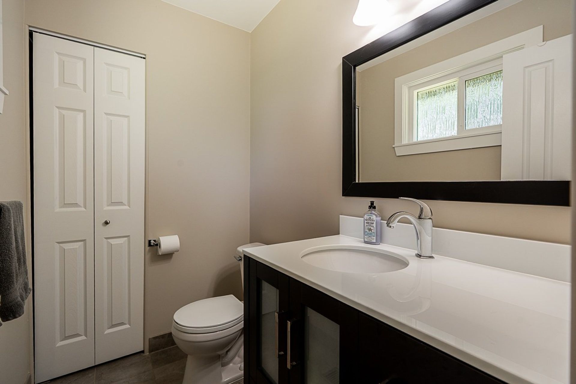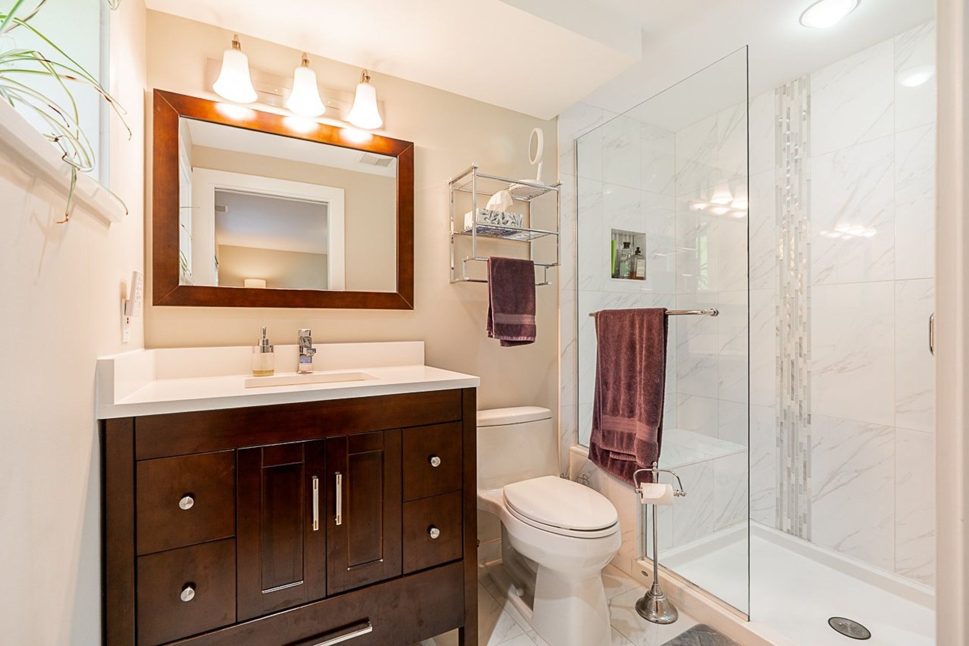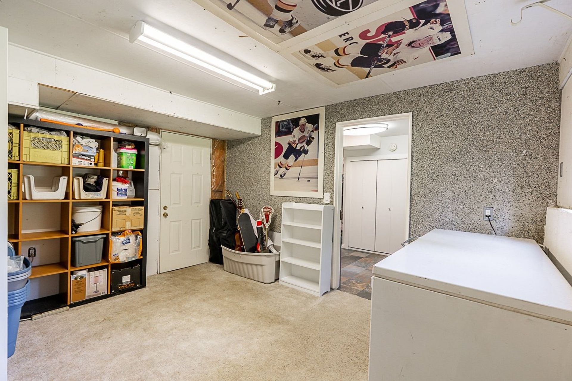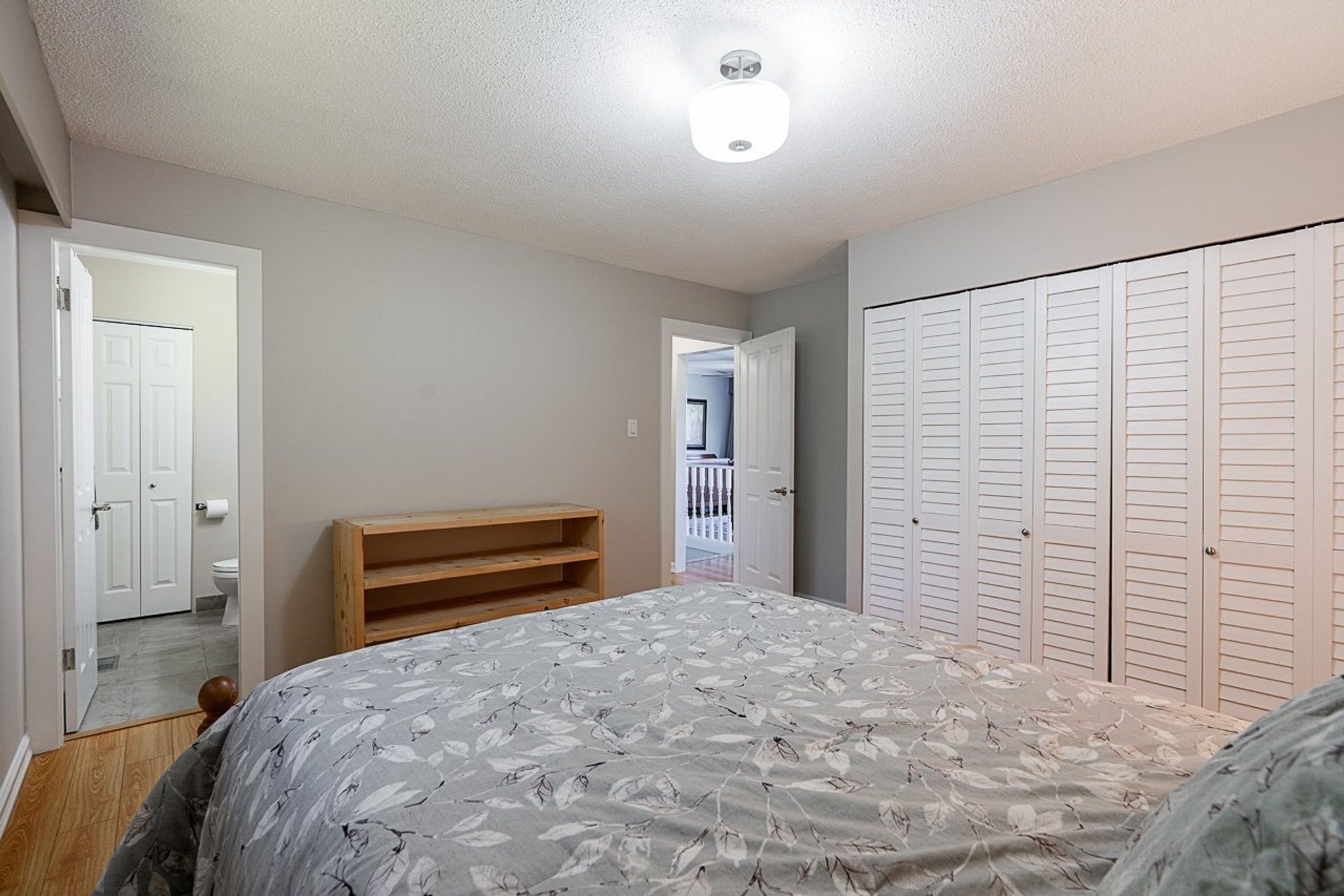 Three spacious bedrooms complete the main floor. The primary offers a two-piece ensuite with subway tile, updated vanity, and linen closet. The main four-piece bath has been refreshed with a soaker tub framed in marble tile and a vanity that echoes the ensuite’s style.