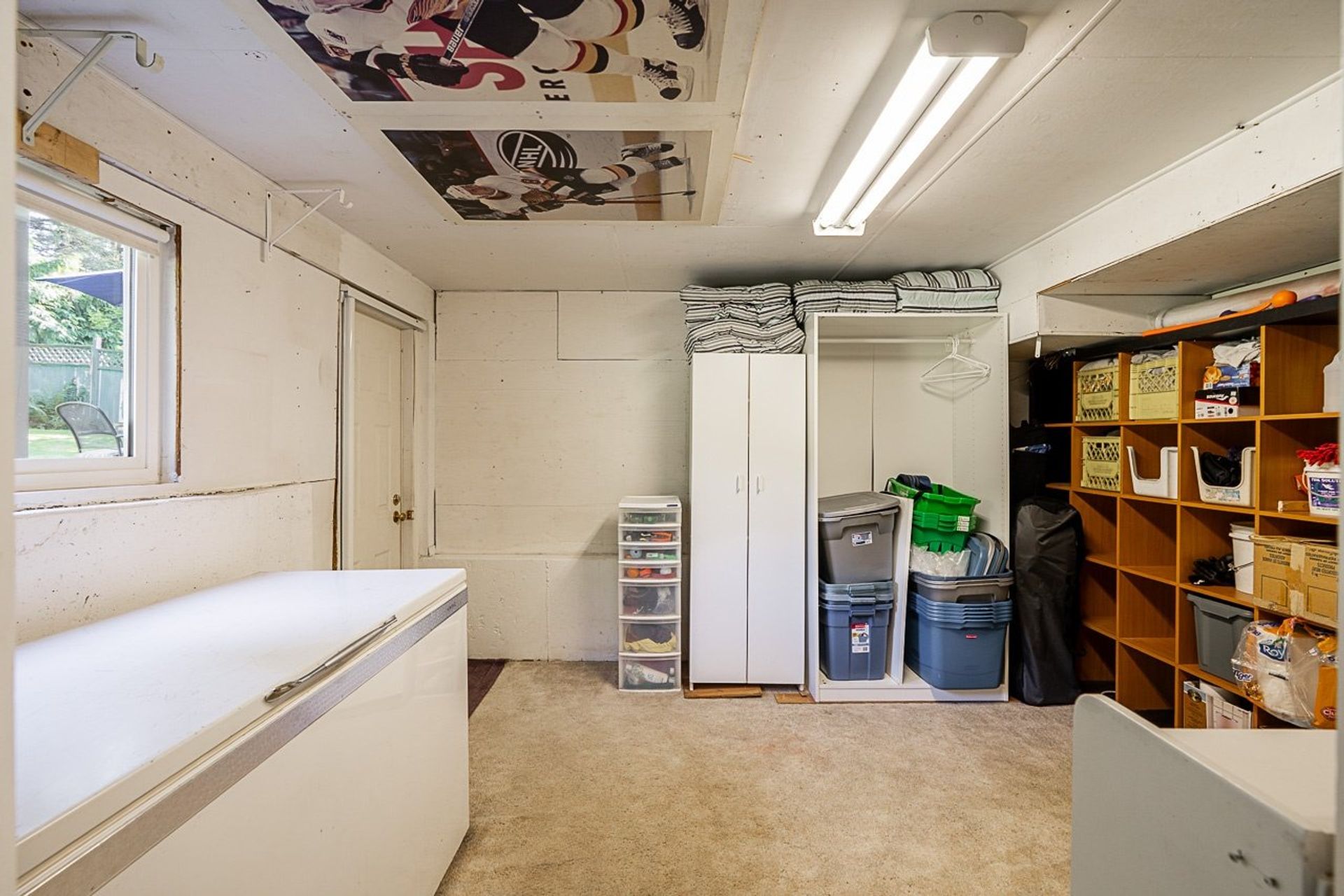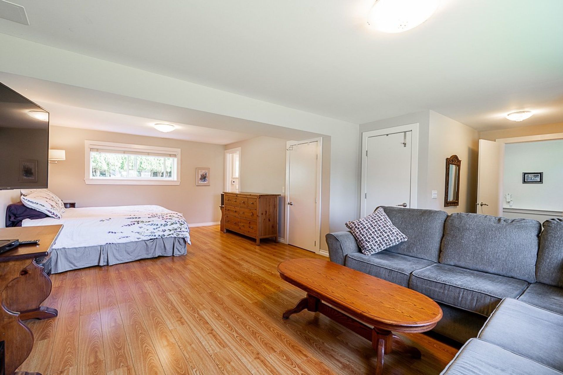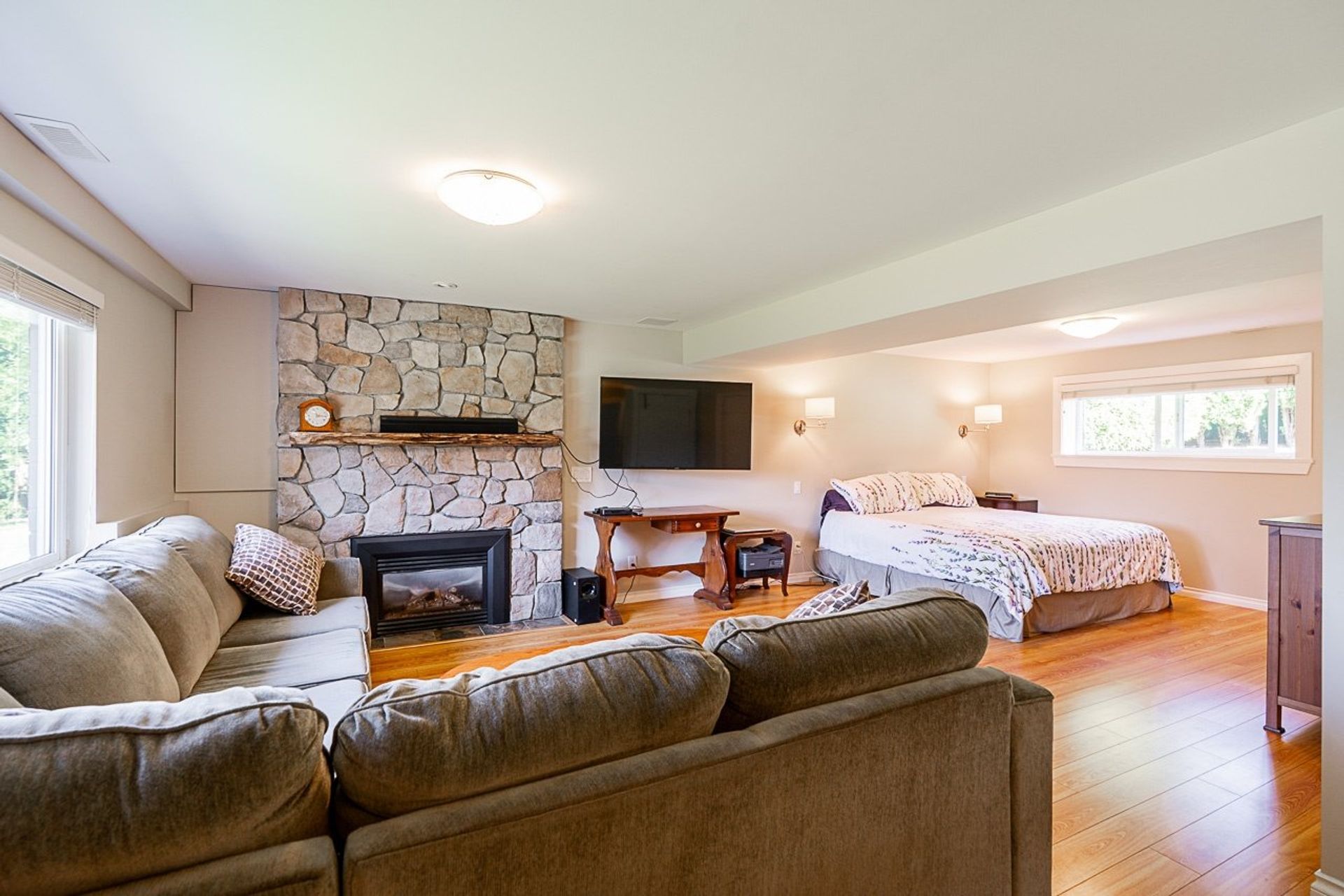Downstairs, a large recreation room merges with a fourth bedroom, creating a private retreat with abundant natural light thanks to full-height windows. The space features a stone-mantled gas fireplace, a built-in closet organizer, and thoughtful under-stair storage. The open-concept bedroom includes a walk-in closet, backyard views, dual reading lights, and access to a beautifully renovated three-piece bathroom with a walk-in shower, quartz counters, and designer tile details.