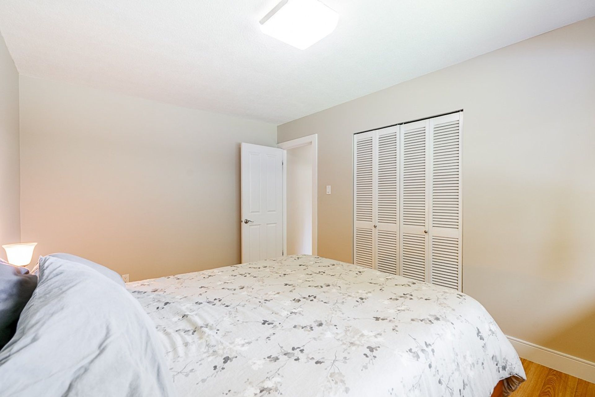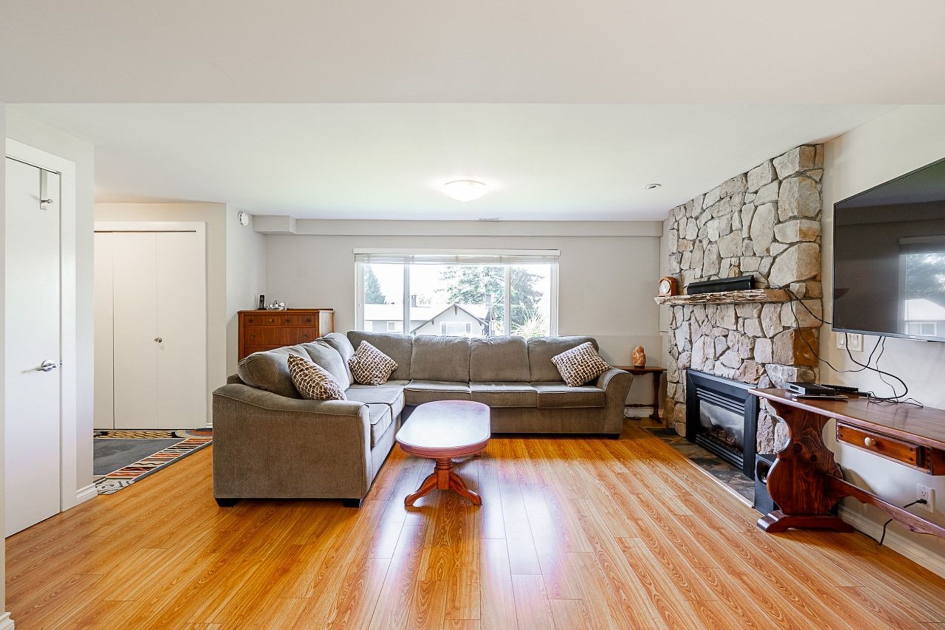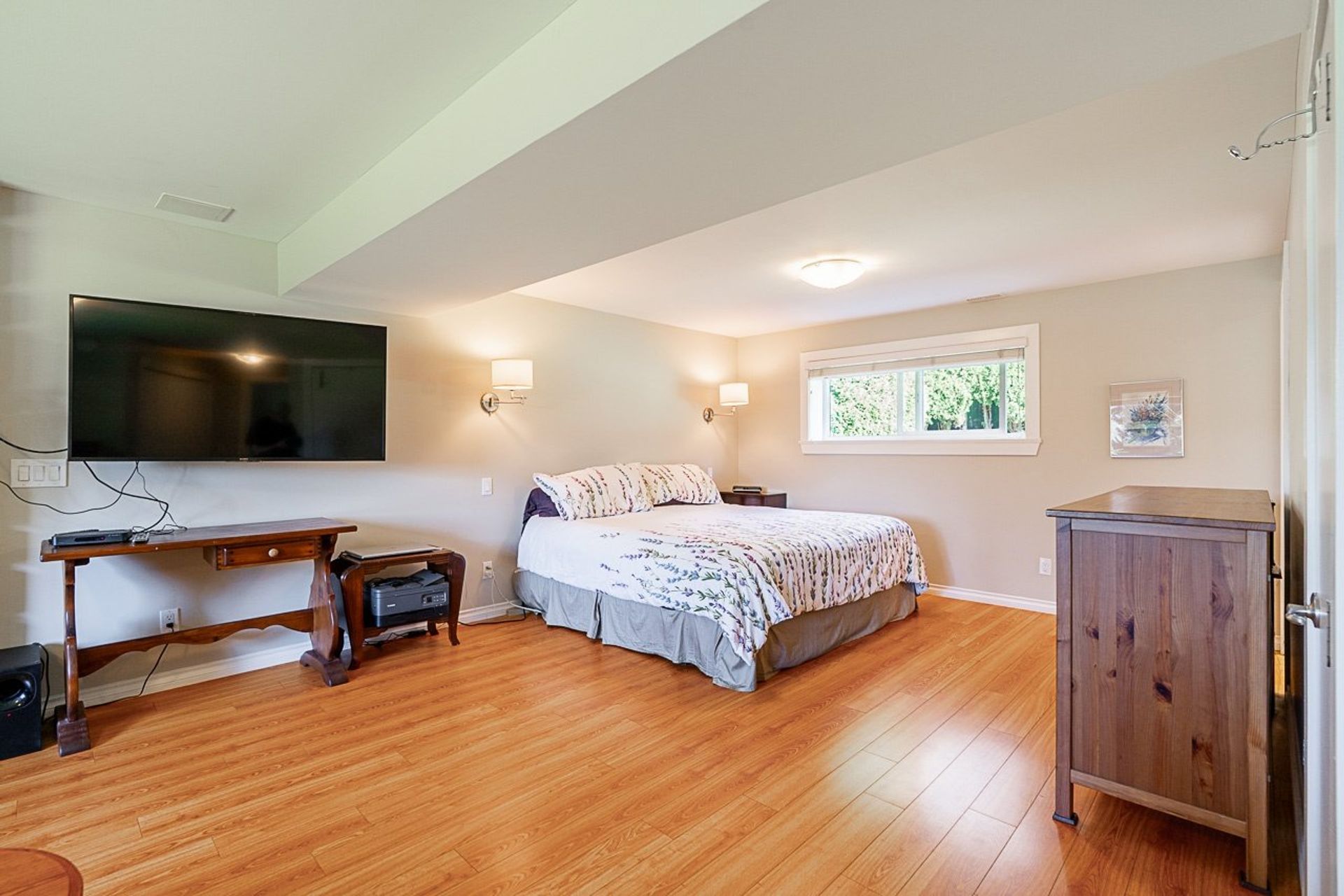 Downstairs, a large recreation room merges with a fourth bedroom, creating a private retreat with abundant natural light thanks to full-height windows. The space features a stone-mantled gas fireplace, a built-in closet organizer, and thoughtful under-stair storage. The open-concept bedroom includes a walk-in closet, backyard views, dual reading lights, and access to a beautifully renovated three-piece bathroom with a walk-in shower, quartz counters, and designer tile details.