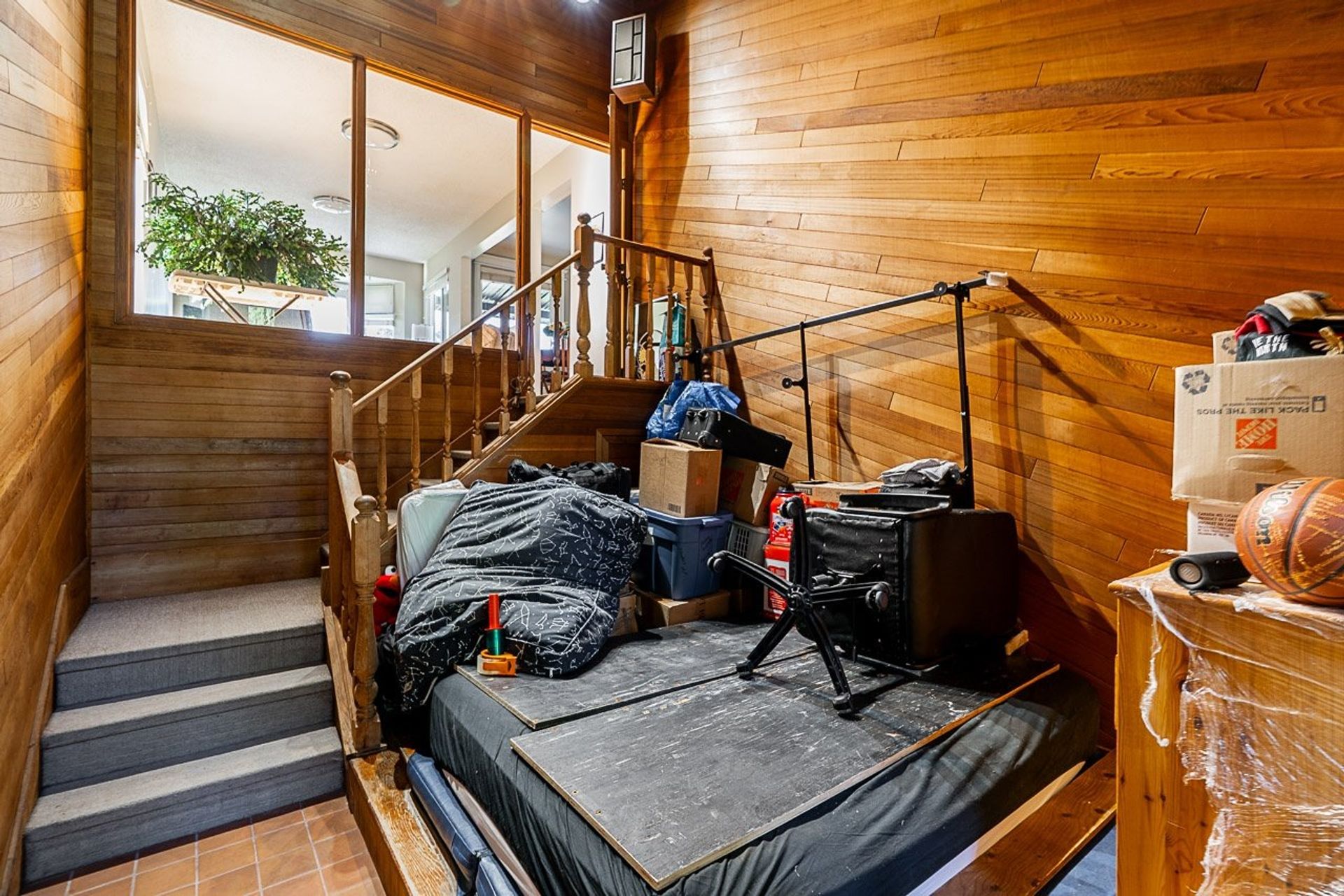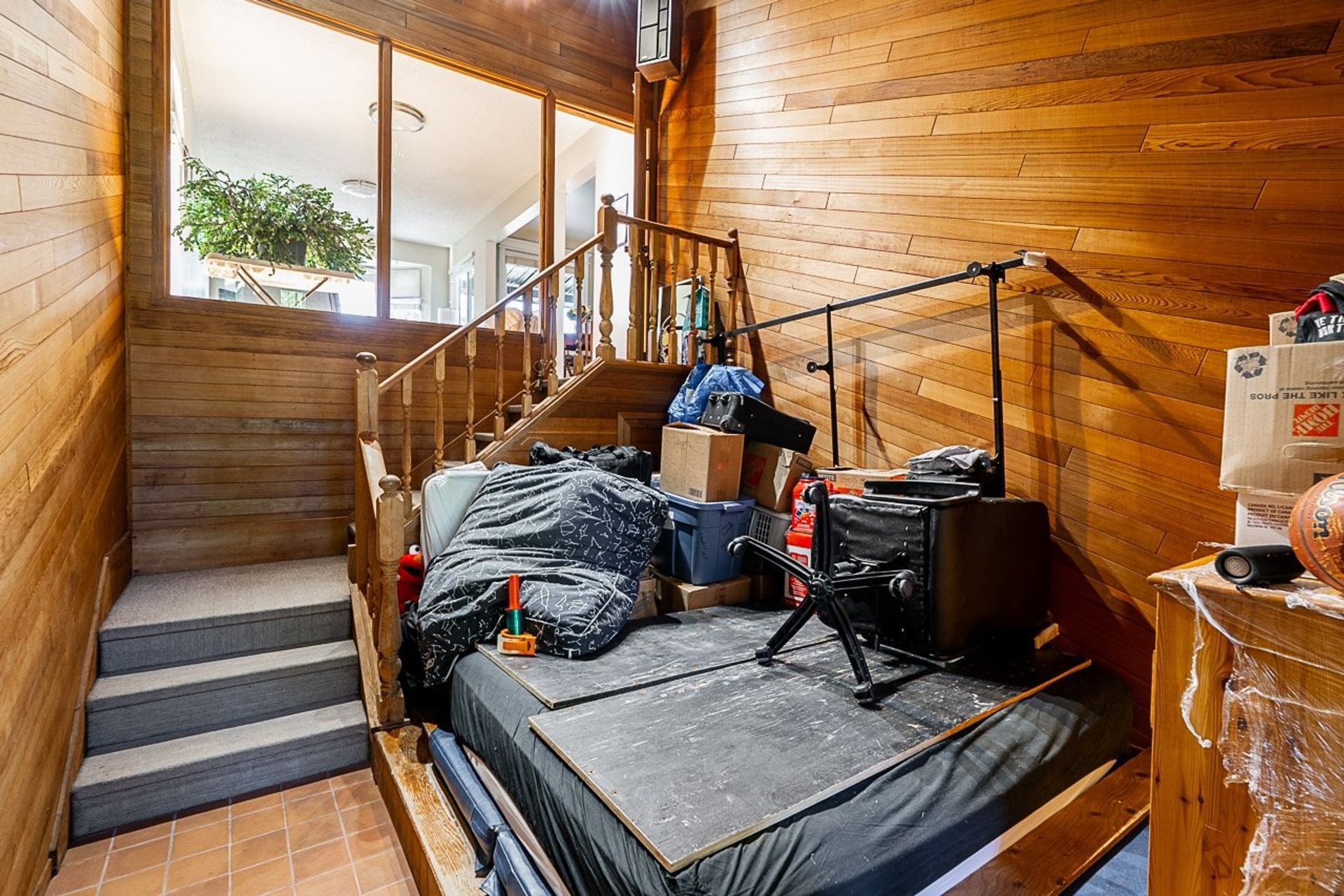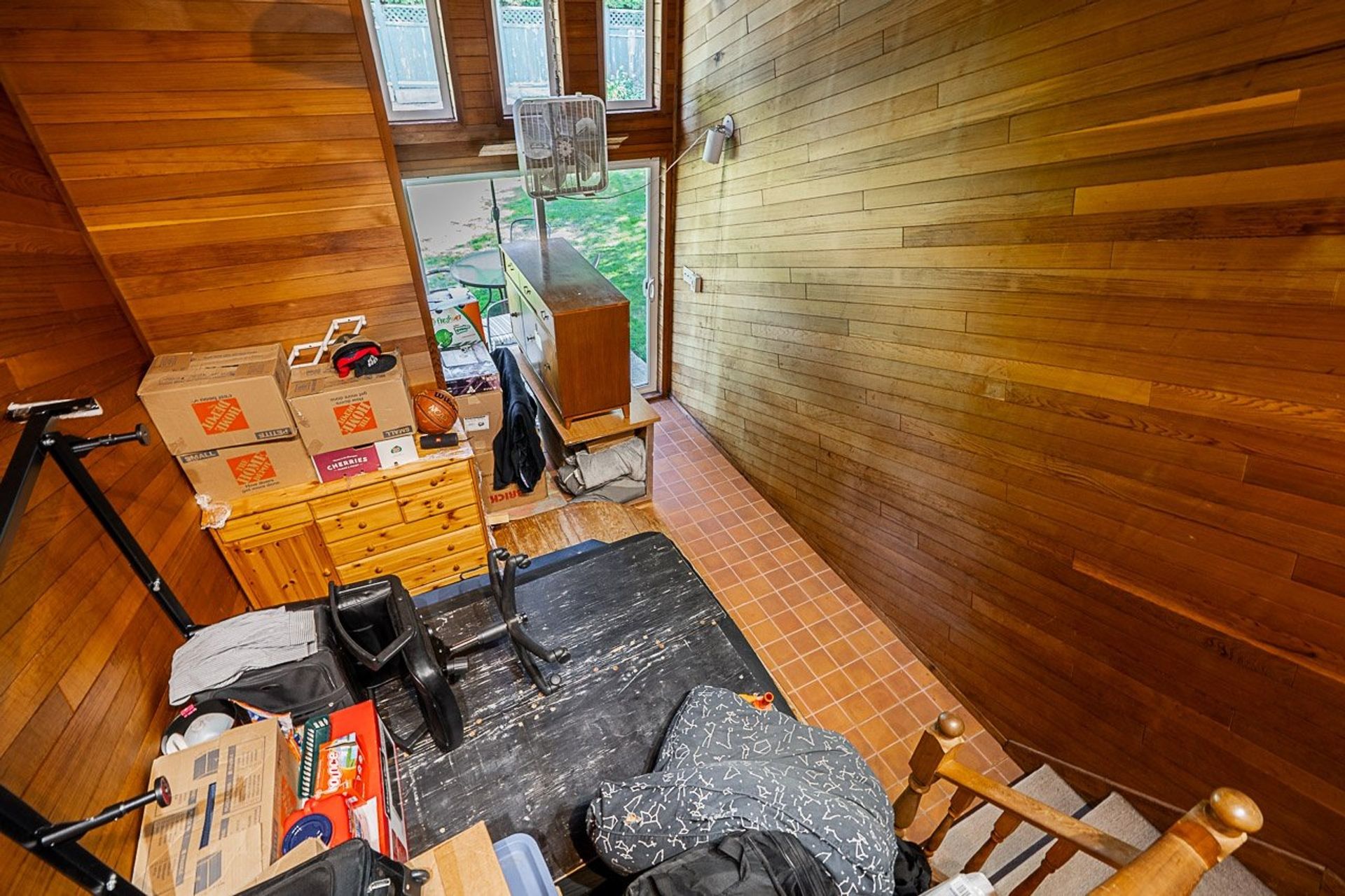 The main floor is designed with both connection and comfort in mind: plenty of room to gather while still offering spaces for everyone to retreat. The kitchen focuses on function with stainless steel Samsung appliances, a French door fridge, a full pantry closet, and a built-in work area with extra storage. From here, the flow continues into the eating area and through a generous passthrough into the family room. The family room features bay windows on one side and a glass wall on the other. The family room provides access on to a substantial two-level flex room with soaring vaulted ceilings and timeless cedar paneling. This versatile flex space—currently home to a hot tub—connects seamlessly to the backyard through two separate access points.