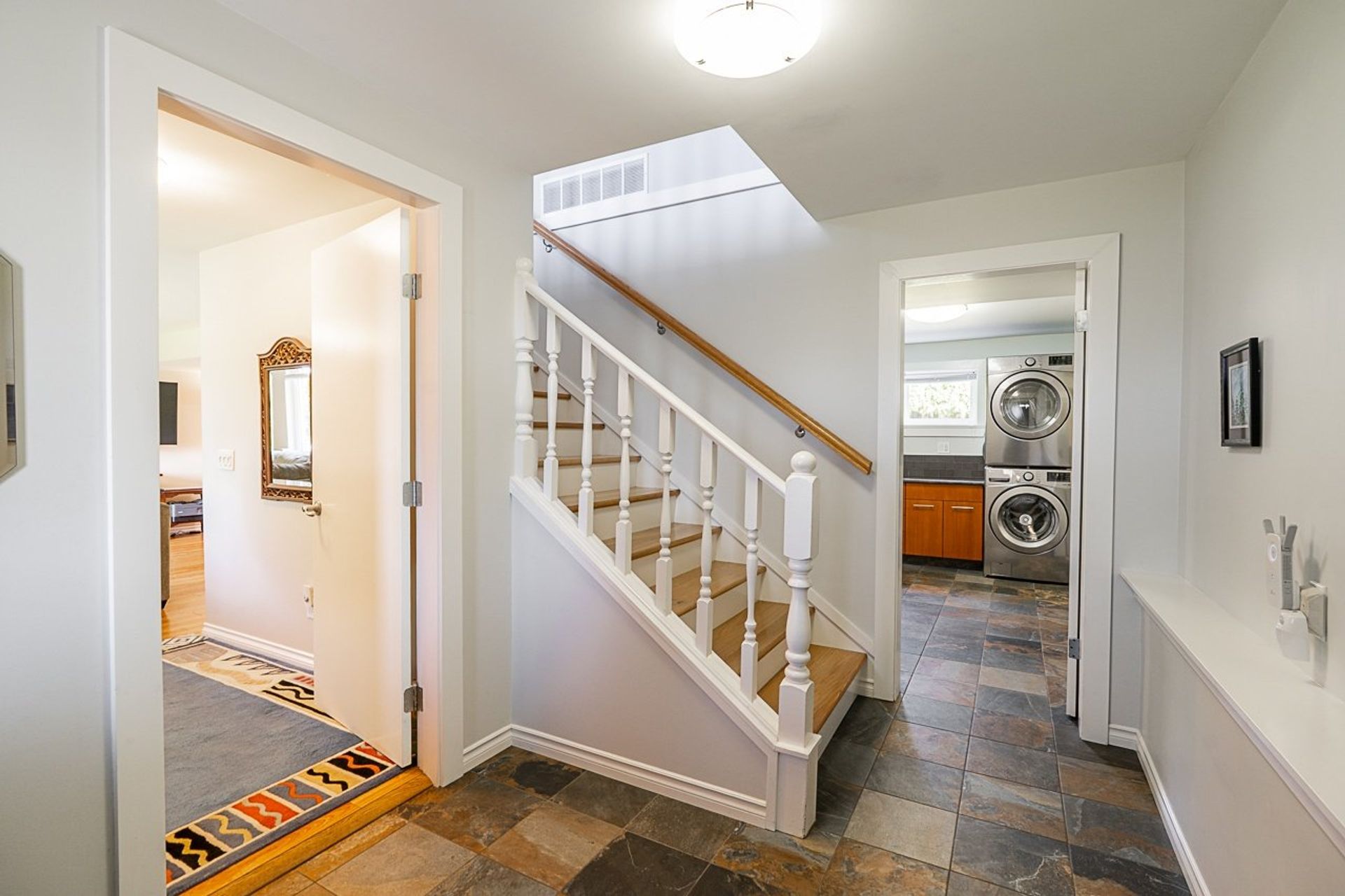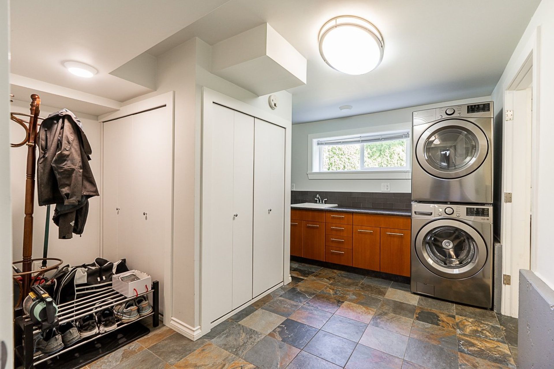A spacious laundry room—equipped with LG stacked washer/dryer, a full bank of cabinetry, and a utility sink—connects to the mudroom with backyard and garage access. The oversized two-car garage doubles as a workshop with its own sub-panel, while the driveway accommodates at least four additional vehicles plus room for an RV or boat. The low-maintenance front yard features a level lawn framed by a rock retaining wall and perennial garden bed, while the pristine backyard offers endless flexibility for entertaining, play, or quiet enjoyment.