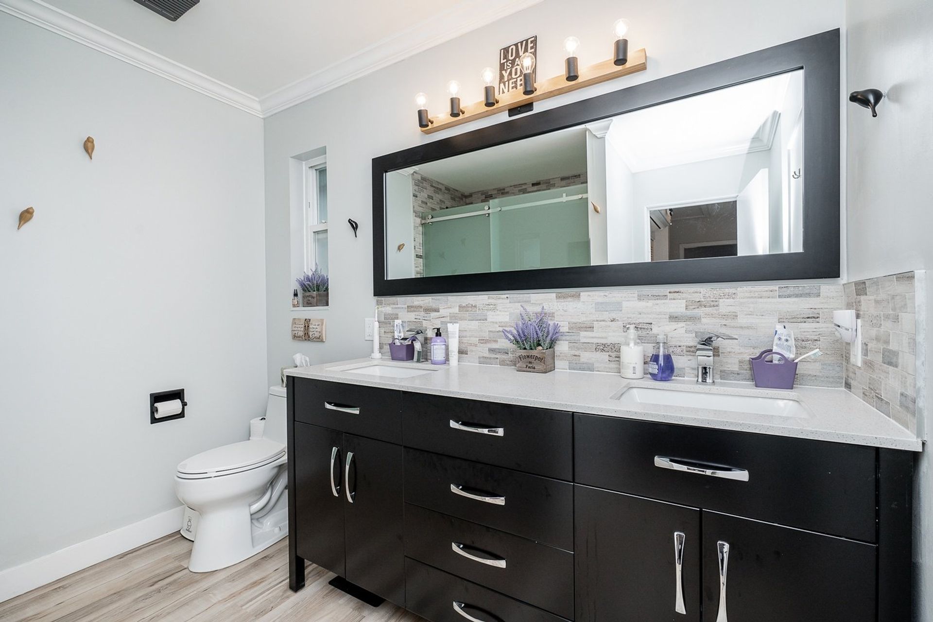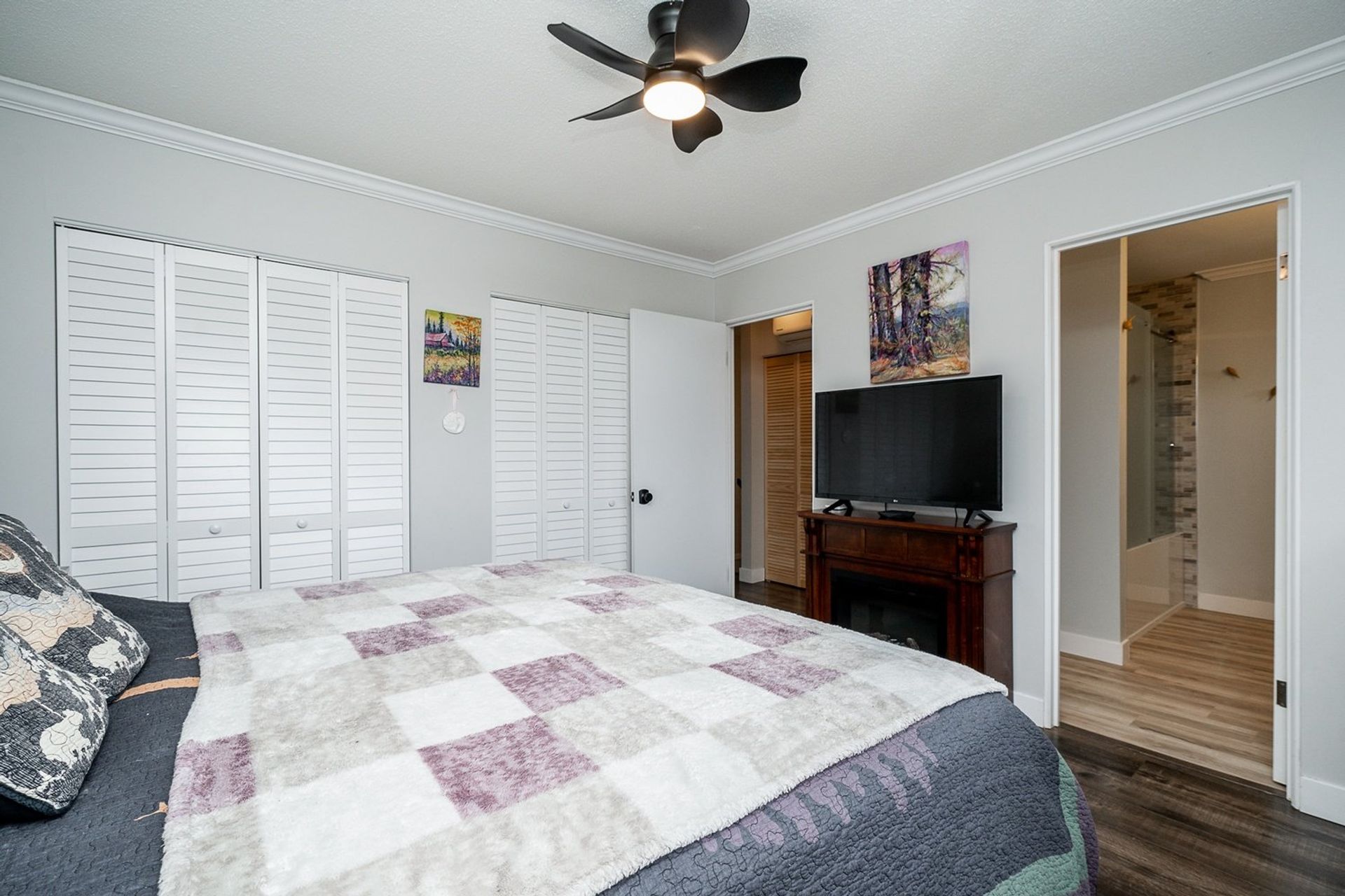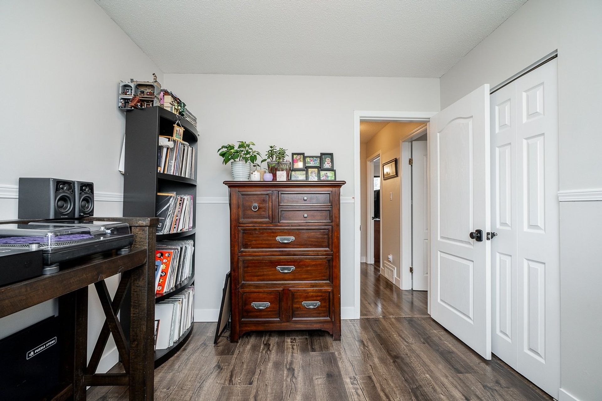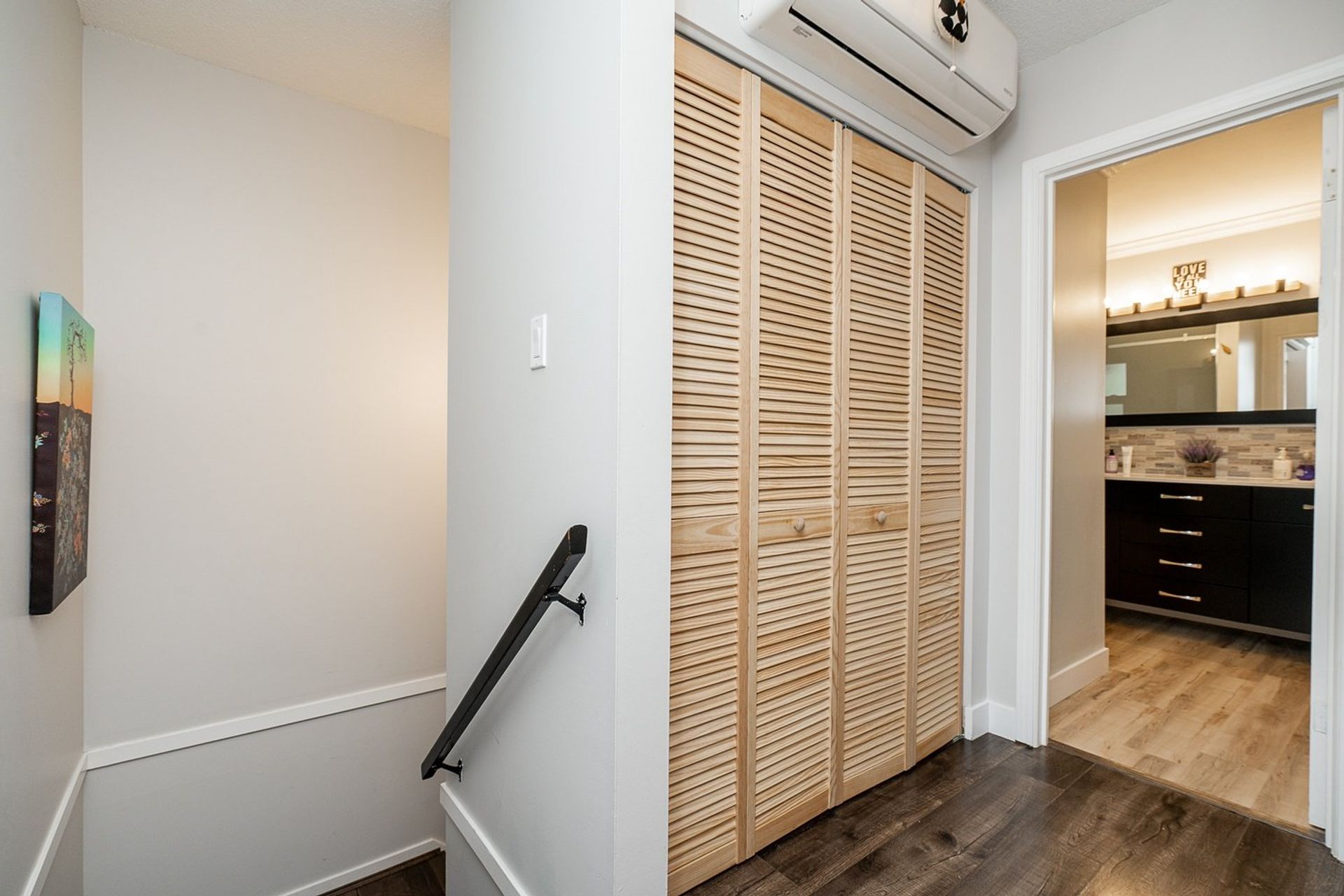 The home’s kitchen has a modern feel with all new appliances, LG fridge and Whirlpool stove & dishwasher. There is also a two-person eating bar which provides fantastic prep area for cooking enthusiasts, abundant cabinetry with a display area and a lazy susan, a ¾ split sink with garburator, tile backsplash, subway tile flooring with radiant heating, and privacy blinds meant to allow natural light. The kitchen is open to a dining room with enough room for extended family to enjoy a meal together. Off the dining room, the living room features a brick accent wall & a new electric Dimplex fireplace with a new mantle. The living room has fantastic natural light with a large window—with new fully automatic blinds—looking out on to the home’s very private, newly fully fenced front yard; there is a deck area and a shed in the yard.