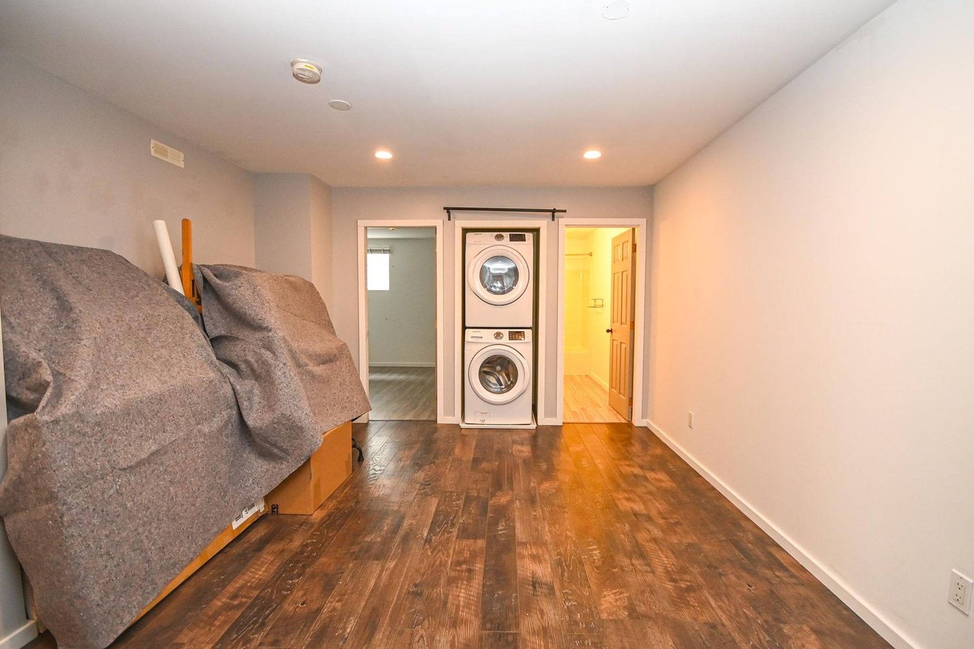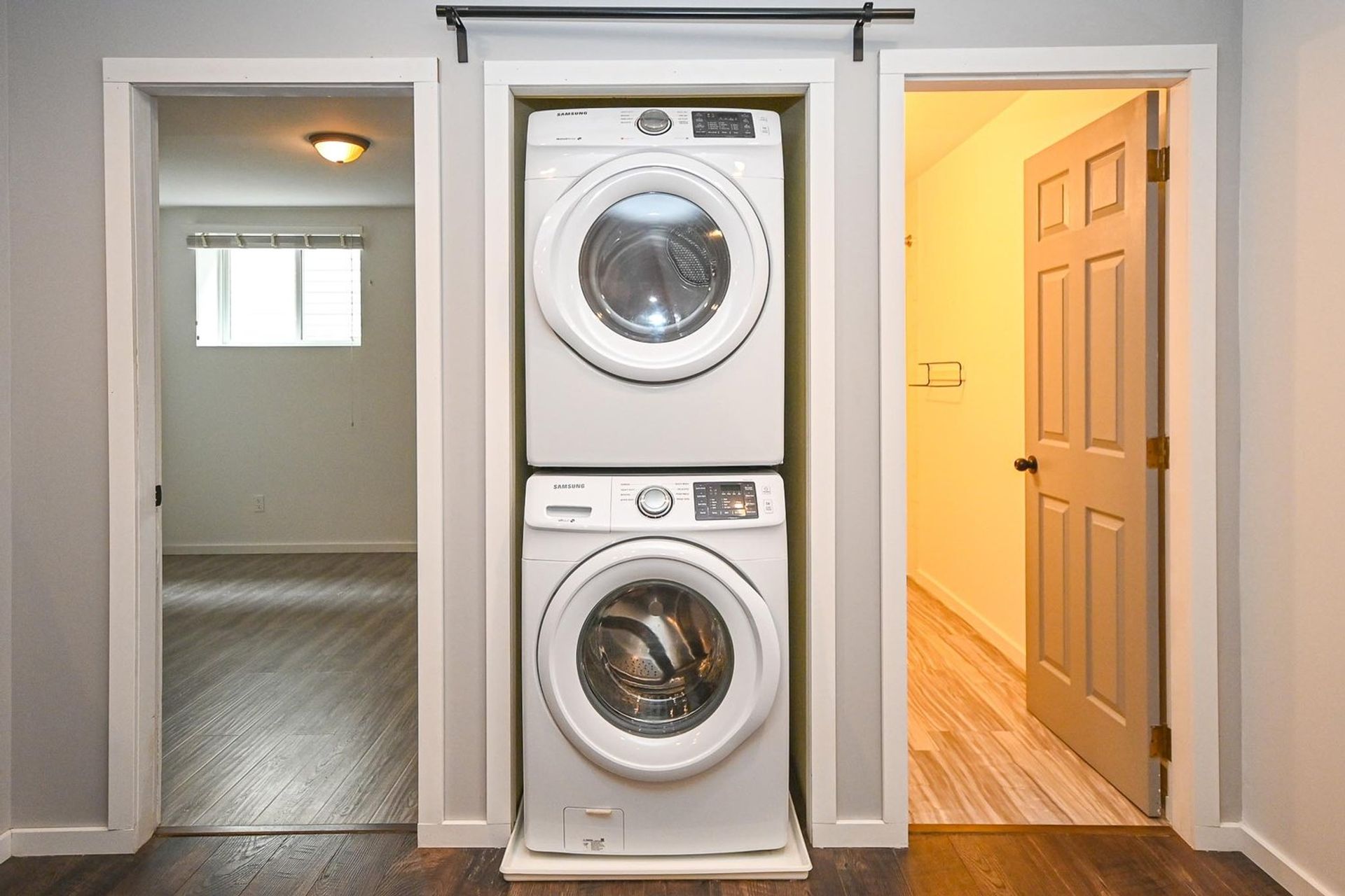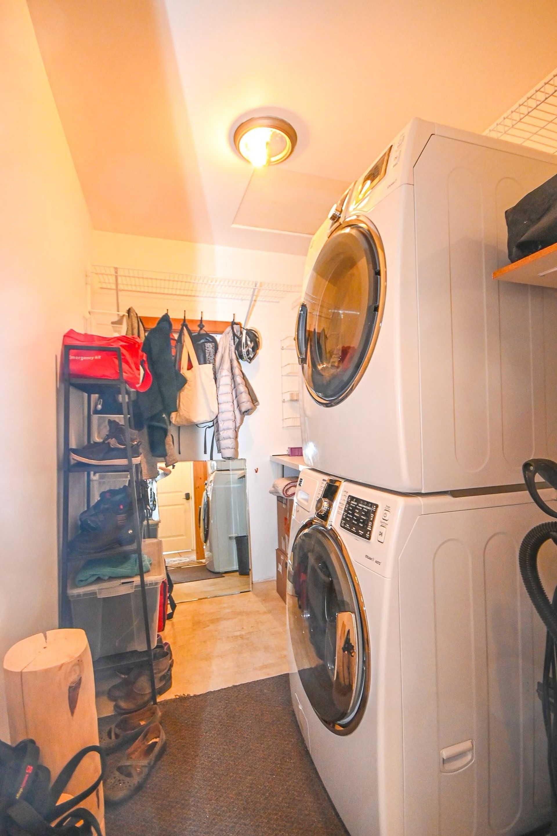 The lower level has a shared foyer entryway with access to the home’s suite and a secondary foyer used solely by those living on the main floor. Off of the main living space’s foyer is a dedicated laundry room with a full-sized stacked washer and dryer and a decent amount of storage space. Both foyer areas and laundry room have new tile flooring.