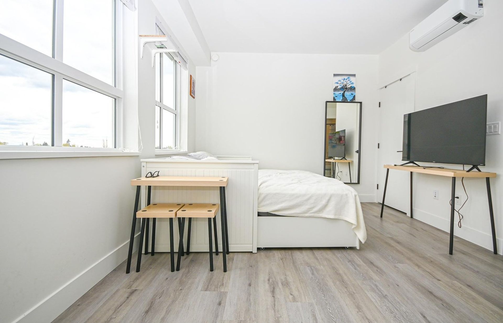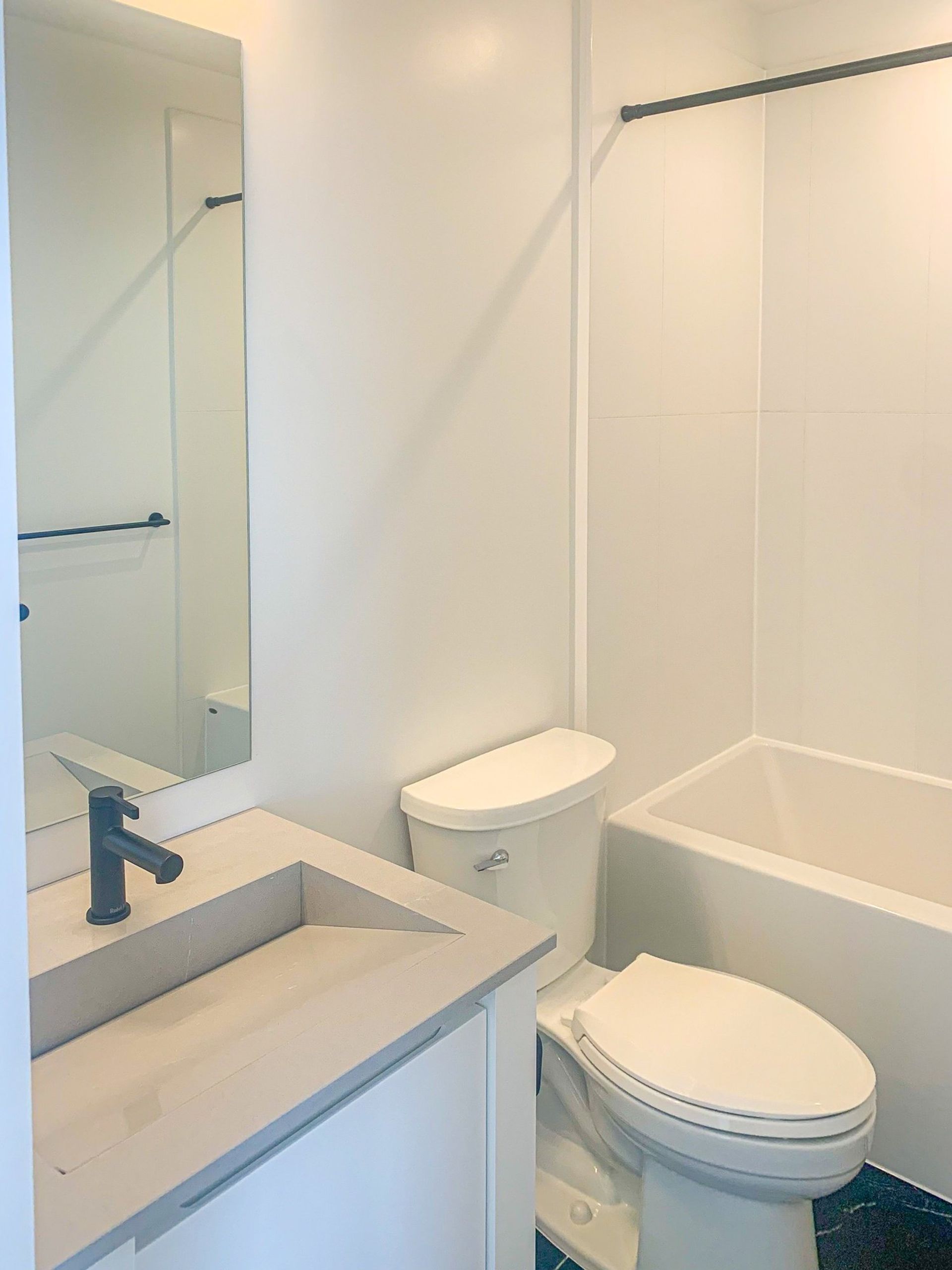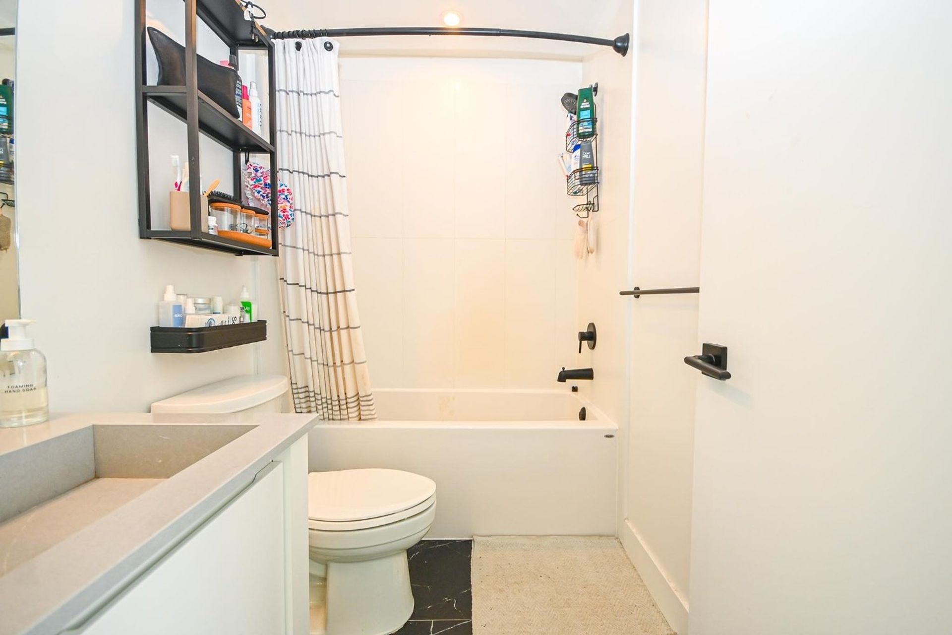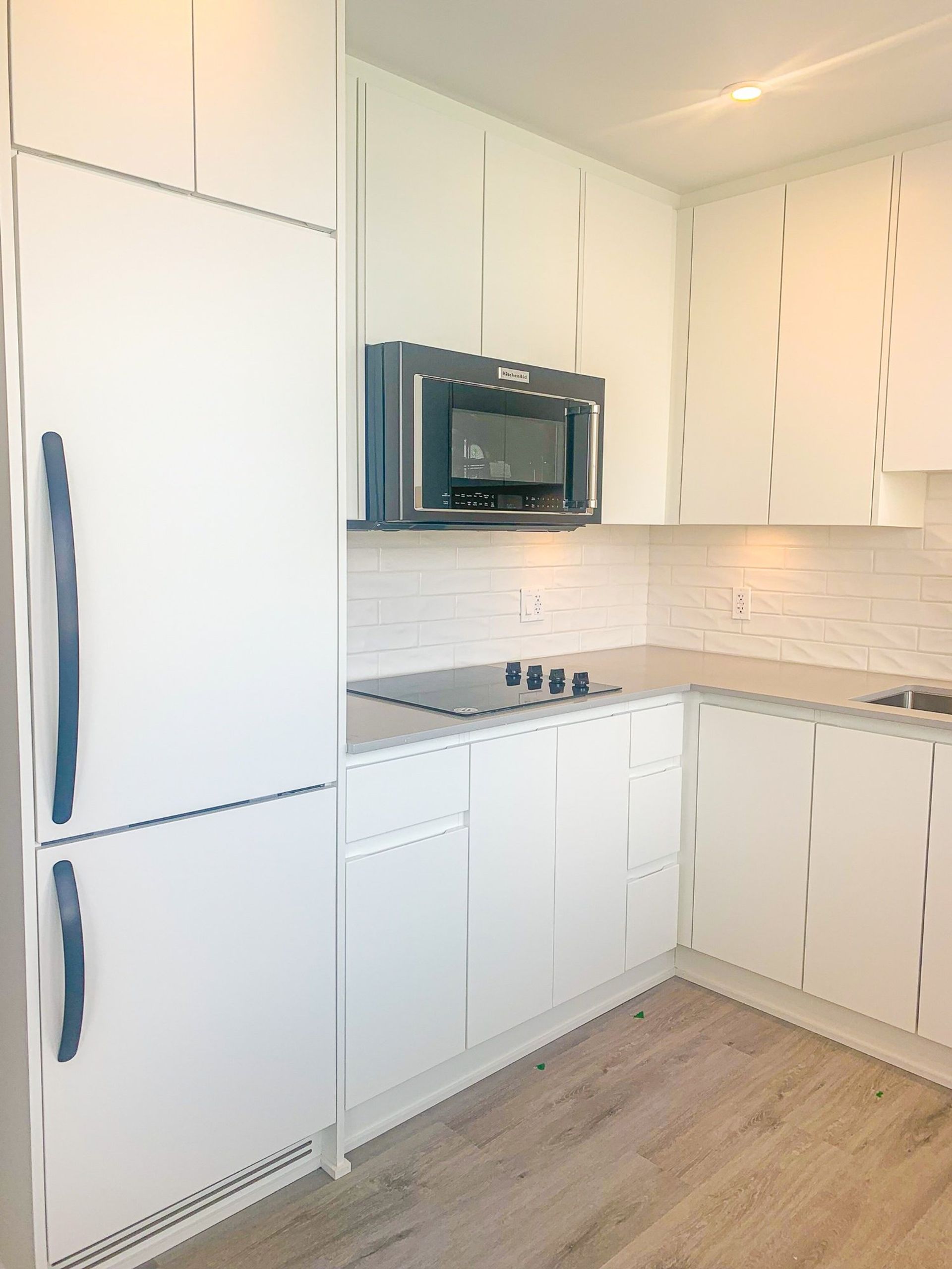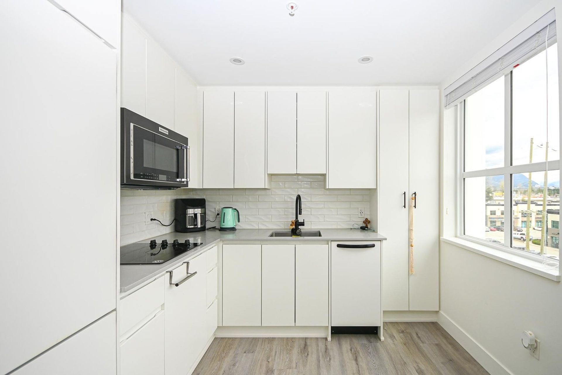 The unit itself is bright and open exemplifying modernity. With 9-foot ceilings & LED lighting the studio is flush with light and primed for picturesque sunrises silhouetting over mountain views. The kitchen is bright white with seamless fridge and dishwasher integration, a built-in stove top & microwave oven, all coupled with an elegant white tiled backsplash, and quartz counters which are also present in the bathroom. The four-piece bathroom has an integrated quartz sink, and a deep soaker tub. The home is complete with in-suite laundry & AC. 1 parking & bike locker included.