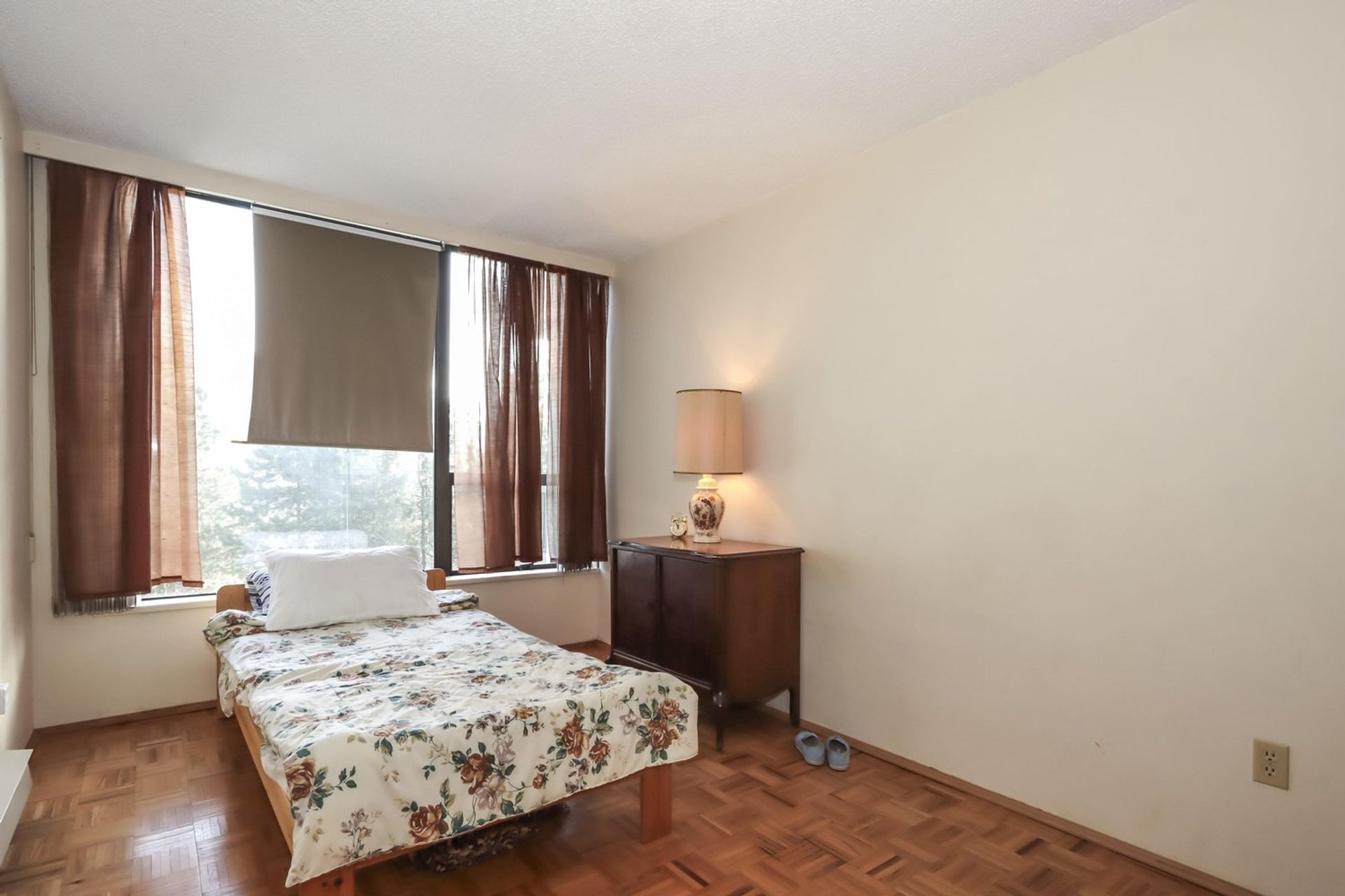 There are two bedrooms in this unit; the primary room comes with a private covered deck, with park view, dual tall closets, and access to the main four-piece bathroom. A second bedroom, deep storage closet, and dedicated entryway complete 704’s floorplan.