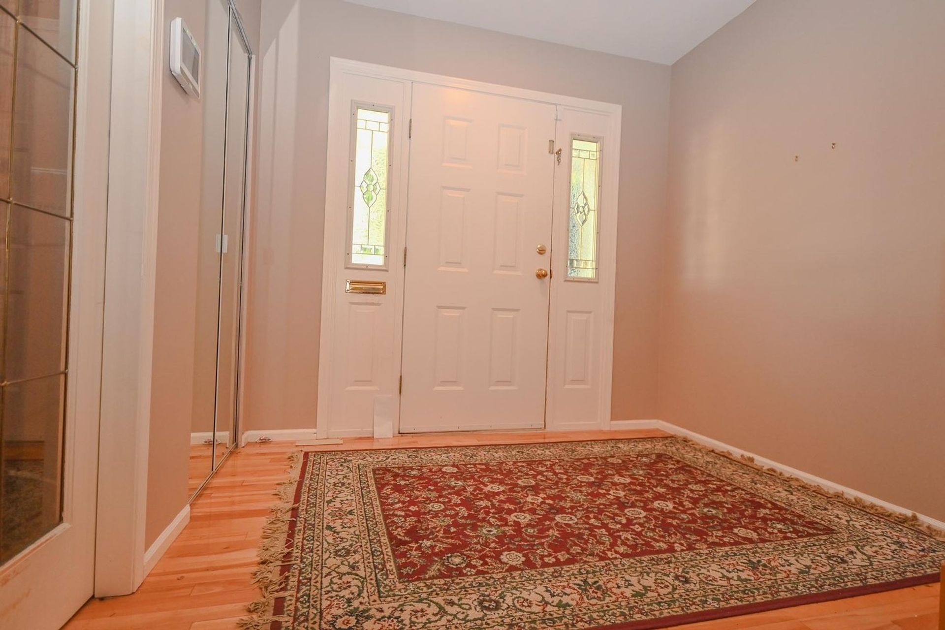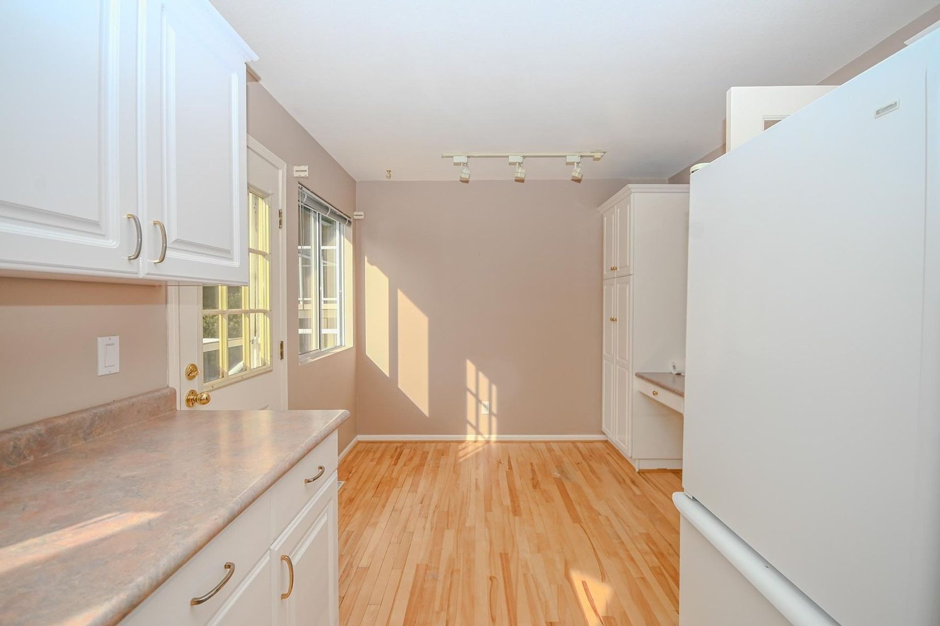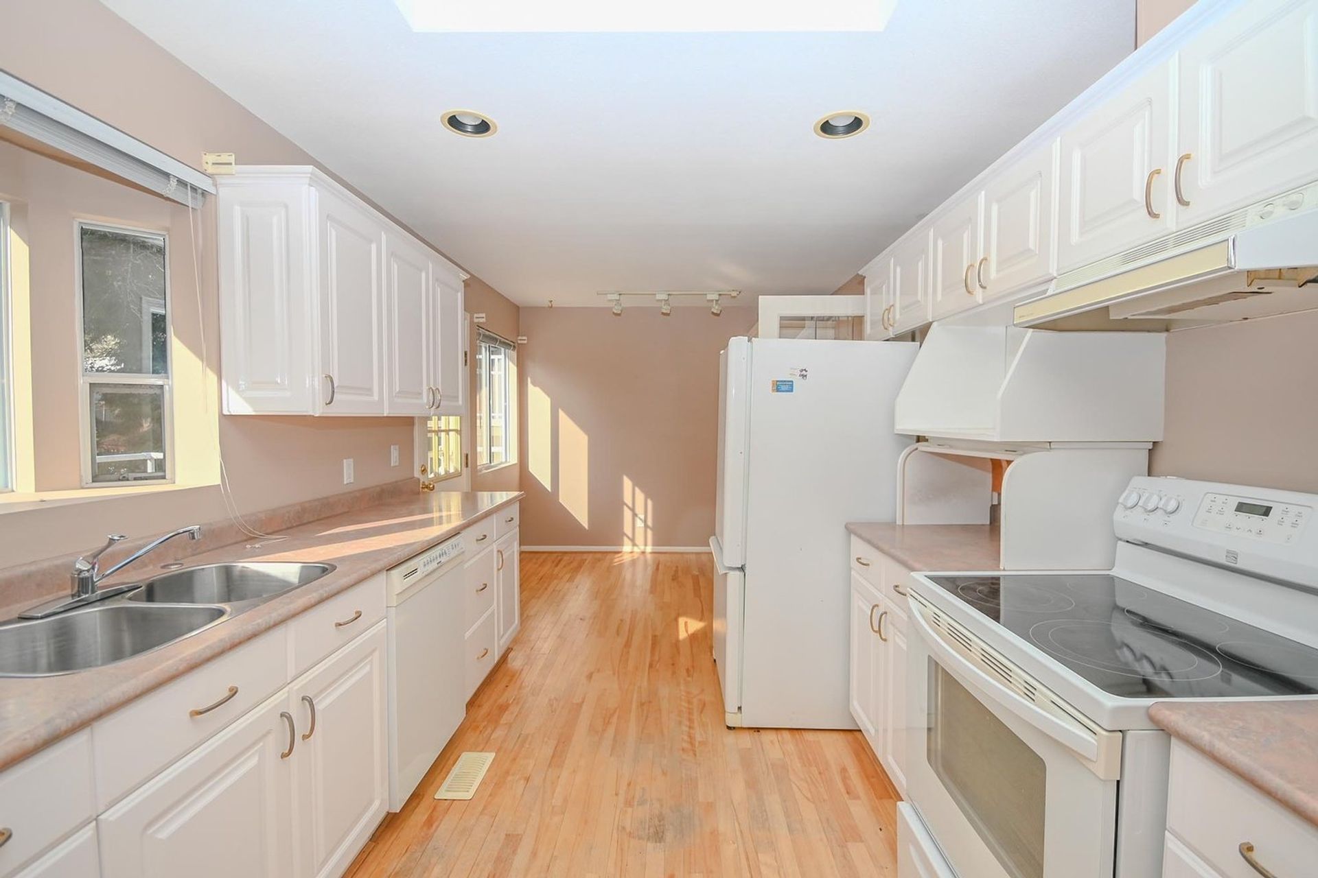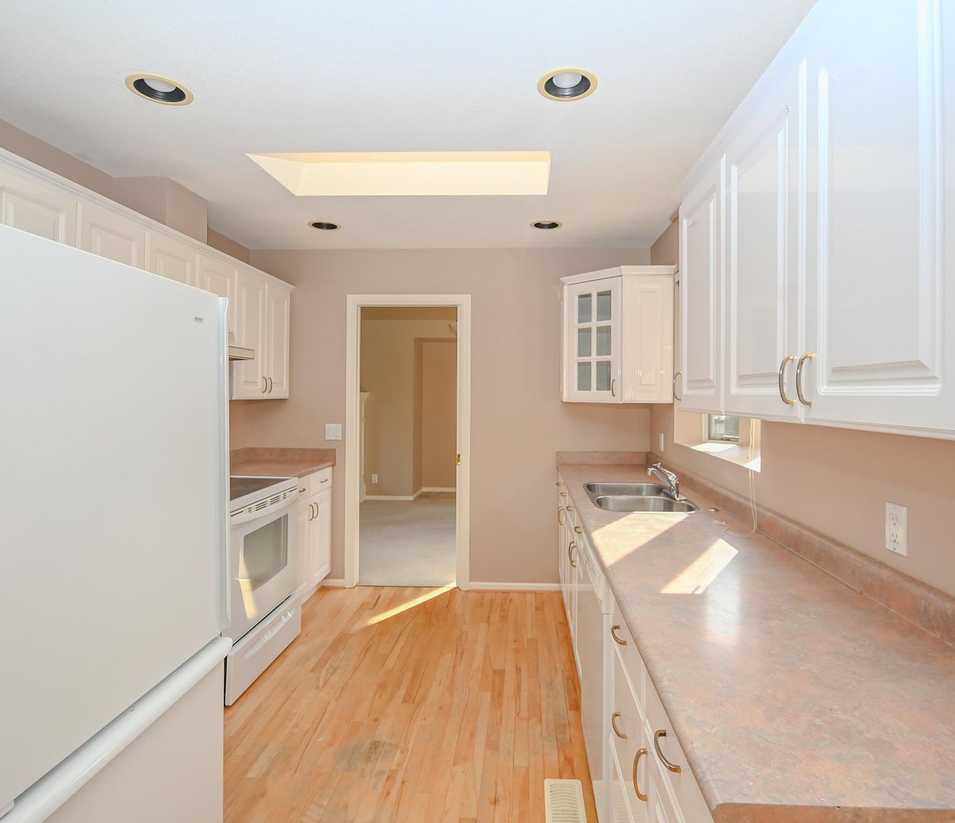 The heart of the main level is a sprawling living room with vaulted ceilings, seamlessly connected to a formal dining room—both are bathed in natural light with views of the front and backyard. The living room’s cozy gas fireplace sets the perfect ambiance for gatherings, while the dining room features a built-in display nook for added elegance. The bright, crisp white kitchen features pot lights, a dual sink framed by canted bay windows, a skylight, and an adjoining eating area with a large pantry cupboard. There is access from the eating area out to the back deck with stairs down the yard—perfect for entertaining or quiet relaxation.