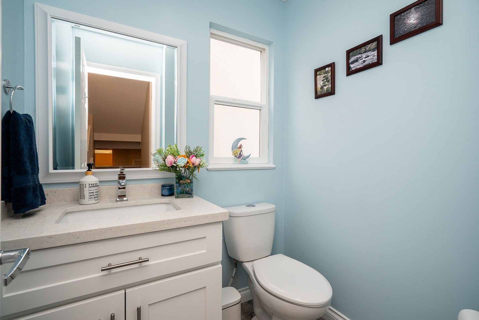 The dining room opens onto a tranquil, spacious back deck with stairs leading down to a serene, fully fenced backyard. Here, you’ll find a peaceful butterfly garden and a substantial covered patio, professionally poured and tied into the home’s foundation—making it perfect for year-round outdoor living. Completing the main floor is a cozy living room with an electric fireplace and a convenient two-piece powder room.