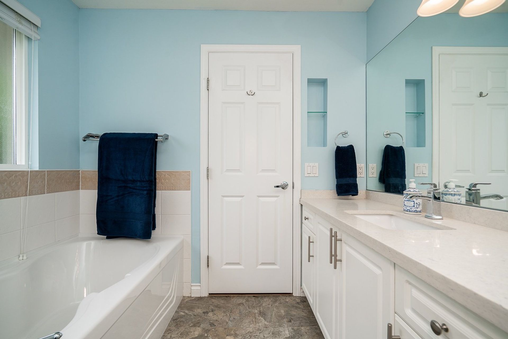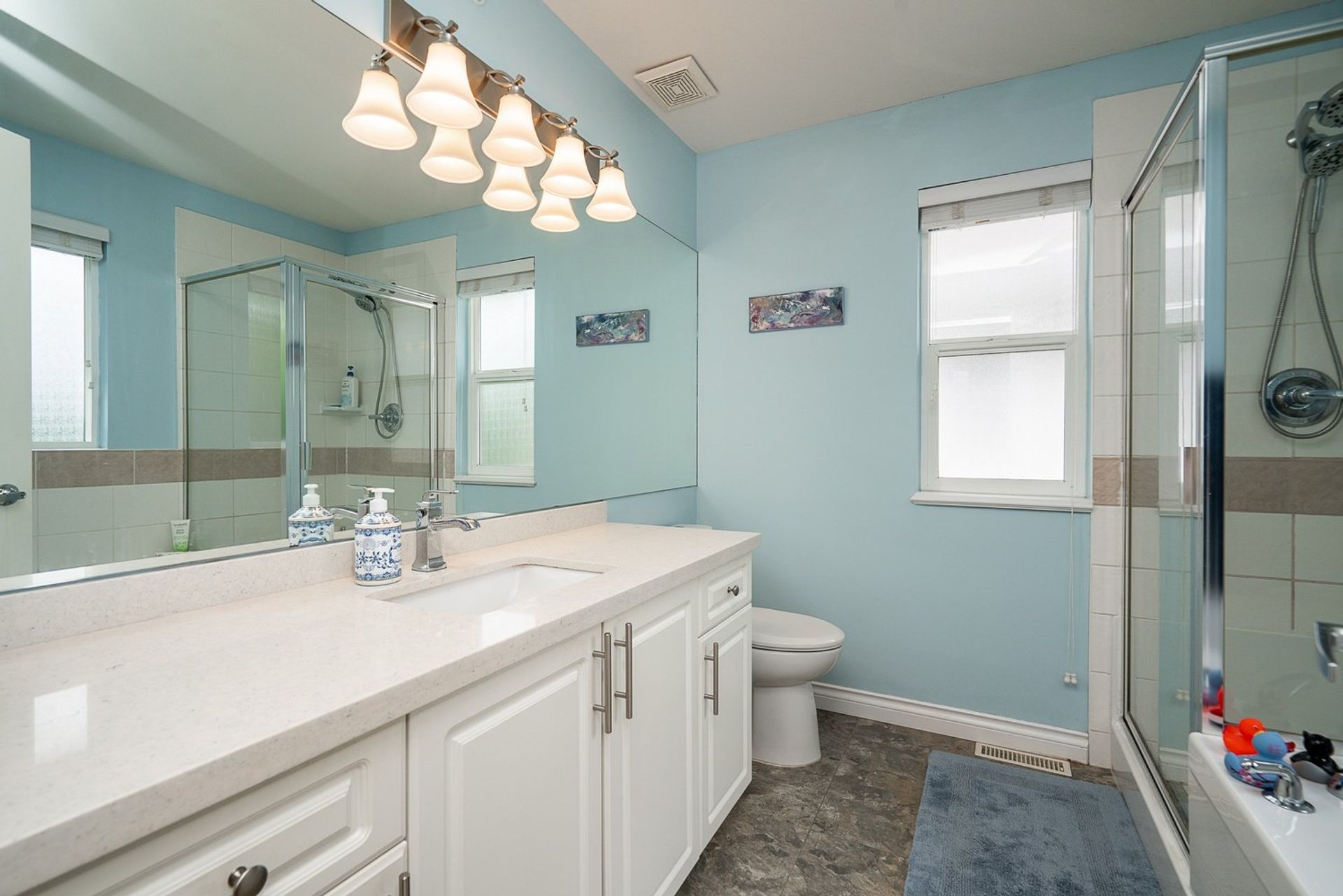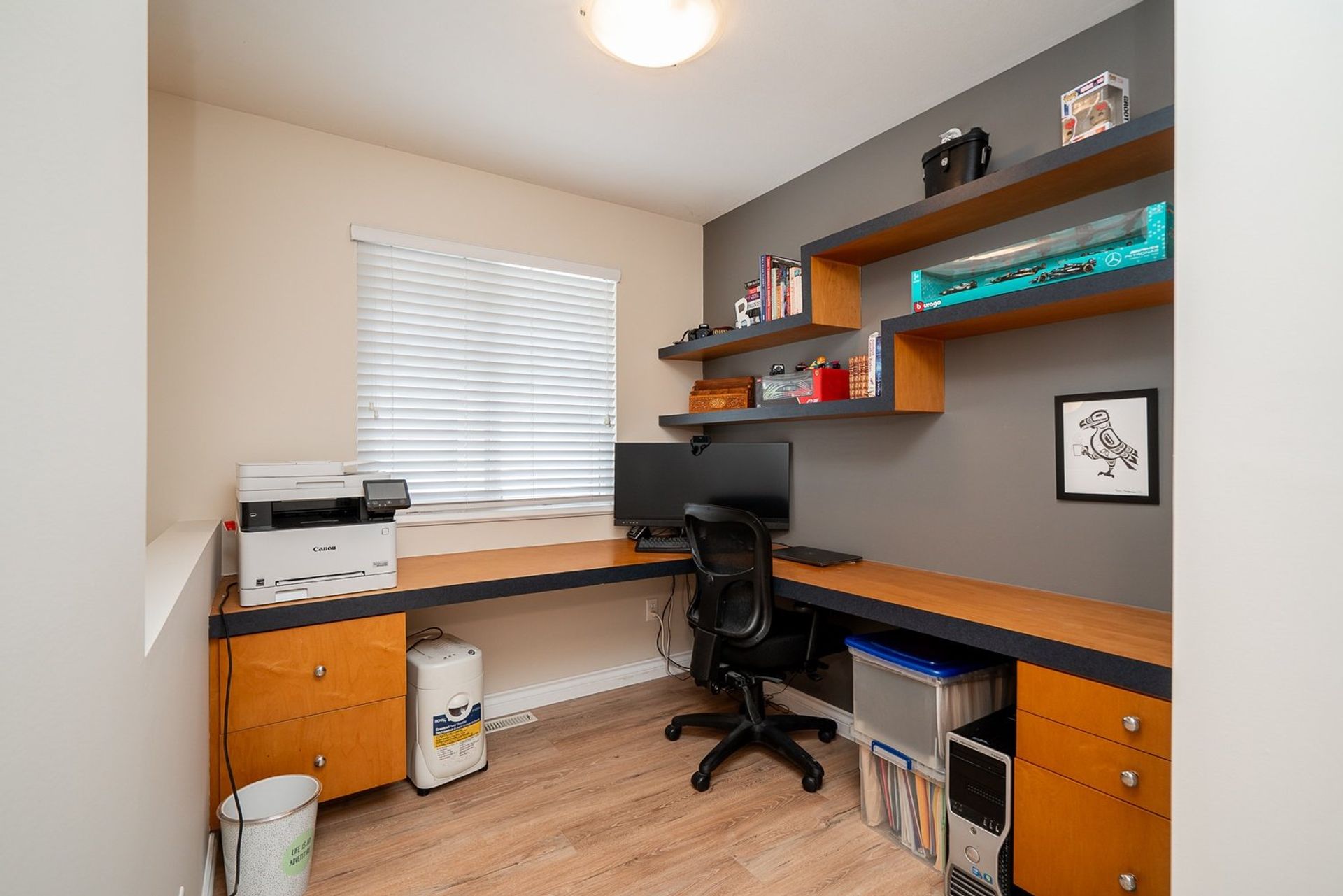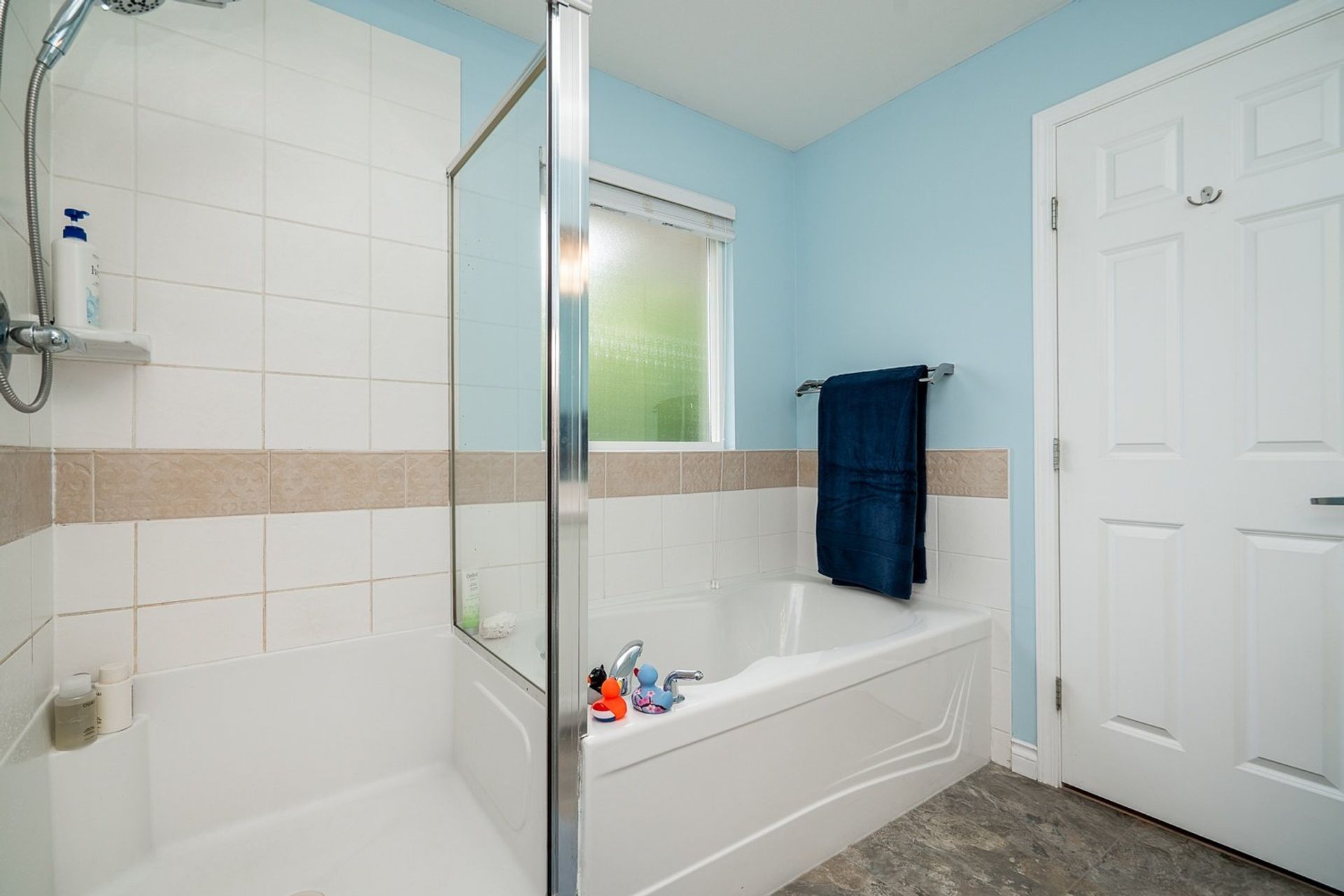 Upstairs, you’ll discover three inviting bedrooms, including a primary suite retreat featuring an airy vaulted ceiling, large windows framing lush greenery, a walk-in closet, and a spa-inspired four-piece ensuite with a separate shower and deep soaker tub. A standout feature of the upper level is the bonus flex area, currently set up as a home office but easily adaptable as a gym, playroom, or reading nook. The fully updated main bathroom offers a custom tiled walk-in shower, and quartz counters. A stacked closeted washer and dryer complete this floor.