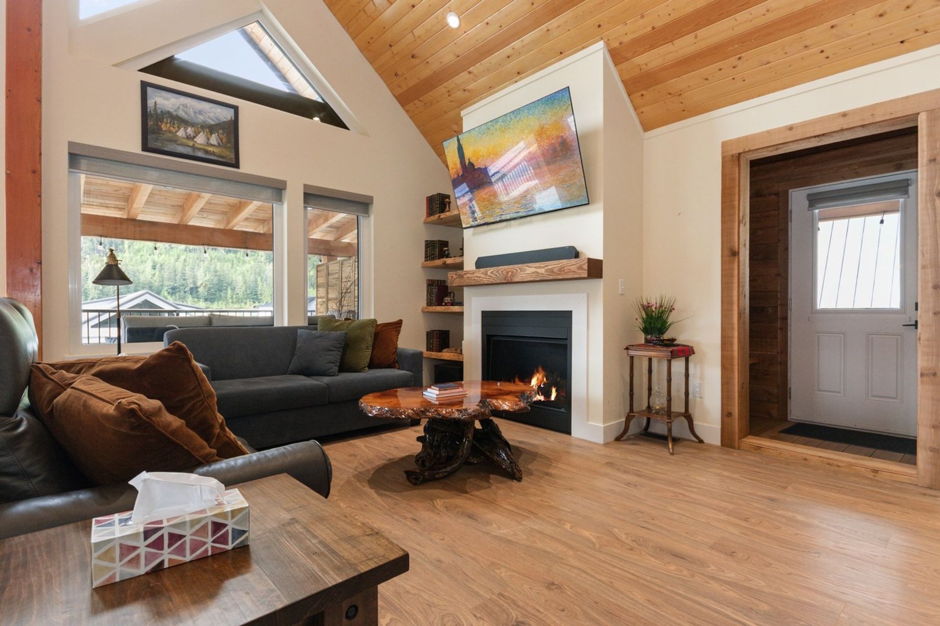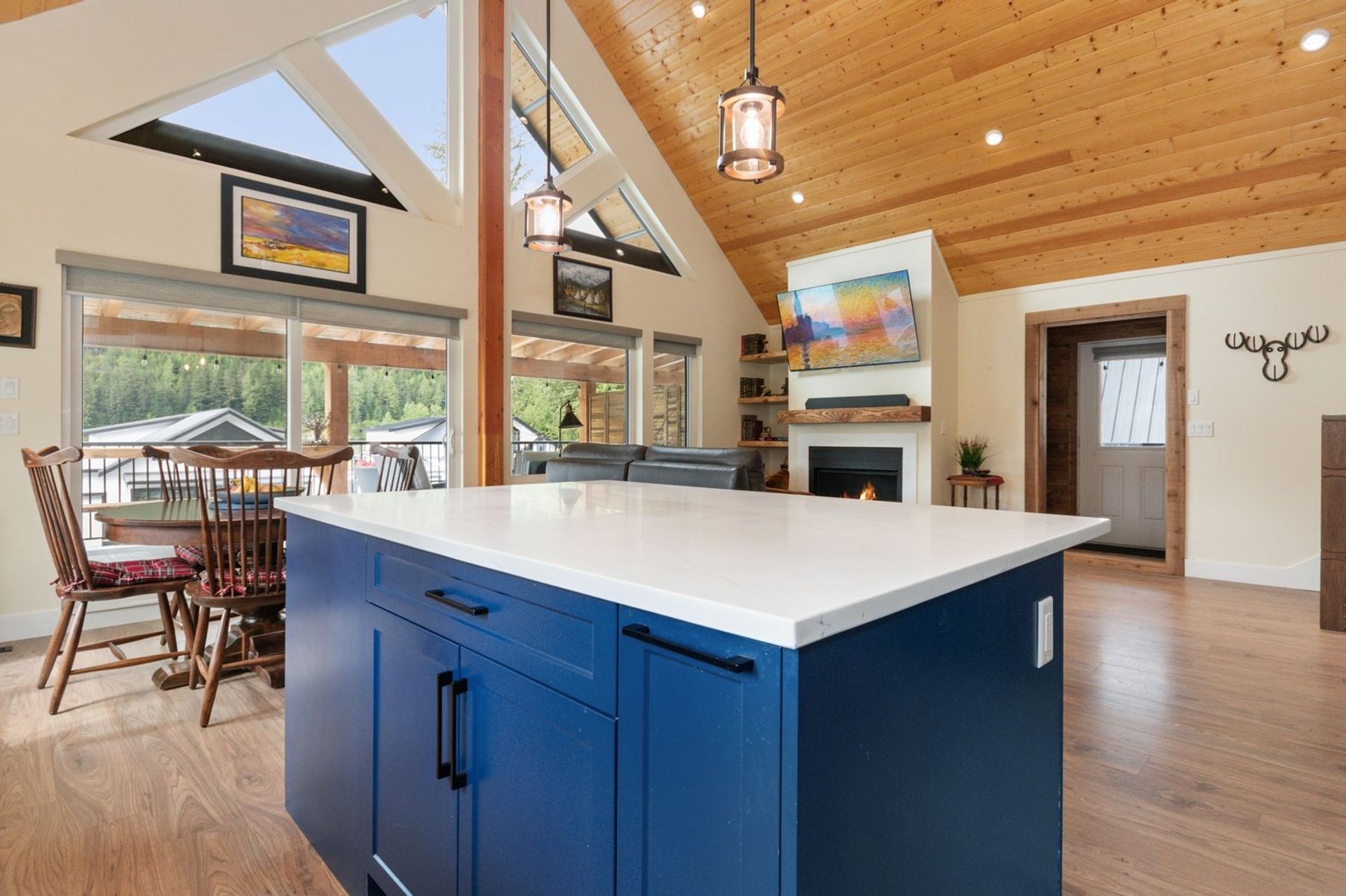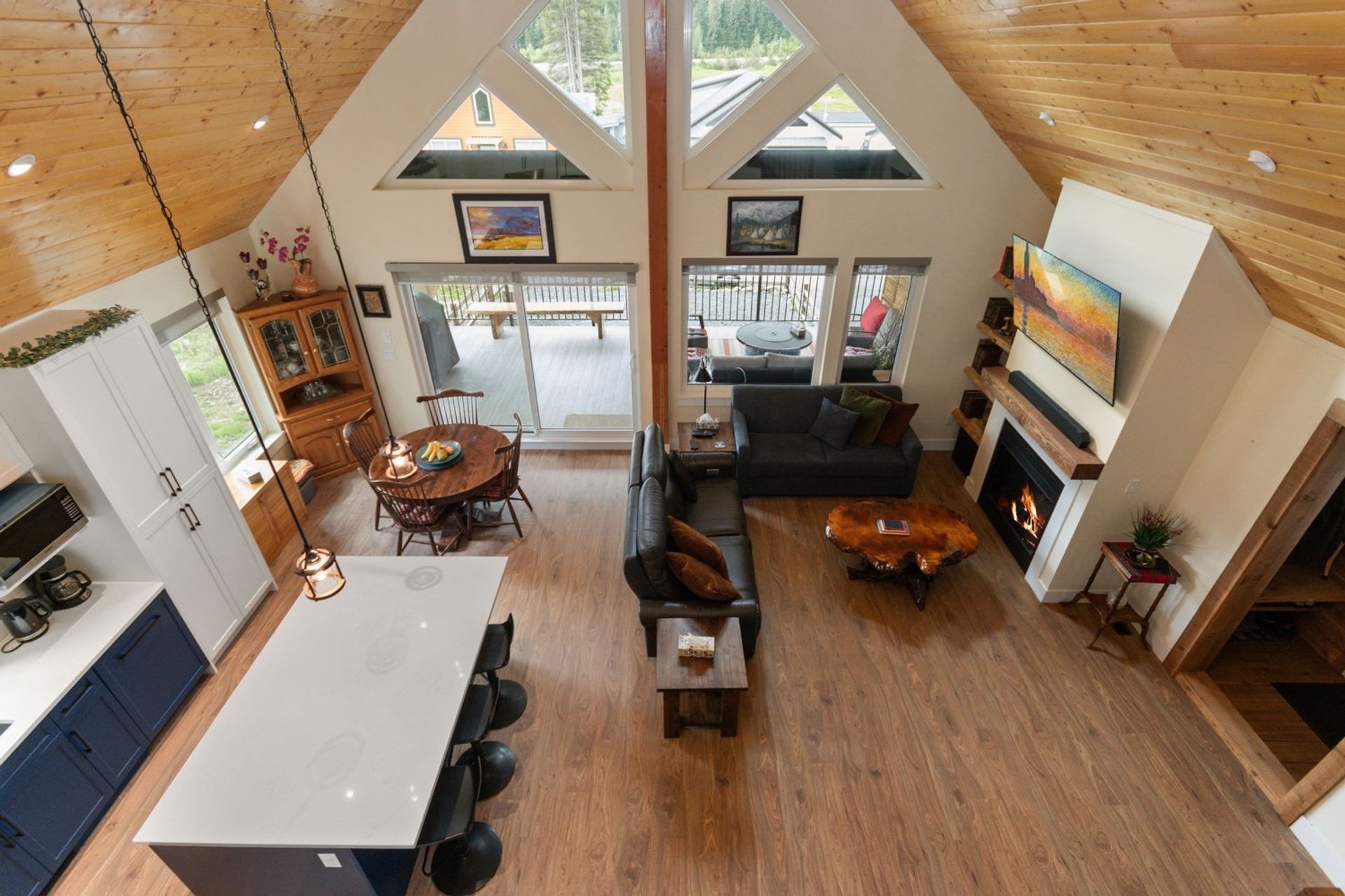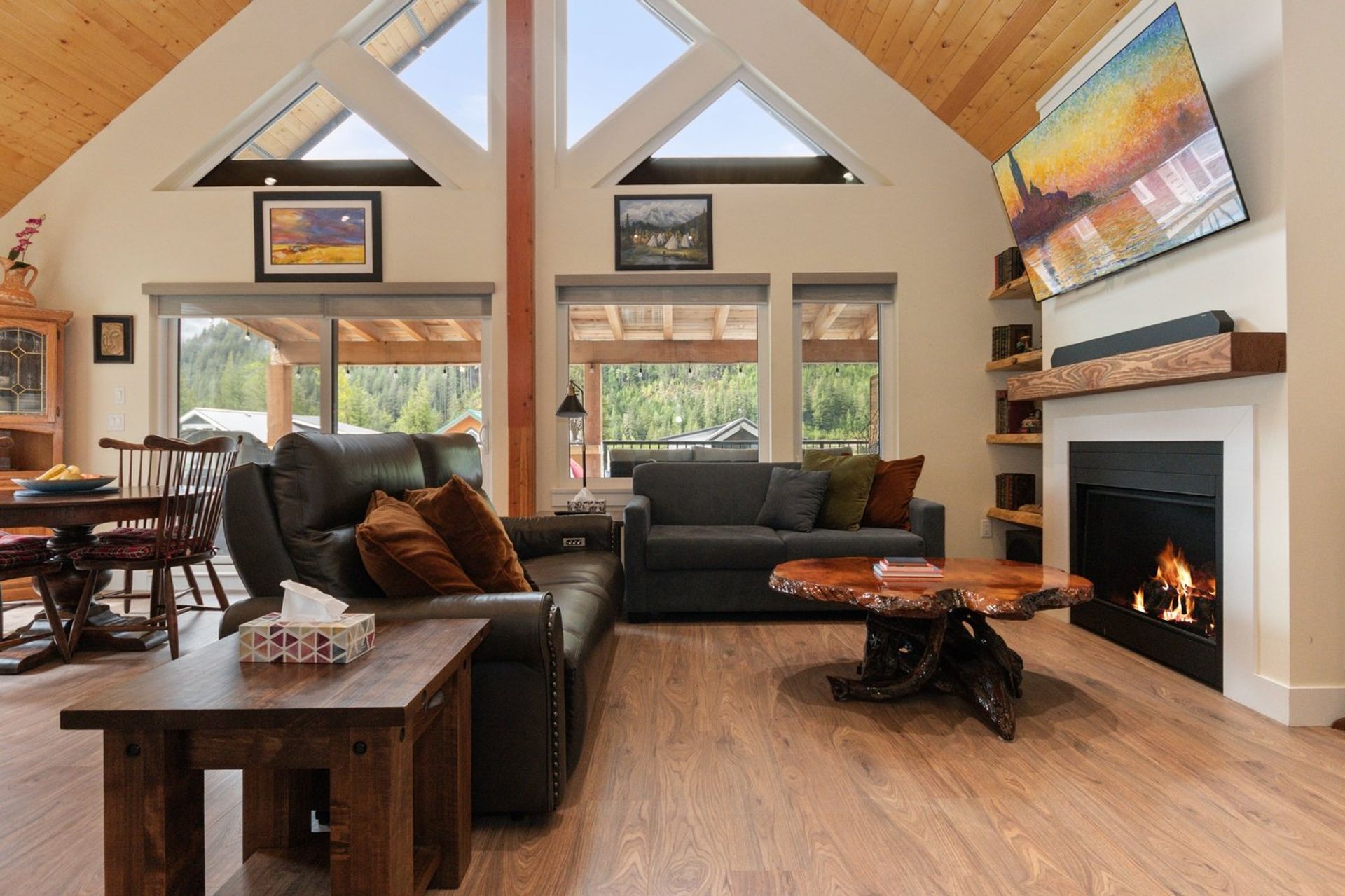 Both the dining and living rooms are sizeable and flush with natural light from substantial windows armed with roller sunshades. The living room has a propane fireplace for ambience and warmth on winter nights, and the dining room has a sliding glass door leading to the expansive 559 sq ft covered deck. The custom deck was completed with premium cedar and provides a breathtaking 180-degree mountain view, fire table and a hot tub—ensuring every night, year-round, ends with a sunset and relaxation.