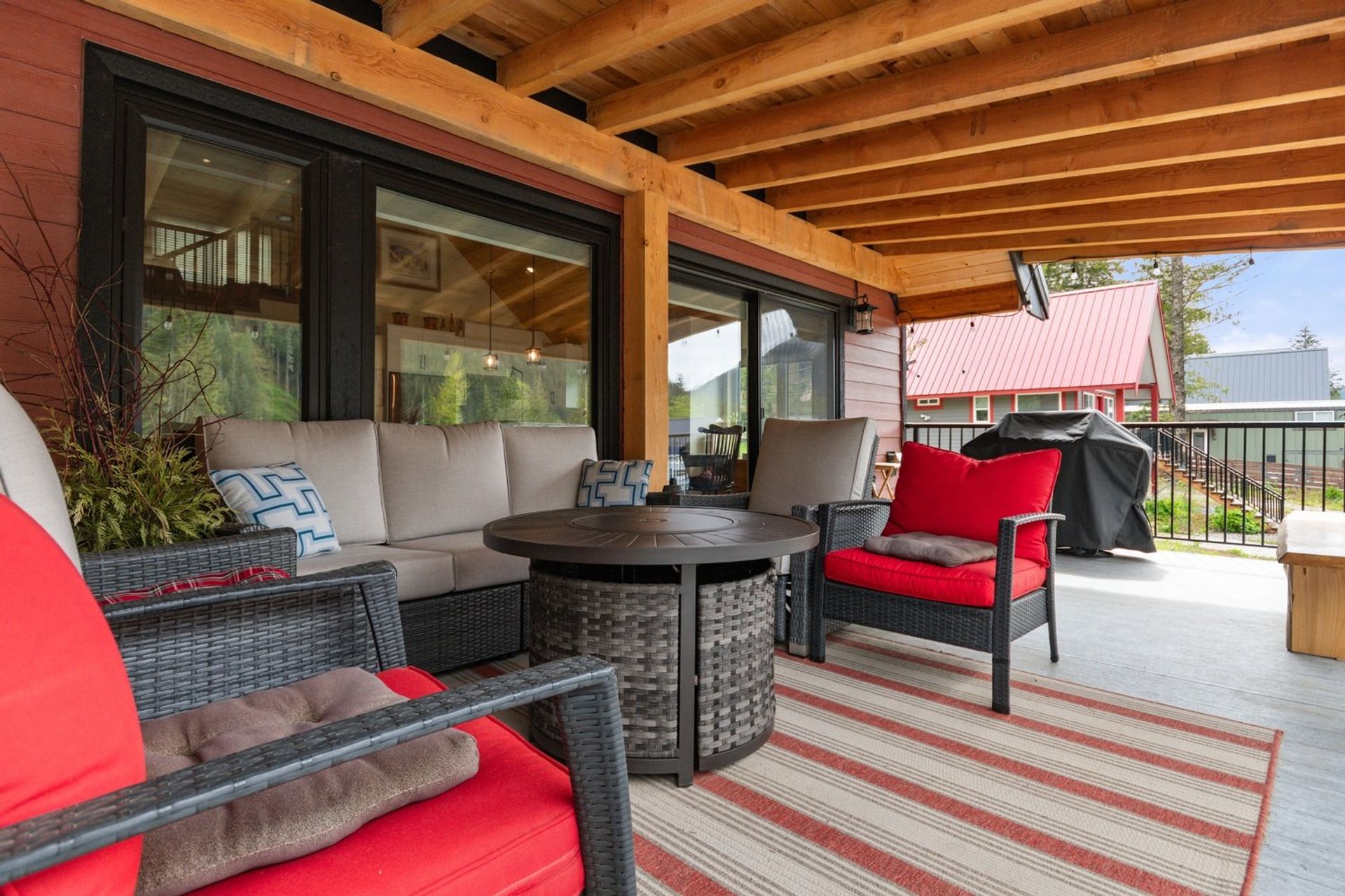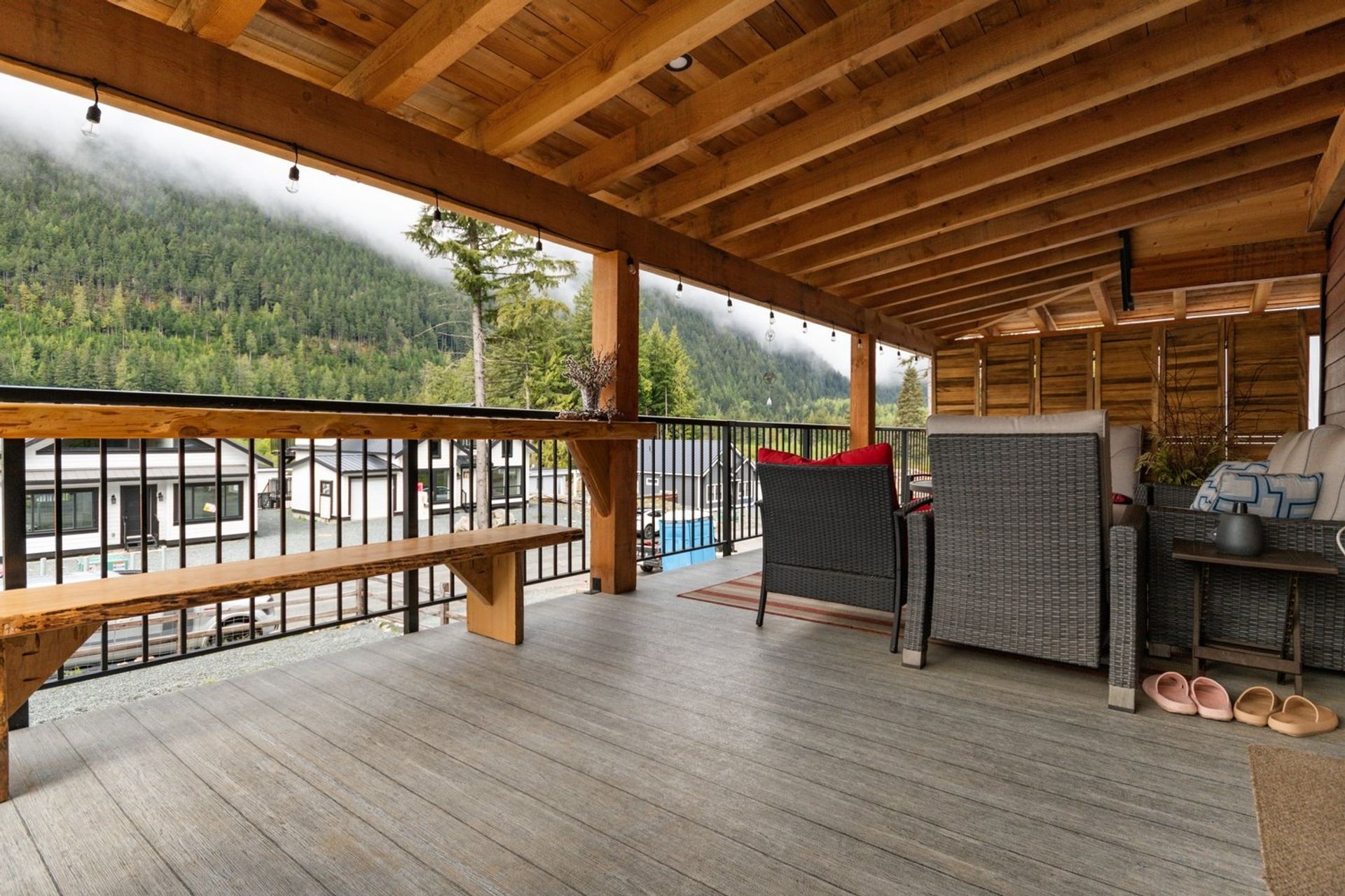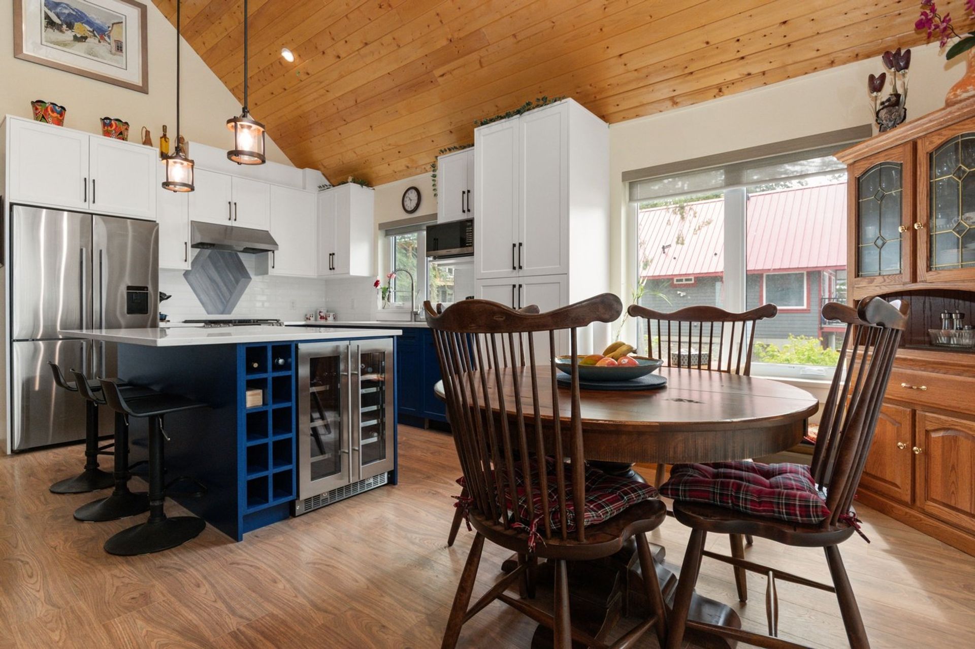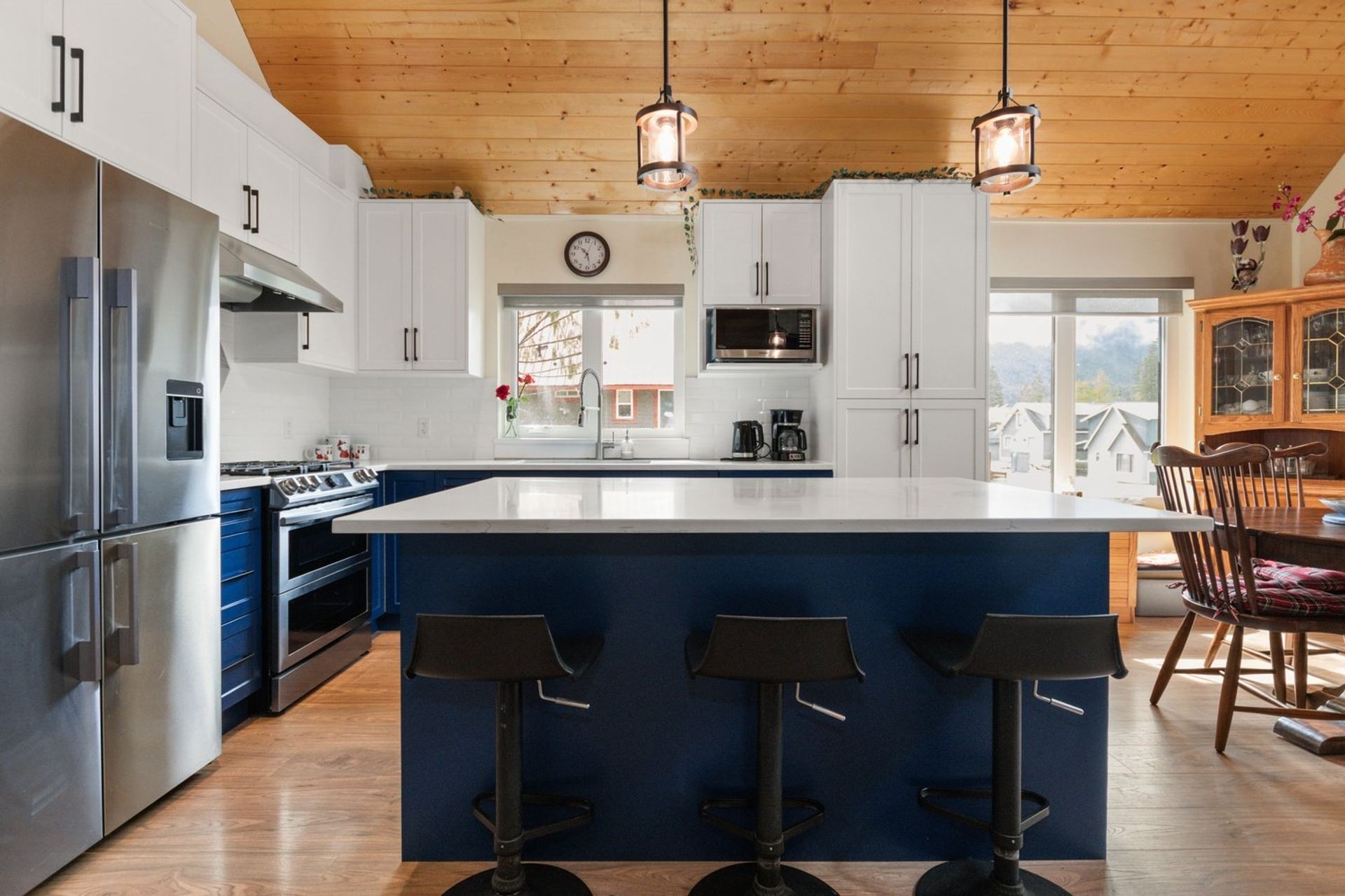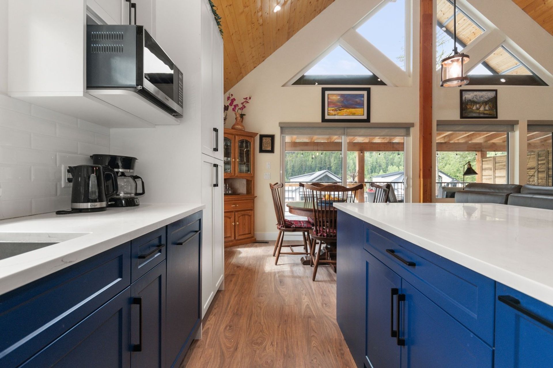 Both the dining and living rooms are sizeable and flush with natural light from substantial windows armed with roller sunshades. The living room has a propane fireplace for ambience and warmth on winter nights, and the dining room has a sliding glass door leading to the expansive 559 sq ft covered deck. The custom deck was completed with premium cedar and provides a breathtaking 180-degree mountain view, fire table and a hot tub—ensuring every night, year-round, ends with a sunset and relaxation.