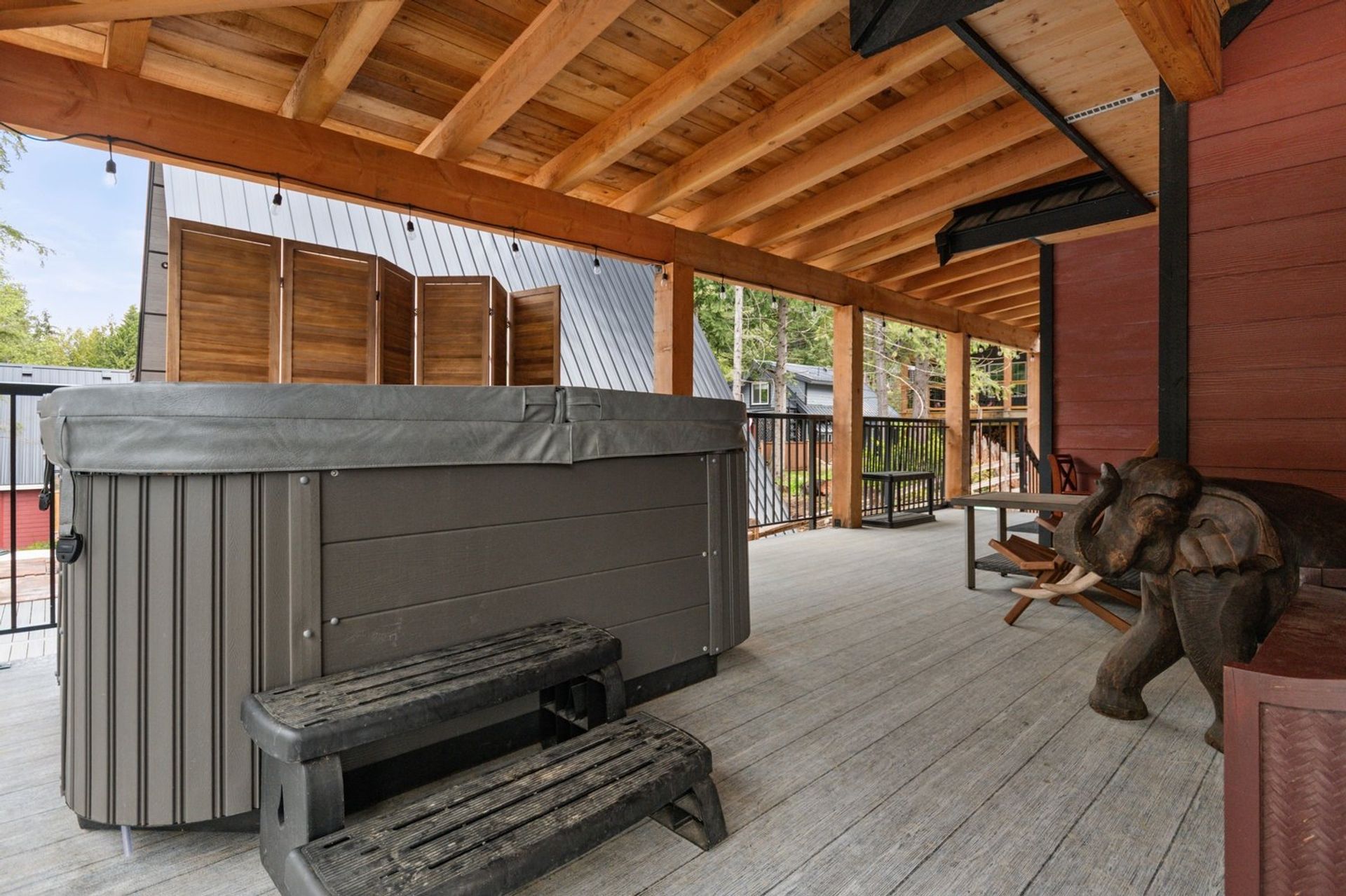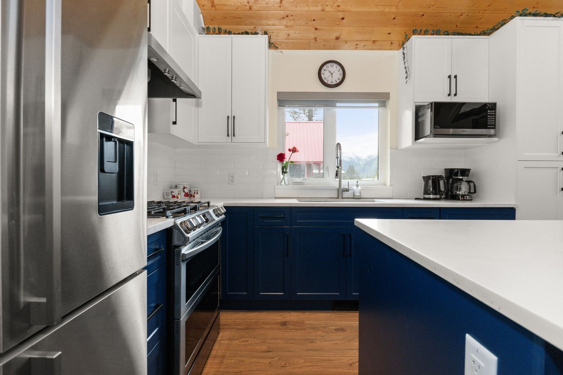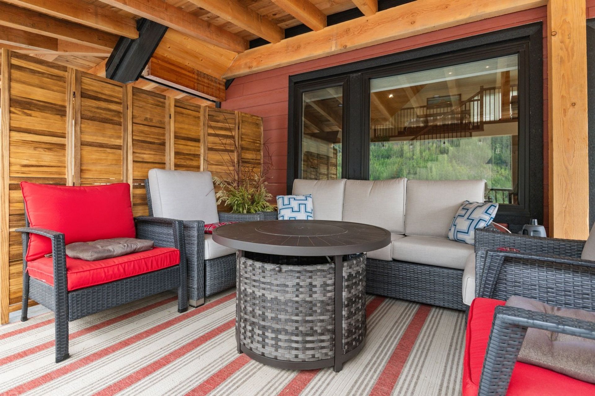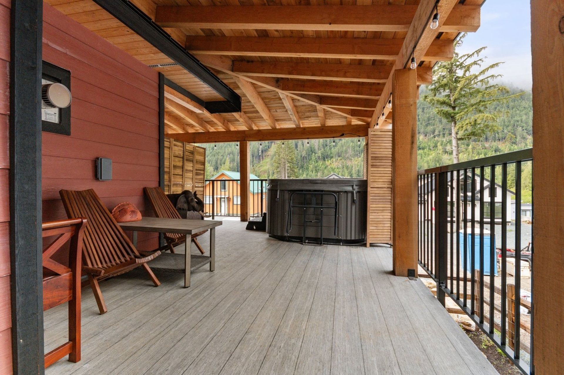Both the dining and living rooms are sizeable and flush with natural light from substantial windows armed with roller sunshades. The living room has a propane fireplace for ambience and warmth on winter nights, and the dining room has a sliding glass door leading to the expansive 559 sq ft covered deck. The custom deck was completed with premium cedar and provides a breathtaking 180-degree mountain view, fire table and a hot tub—ensuring every night, year-round, ends with a sunset and relaxation.