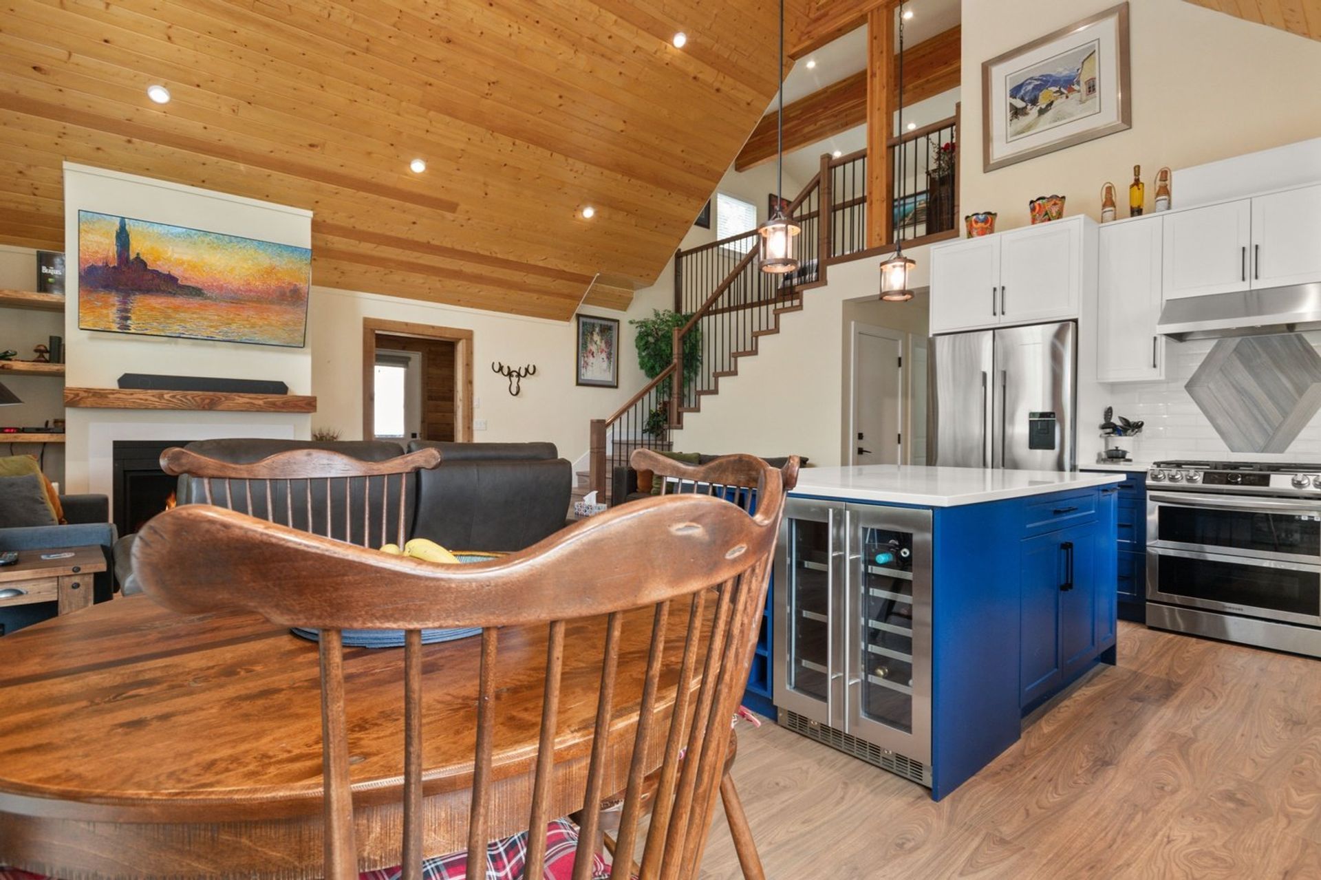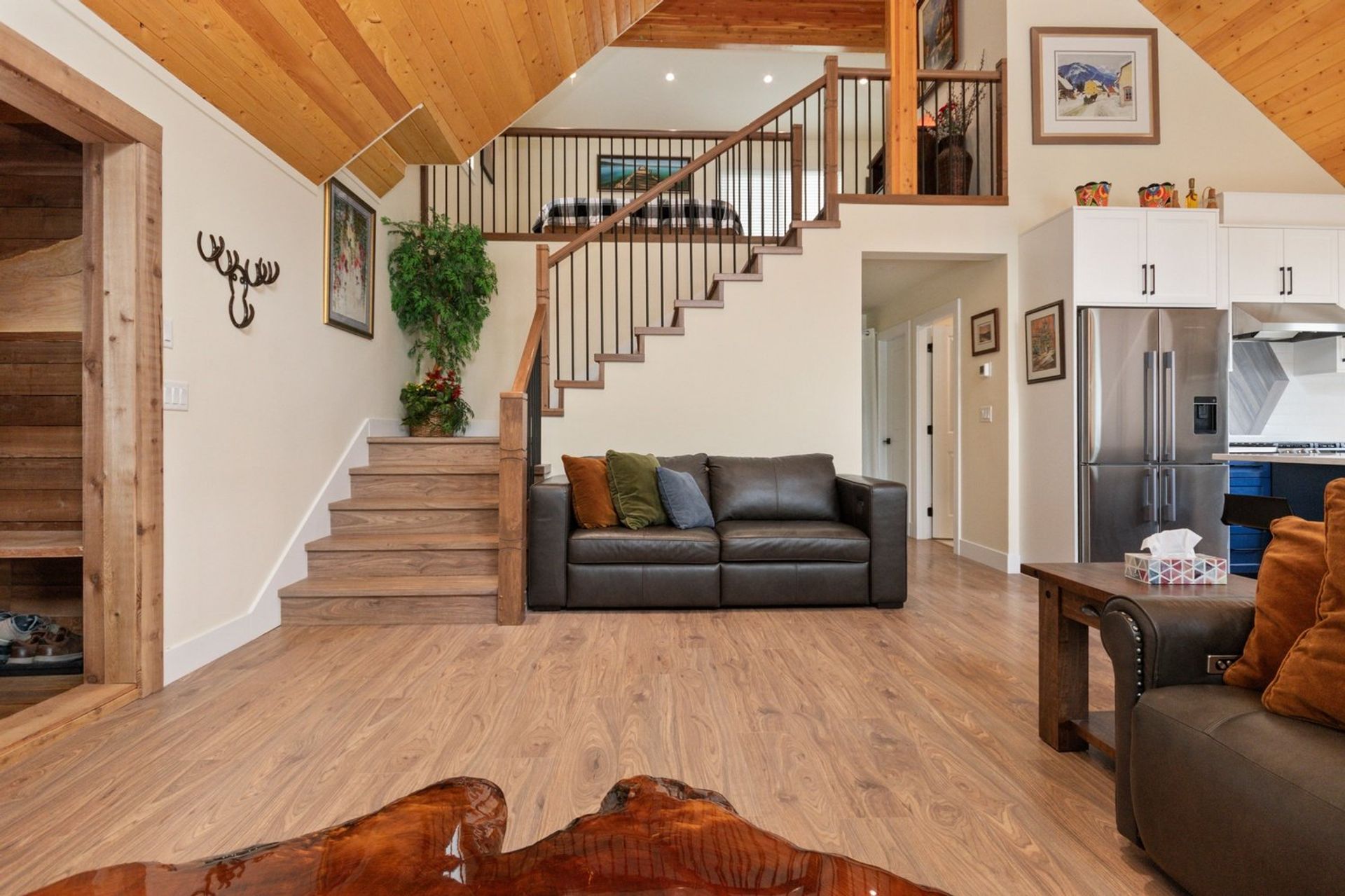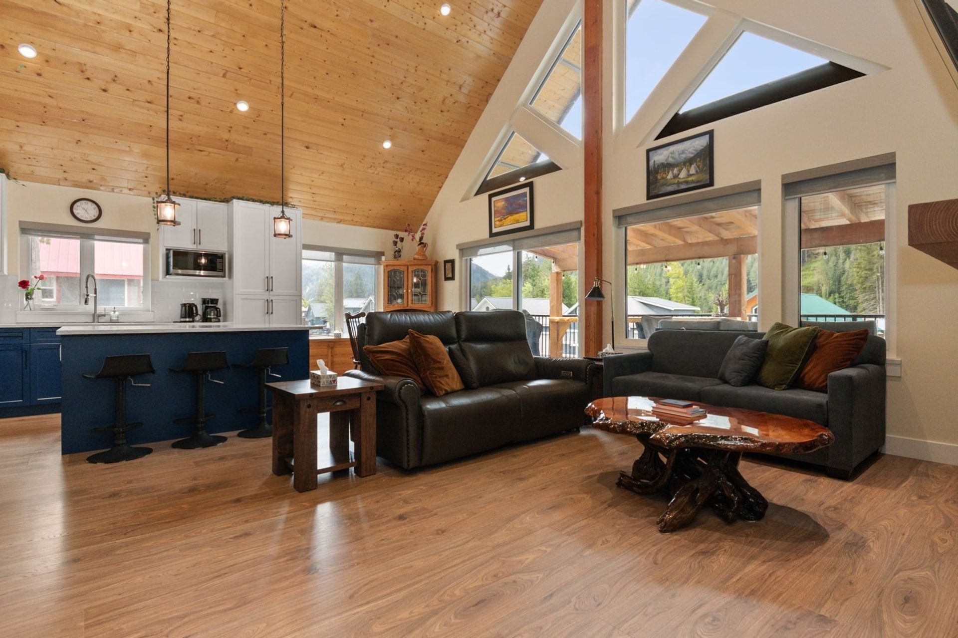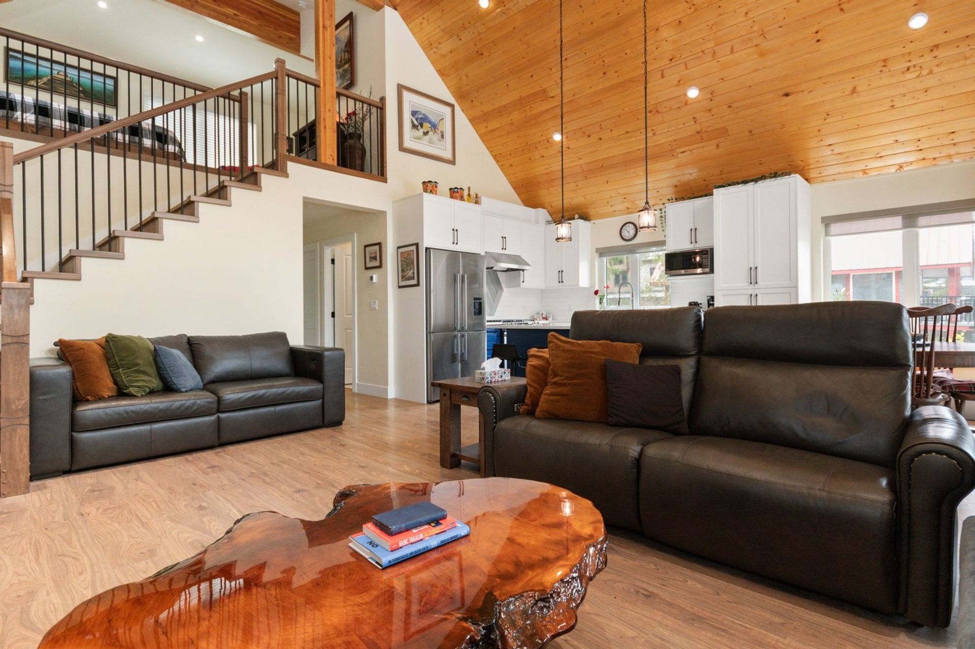 The home is less than two years old, and every premium finish still shines like new. An open concept living area with soaring vaulted ceiling, angled pot lights and huge windows includes a kitchen, dining room, and living room; it is the focal point of this breathtaking cabin inspired home.