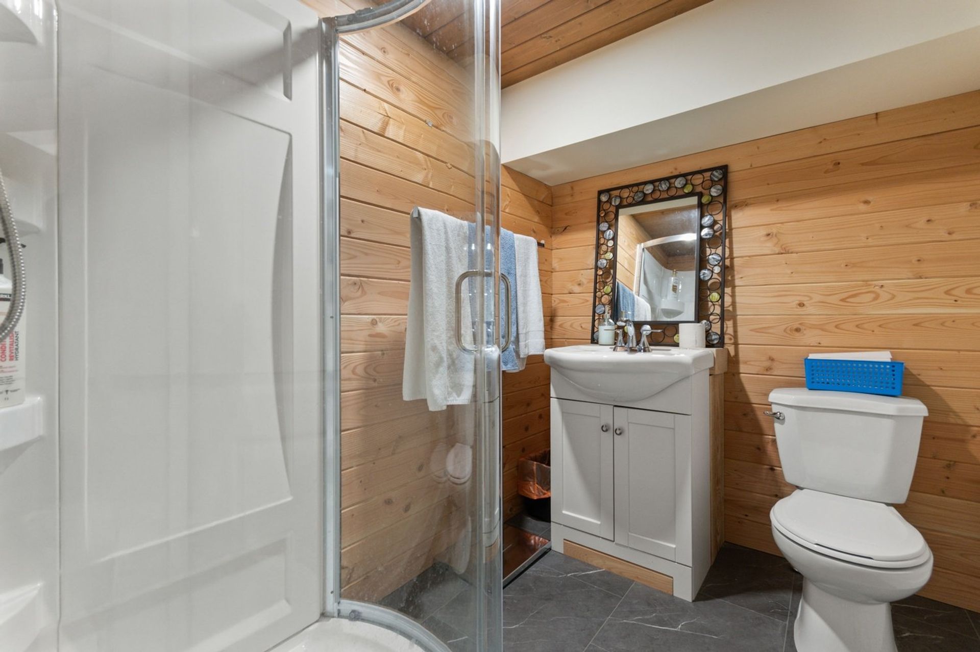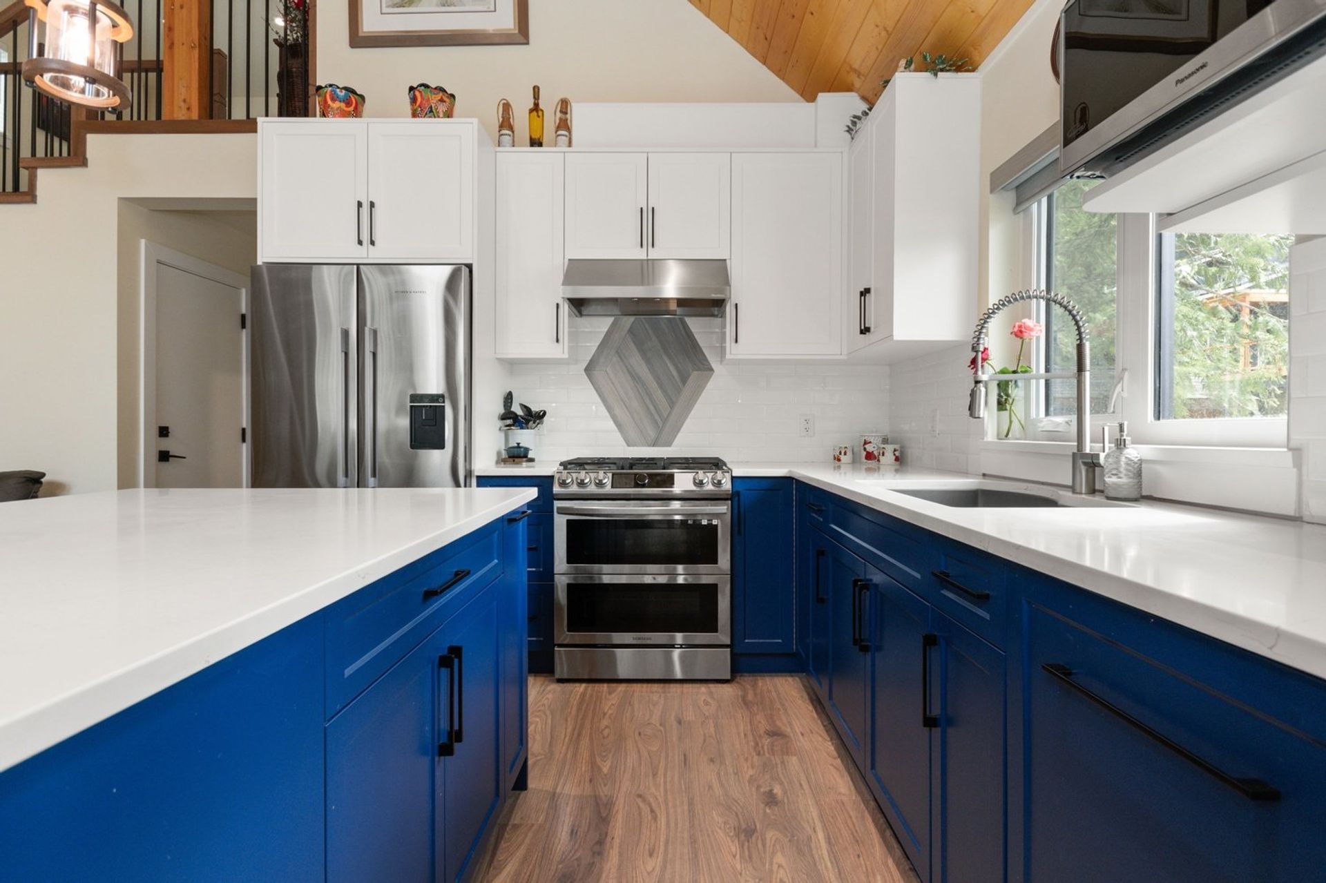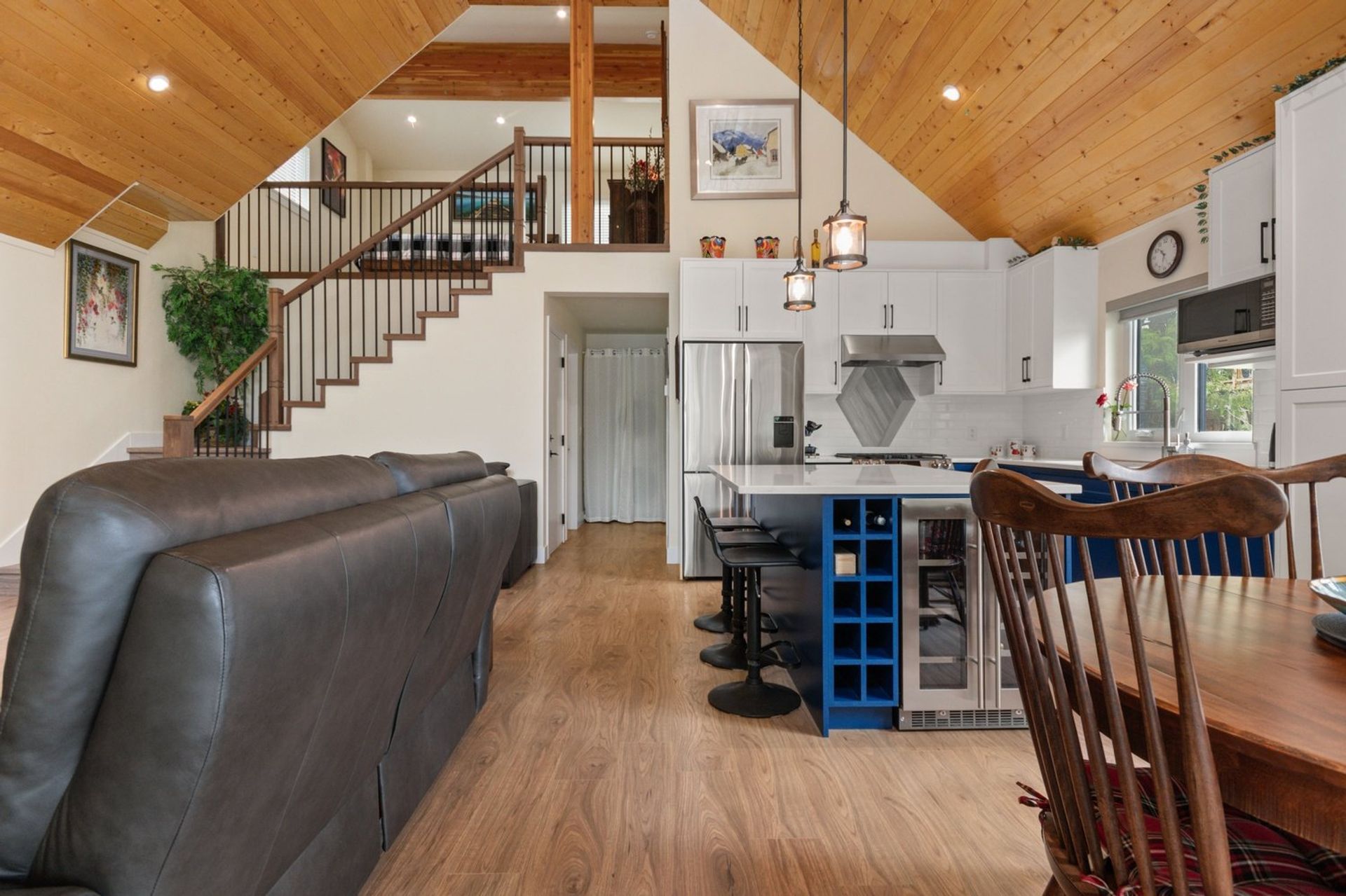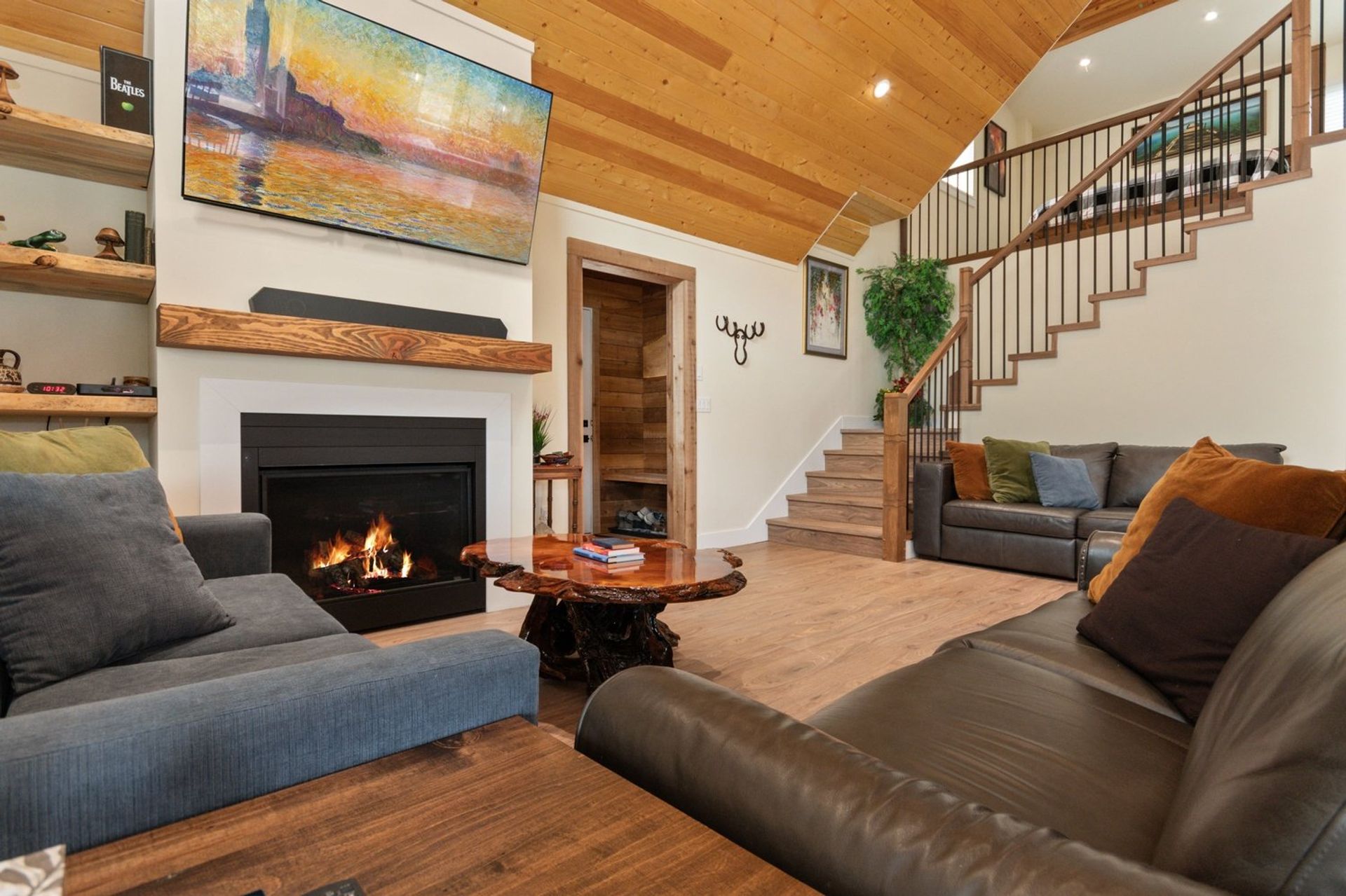 The home is less than two years old, and every premium finish still shines like new. An open concept living area with soaring vaulted ceiling, angled pot lights and huge windows includes a kitchen, dining room, and living room; it is the focal point of this breathtaking cabin inspired home.