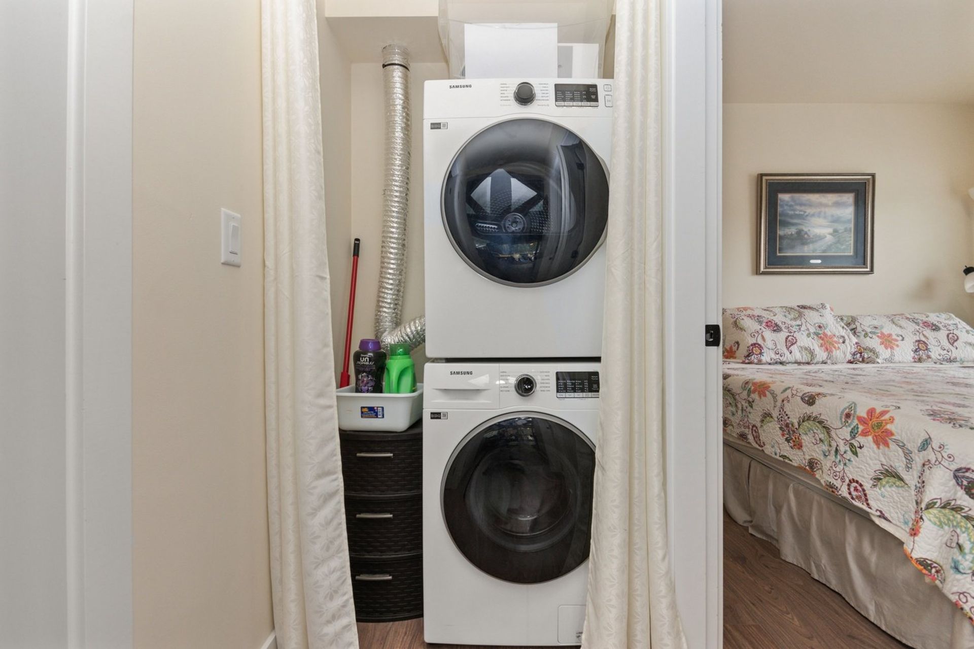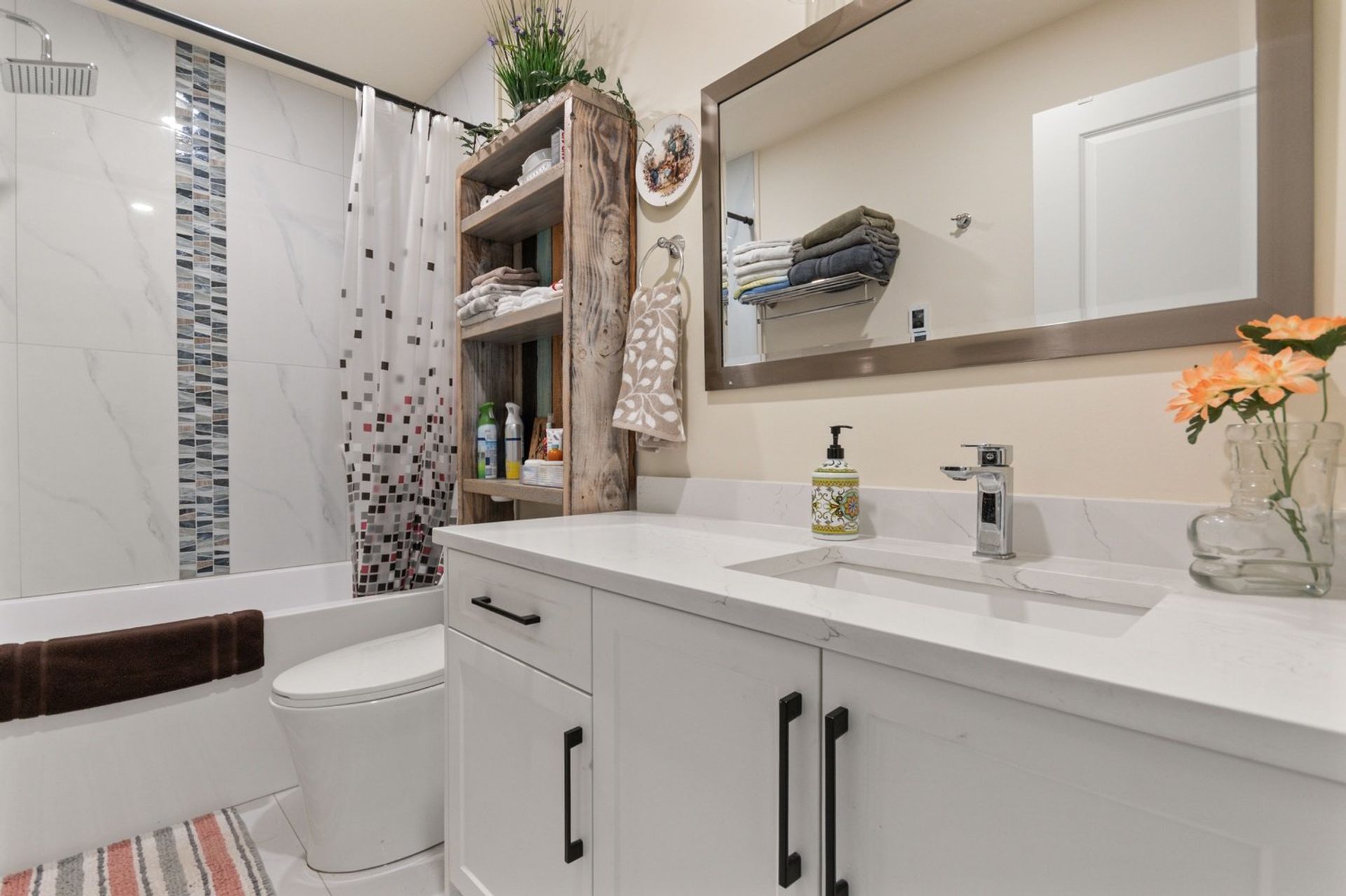 The remainder of the main floor includes, two bedrooms, a stacked closeted washer & dryer, and deluxe four-piece main bath with subway tiling including accents, quartz counters, and a deep soaker tub.